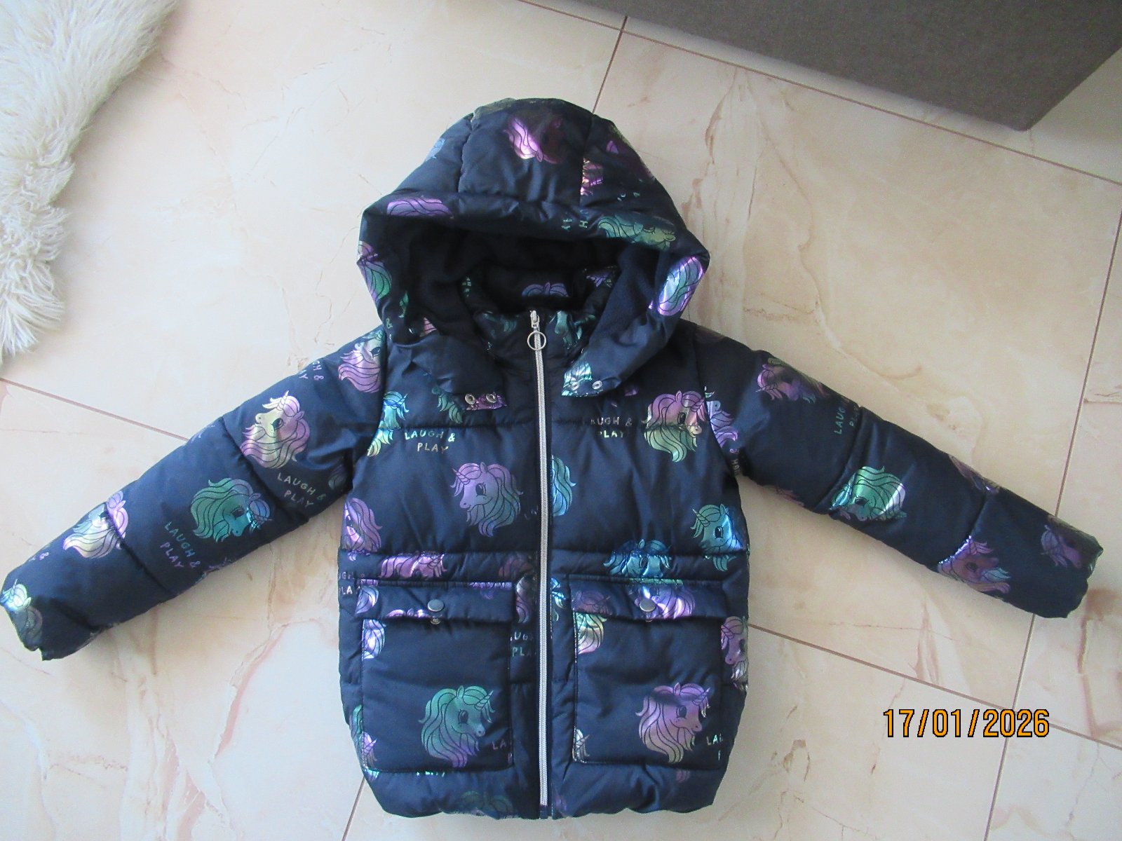 1x oblečená zimná vetrovka,je veľmi ľahká, dcéra nestihla vynosiť.Zips sa dá zapnúť až celkom hore ku krku,je tam patent,aby neškriabal,kapucňa je zvnútra sýto ružová , má všitú gumičku,aby prilieh...