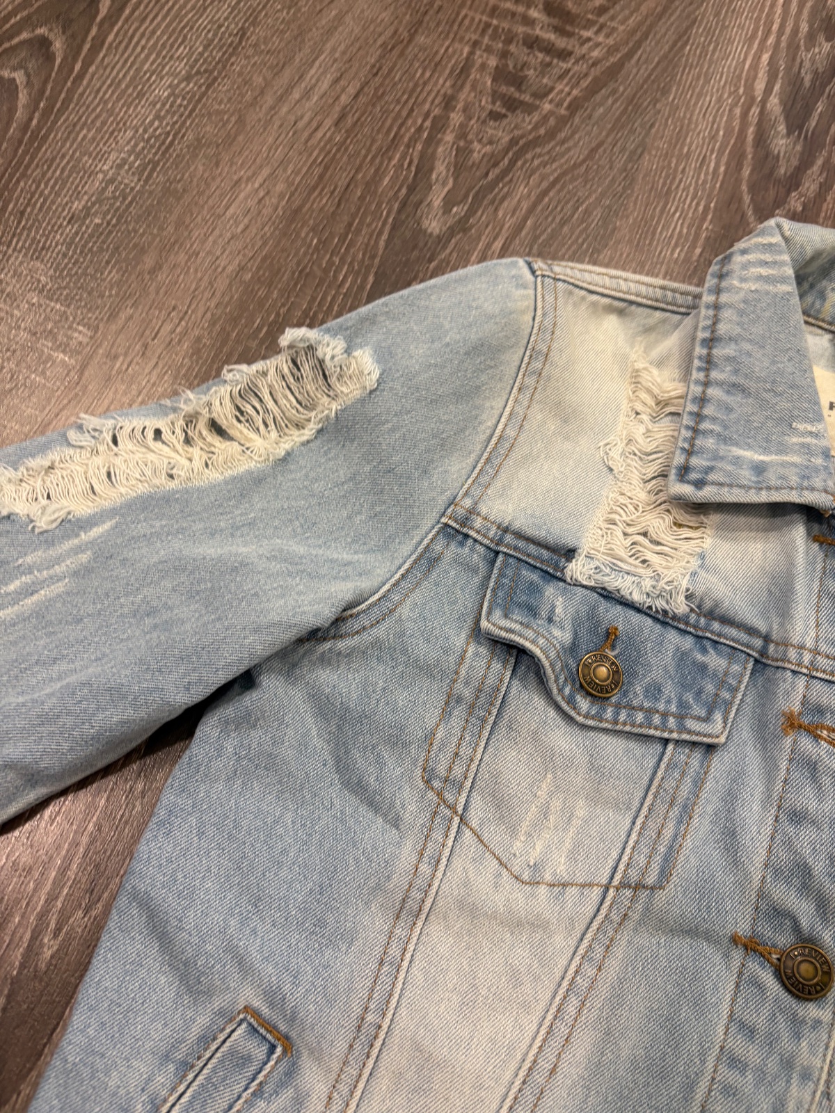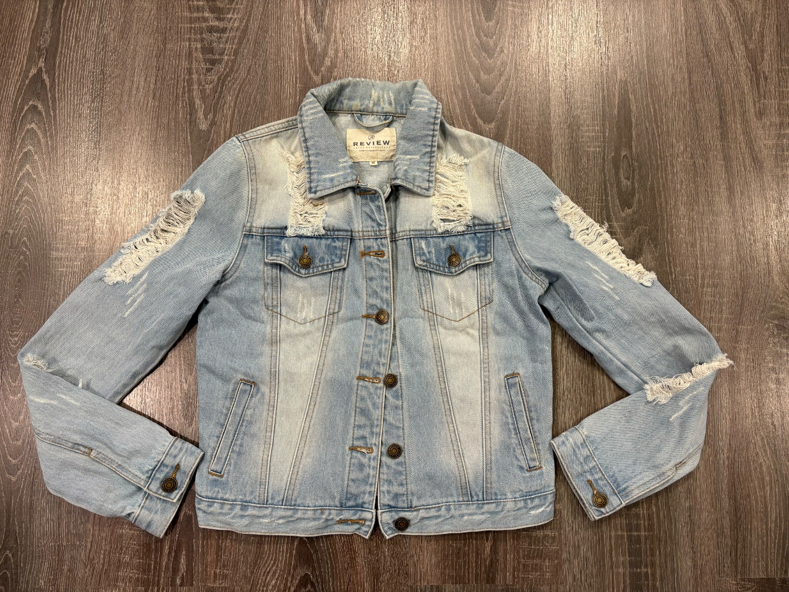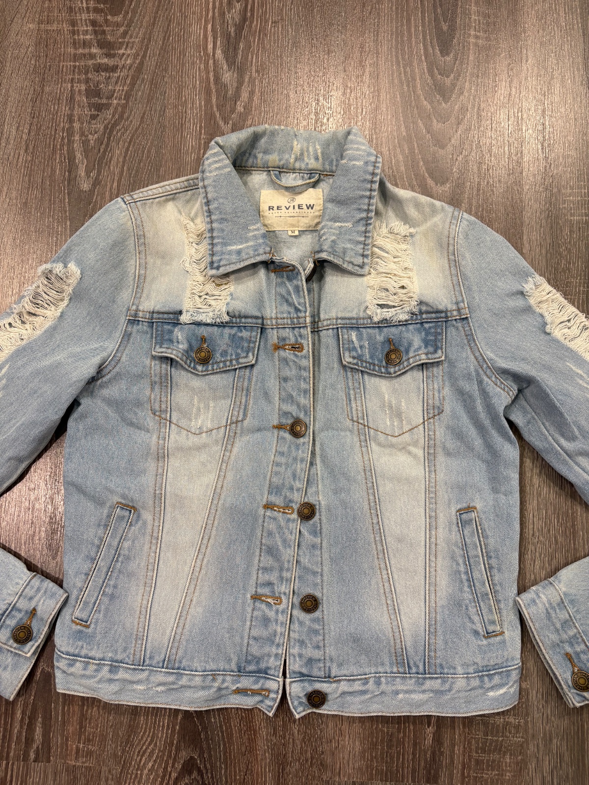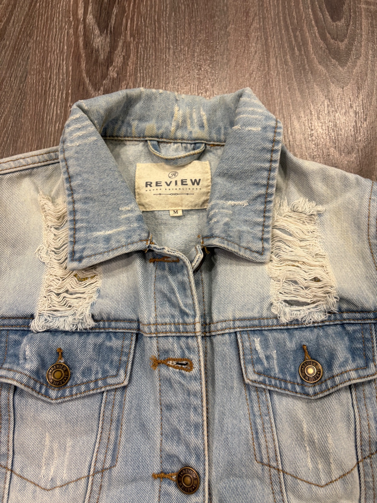 03.Review damska riflova bunda,potrhany dizajn, velkost M.Fakt krasna.Dlzka je 54cm,dlzka rukava od krku je 75cm a sirka v podpazusi je 46x2cm