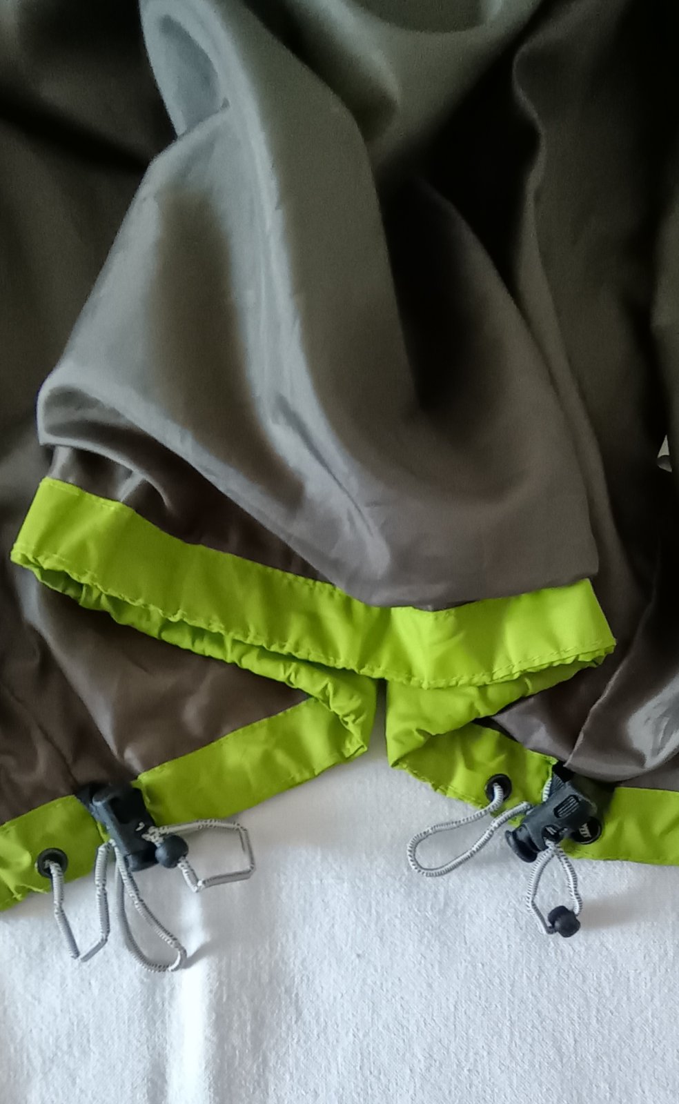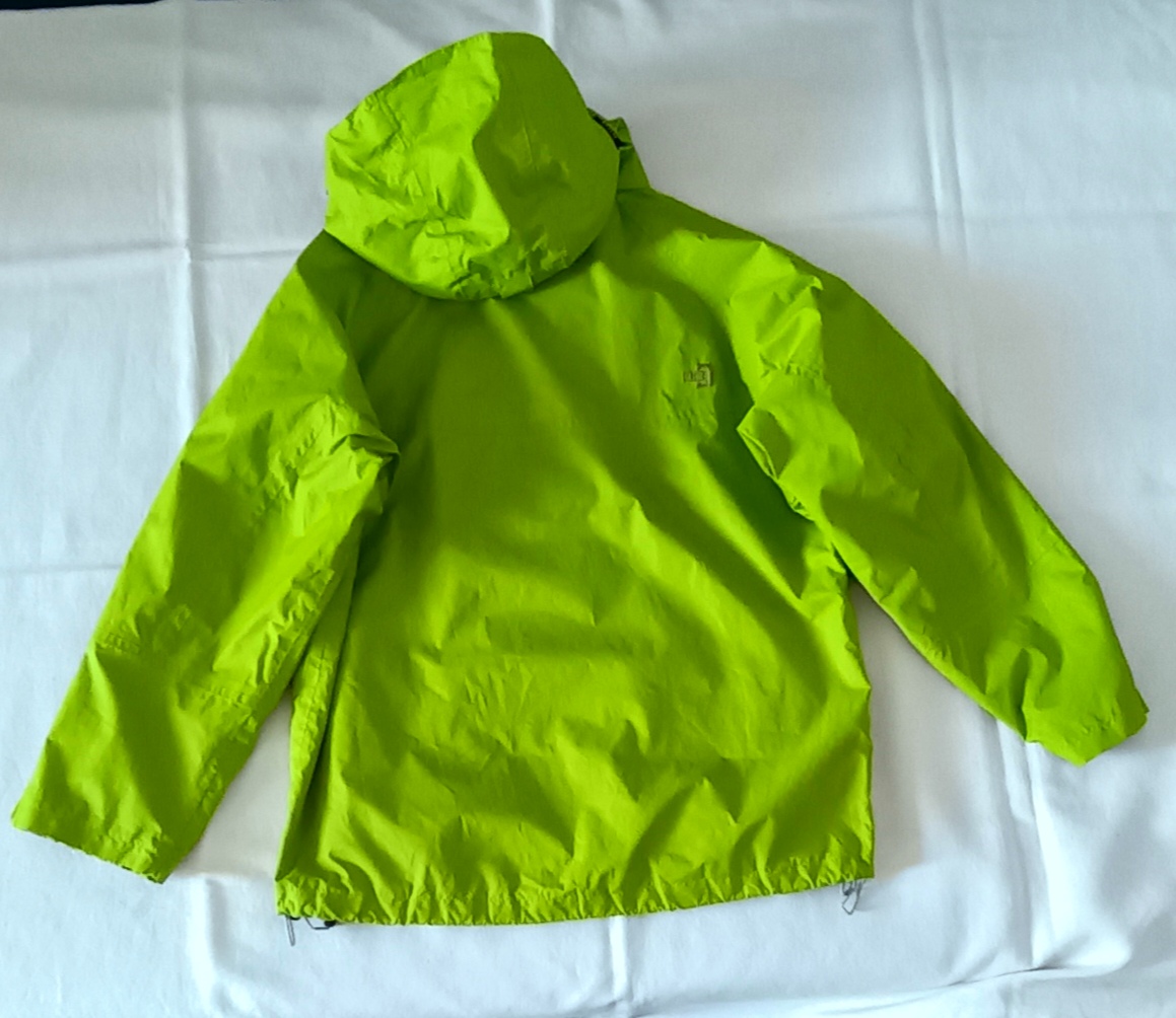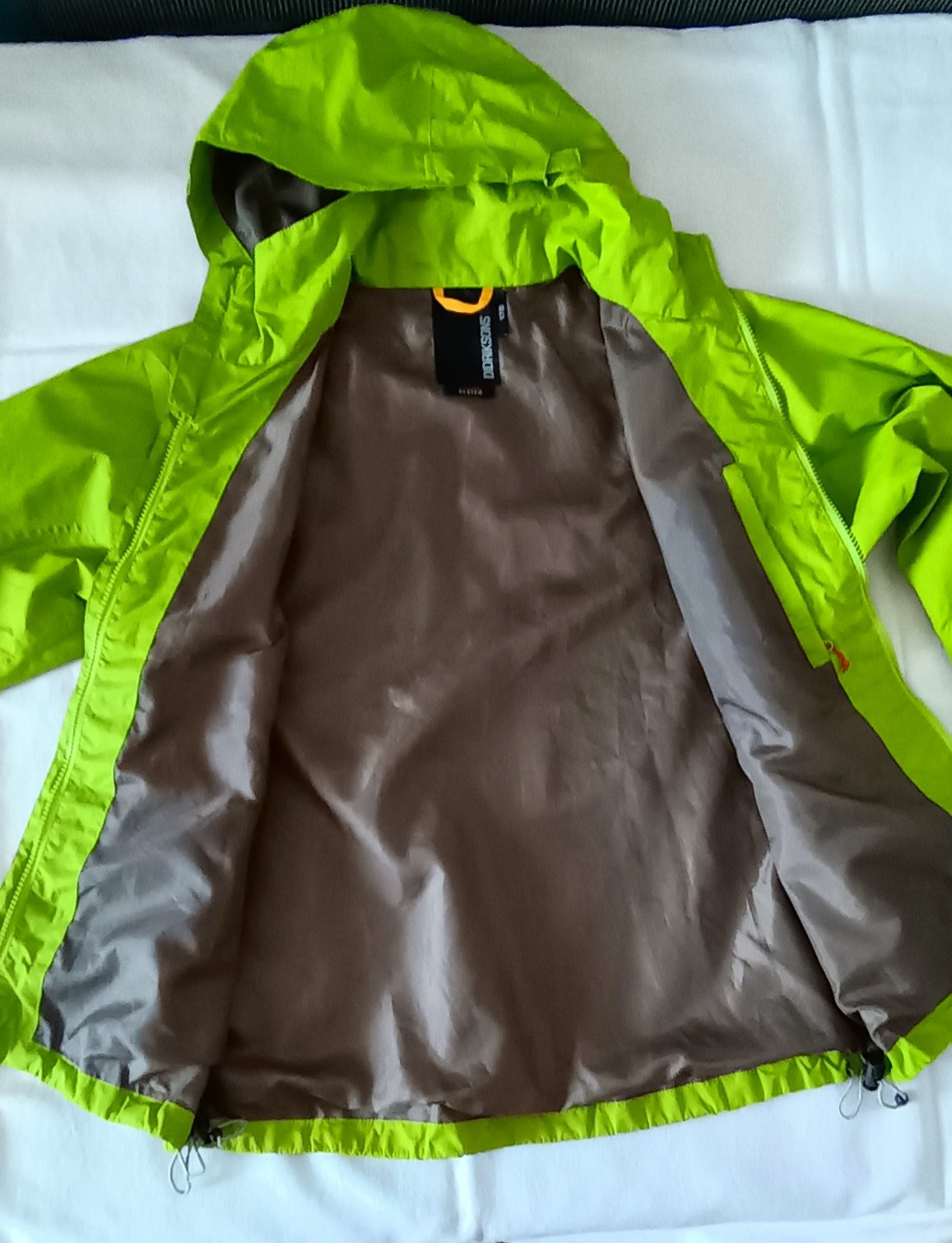 Jemne neónová, vode a vetru odolná " STORM SYSTEM", podlepené švy, kryté zapínanie, úprava odnímateľnej kapucne, spodku a rukávov, podšitá bez zateplenia, 100% polyester, logá vyšité, super stav iba spodné gumičky sú trochu prelomené ale funkčné, zohľadnené v cene.