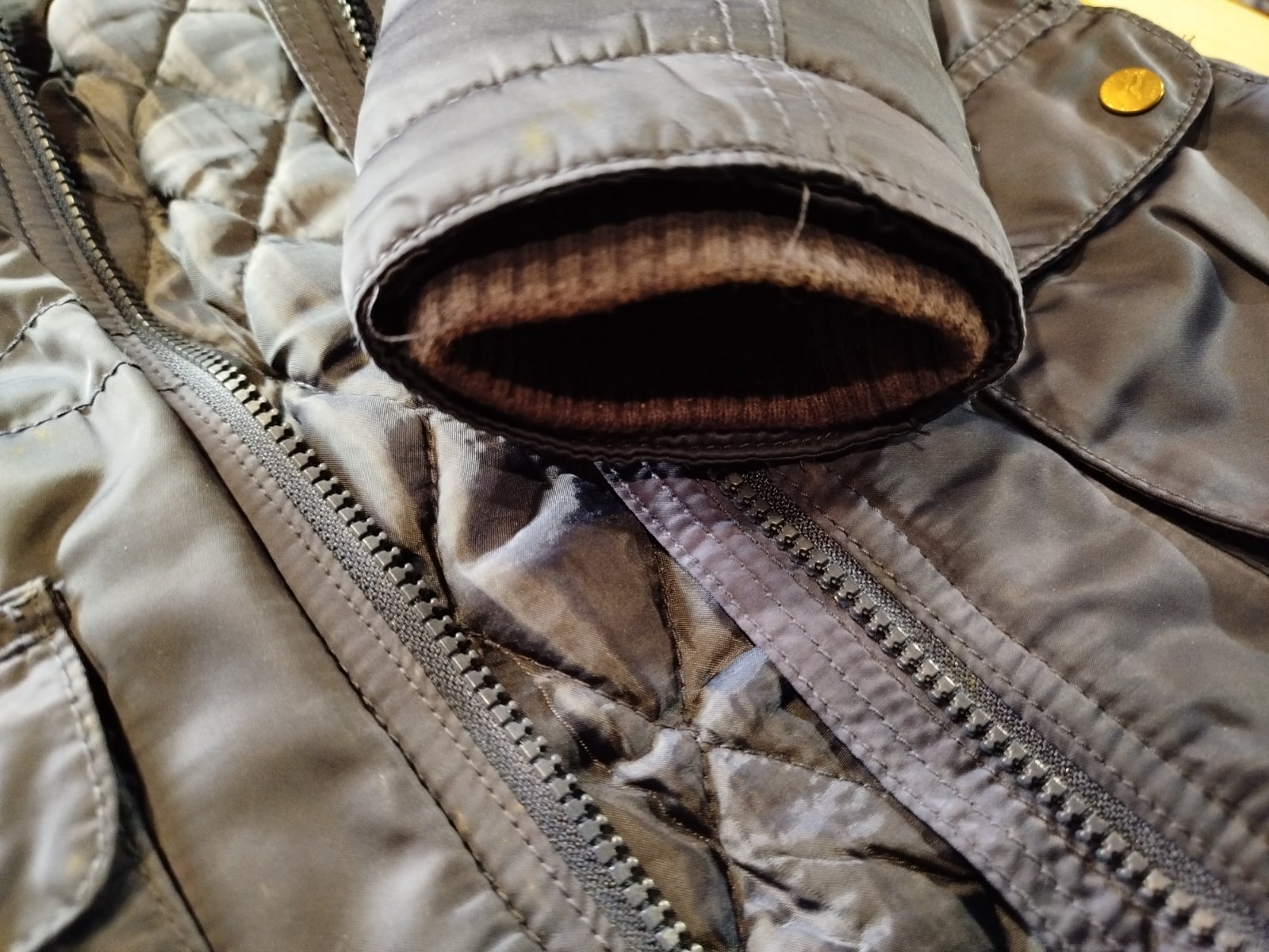 Presivana vatovana bunda, veľkosť je 122 ale realne je trochu menšia. Vnutorna vata je kvoli praniu trochu zdrcnuta a na rukave su slabucke flaky inak dobry stav