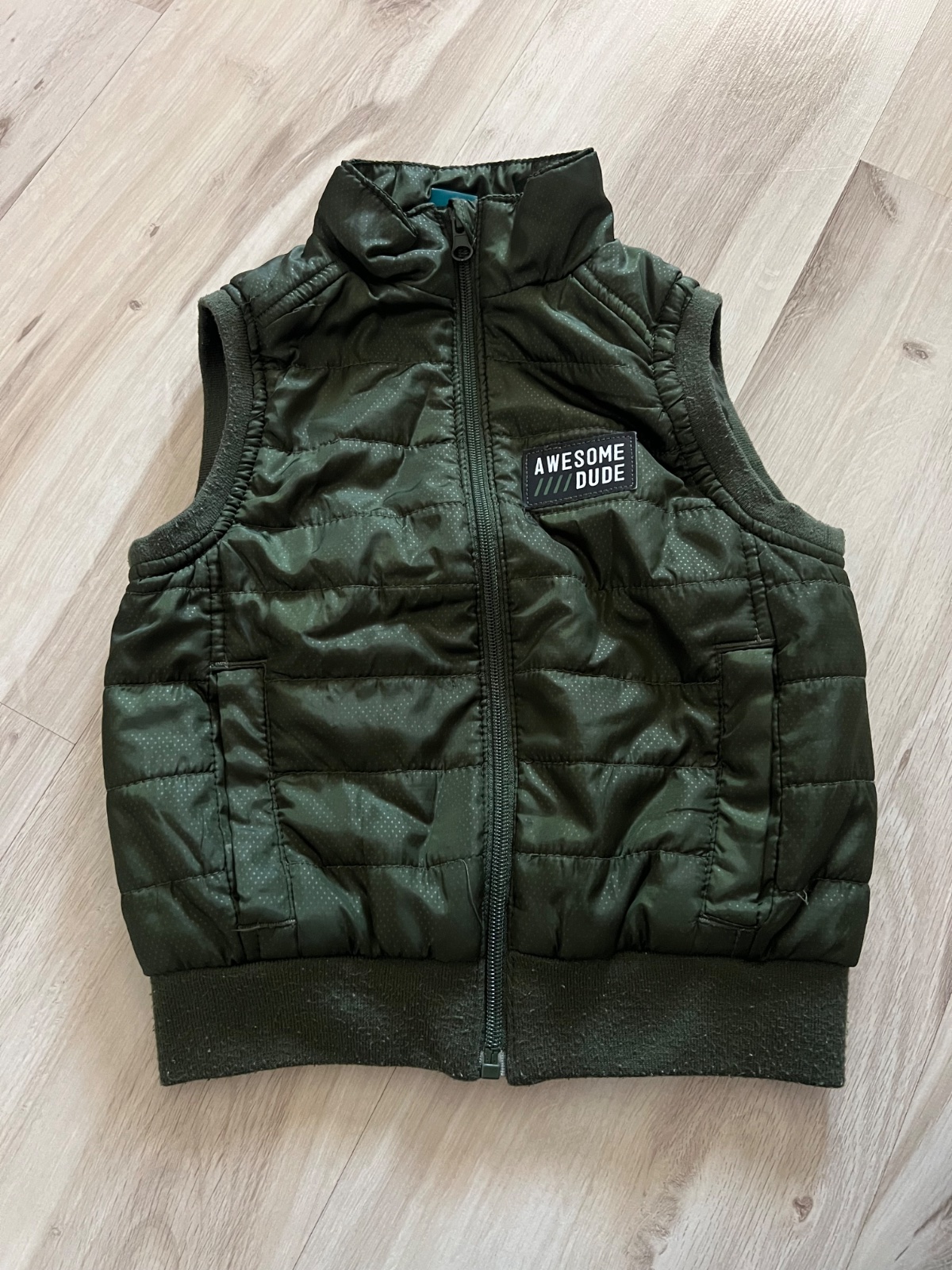 Zelenkasta vesta s kapucnou s bezovomodrymi vreckami, tensia, makkucka, nami casto nosena, co je i vidiet, nedostatky nafotene, na dvor este posluzi. Velkost 104c ale je mensia, nosili sme od 98.