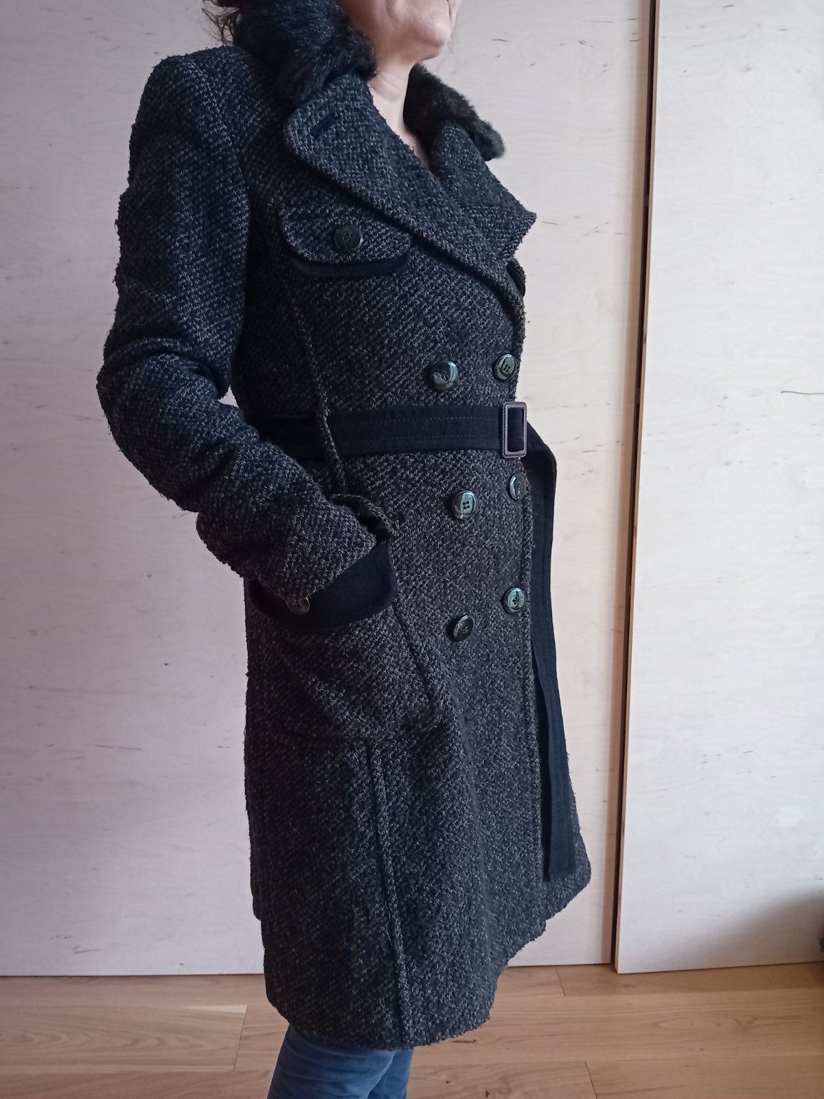 Predám pekný zimný vlnený kabát zn. Mango, oblečený iba asi 5x. Na golieri je snímatelna kožušinka, kabát je bez poškodení. Veľkosť L.
