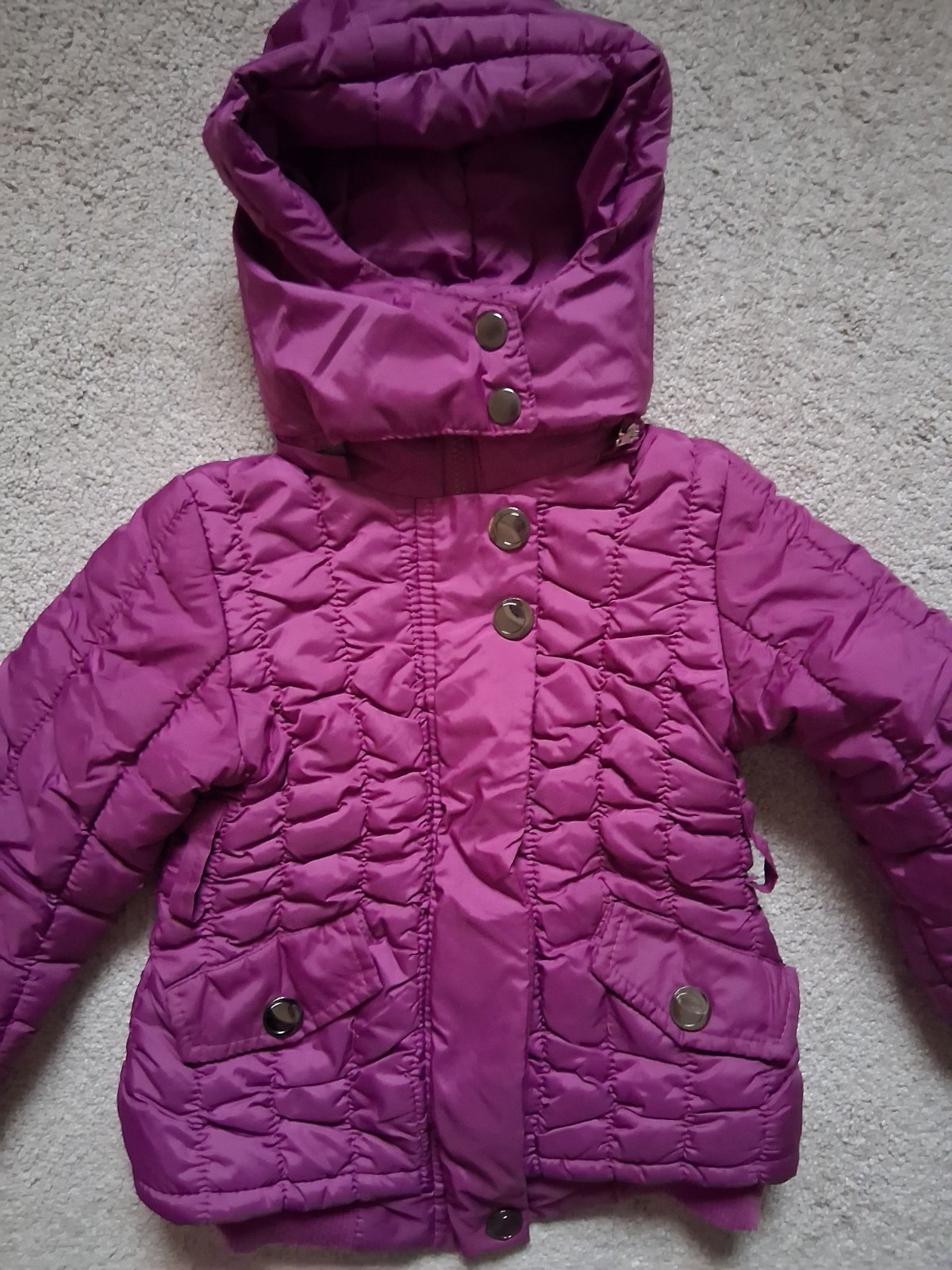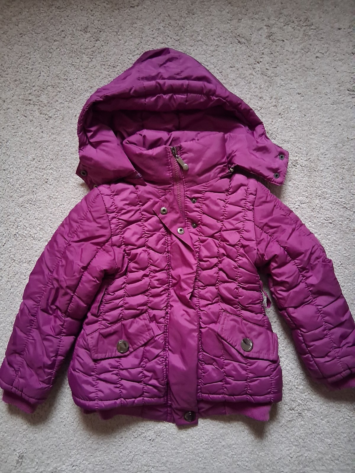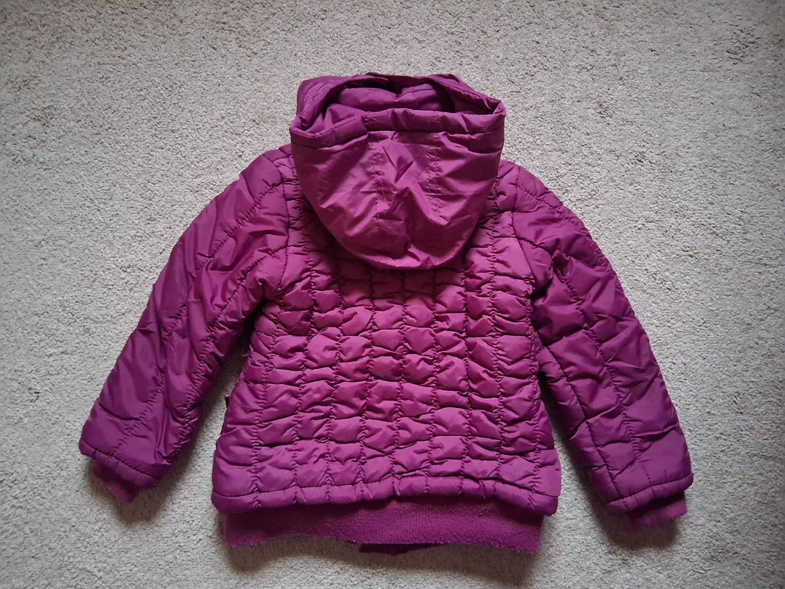 Nosená v super stave, zvnútra zateplená, kapucka odnímateľná na zips. Dlžka 45cm, širka 2x 33cm pod pazuchami, rukáv od pleca 36cm+ patent 4cm. Pekná sýta farba, krajšia ako na foto. Veľkosť som odhadla na 3-5 rokov 104-110.
