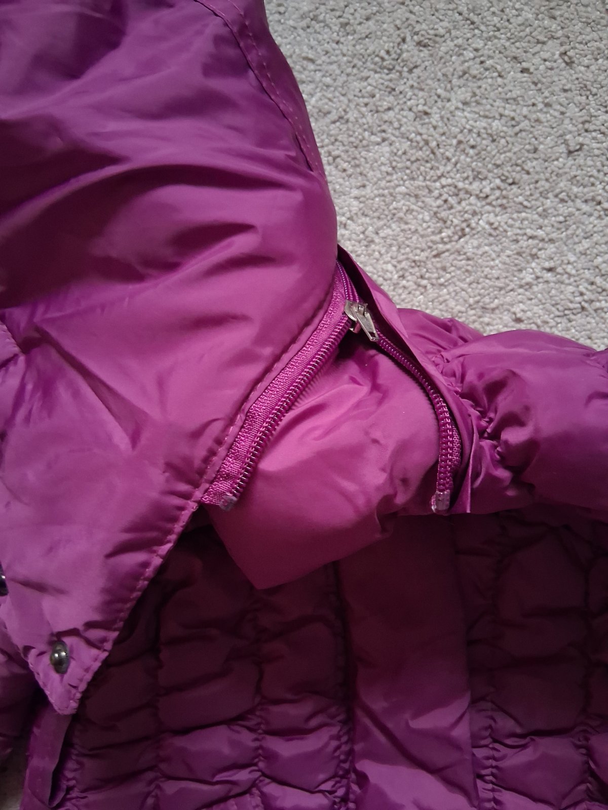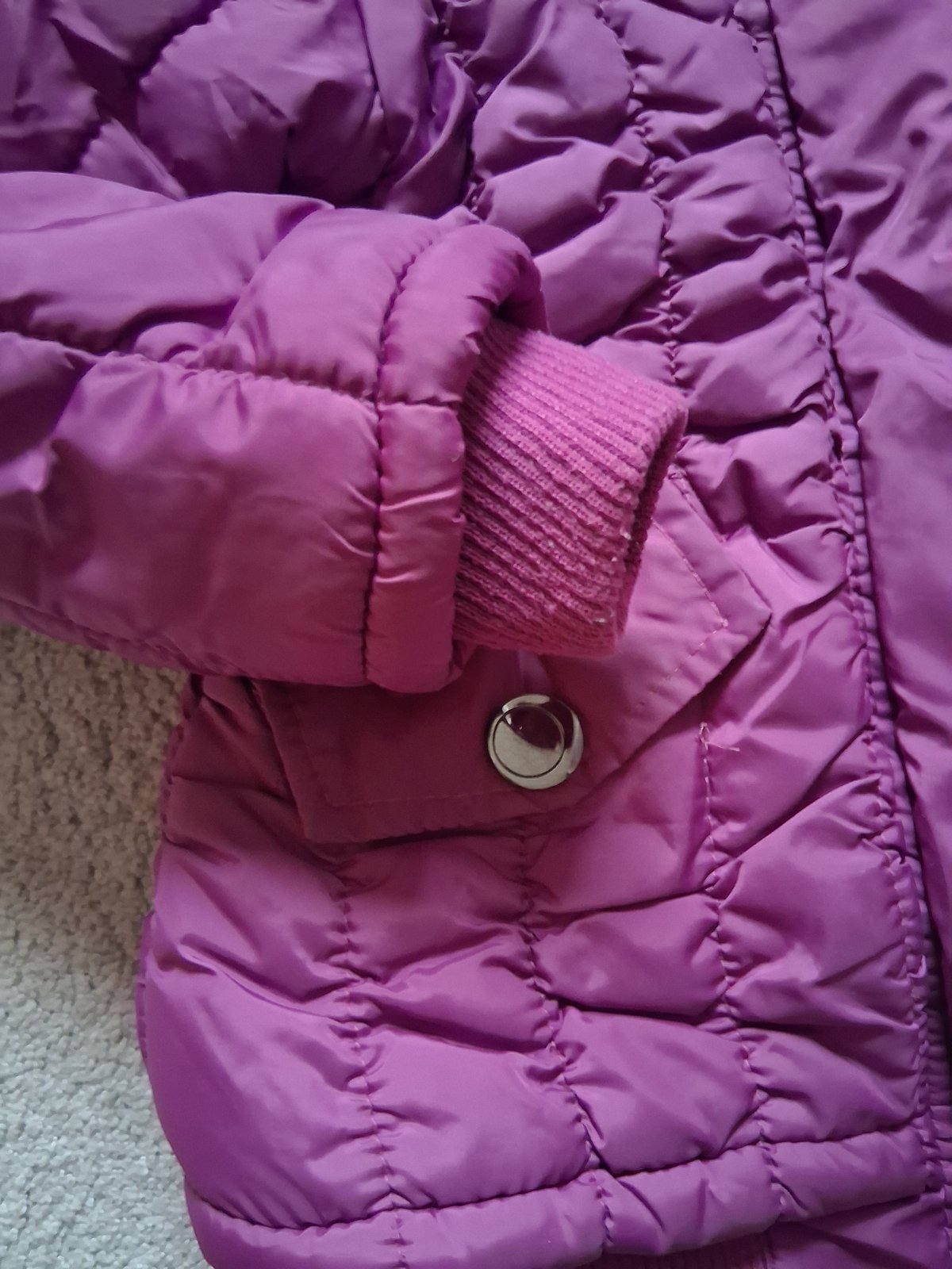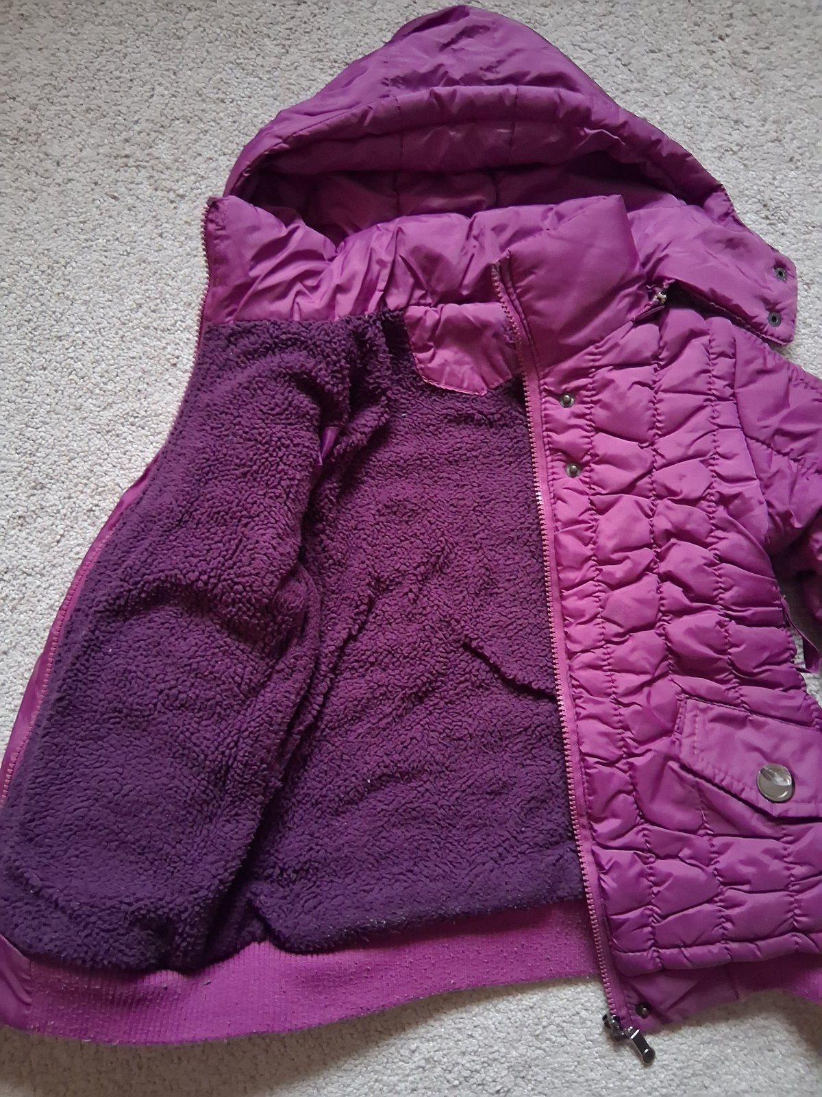 Nosená v super stave, zvnútra zateplená, kapucka odnímateľná na zips. Dlžka 45cm, širka 2x 33cm pod pazuchami, rukáv od pleca 36cm+ patent 4cm. Pekná sýta farba, krajšia ako na foto. Veľkosť som odhadla na 3-5 rokov 104-110.