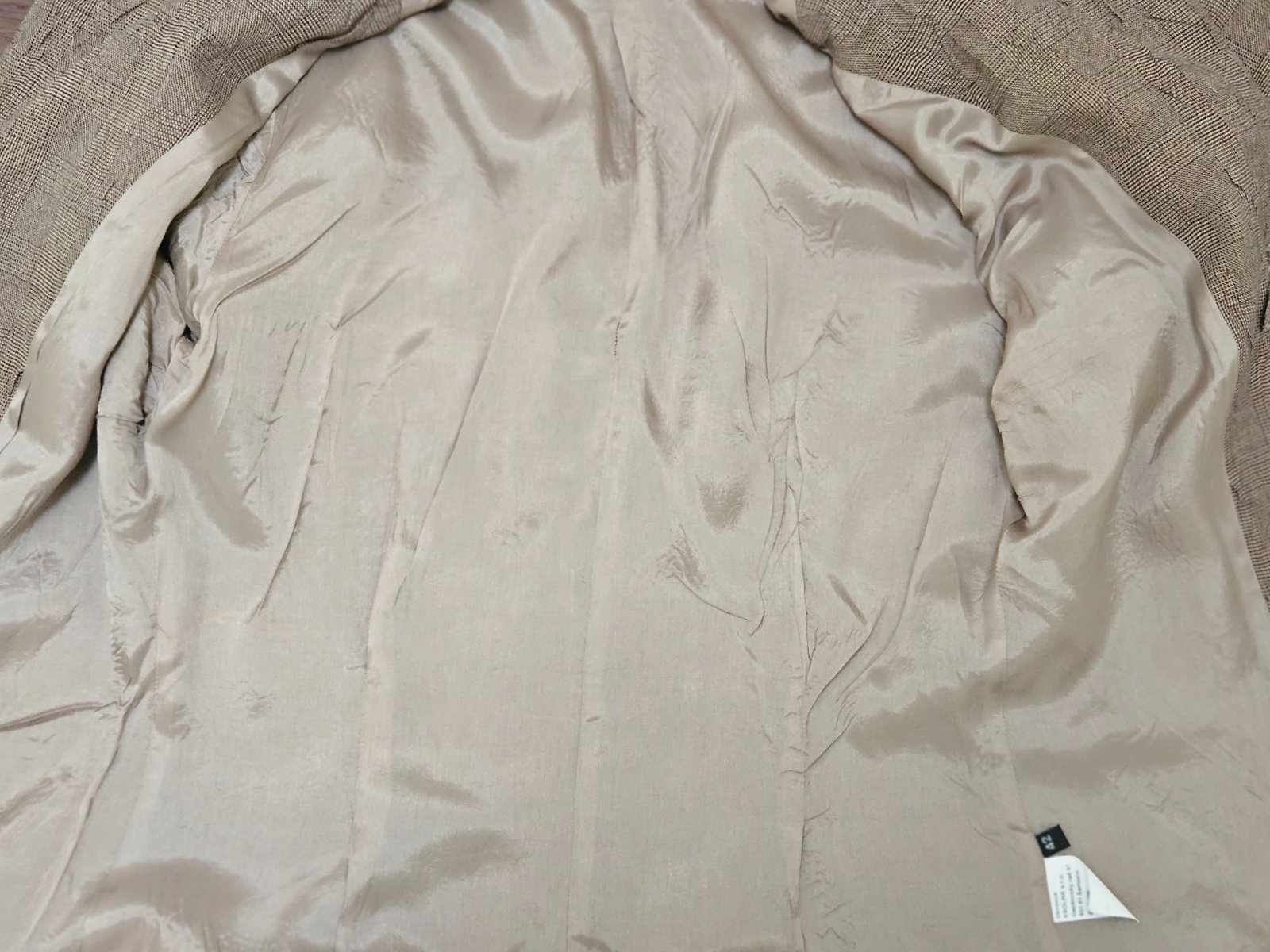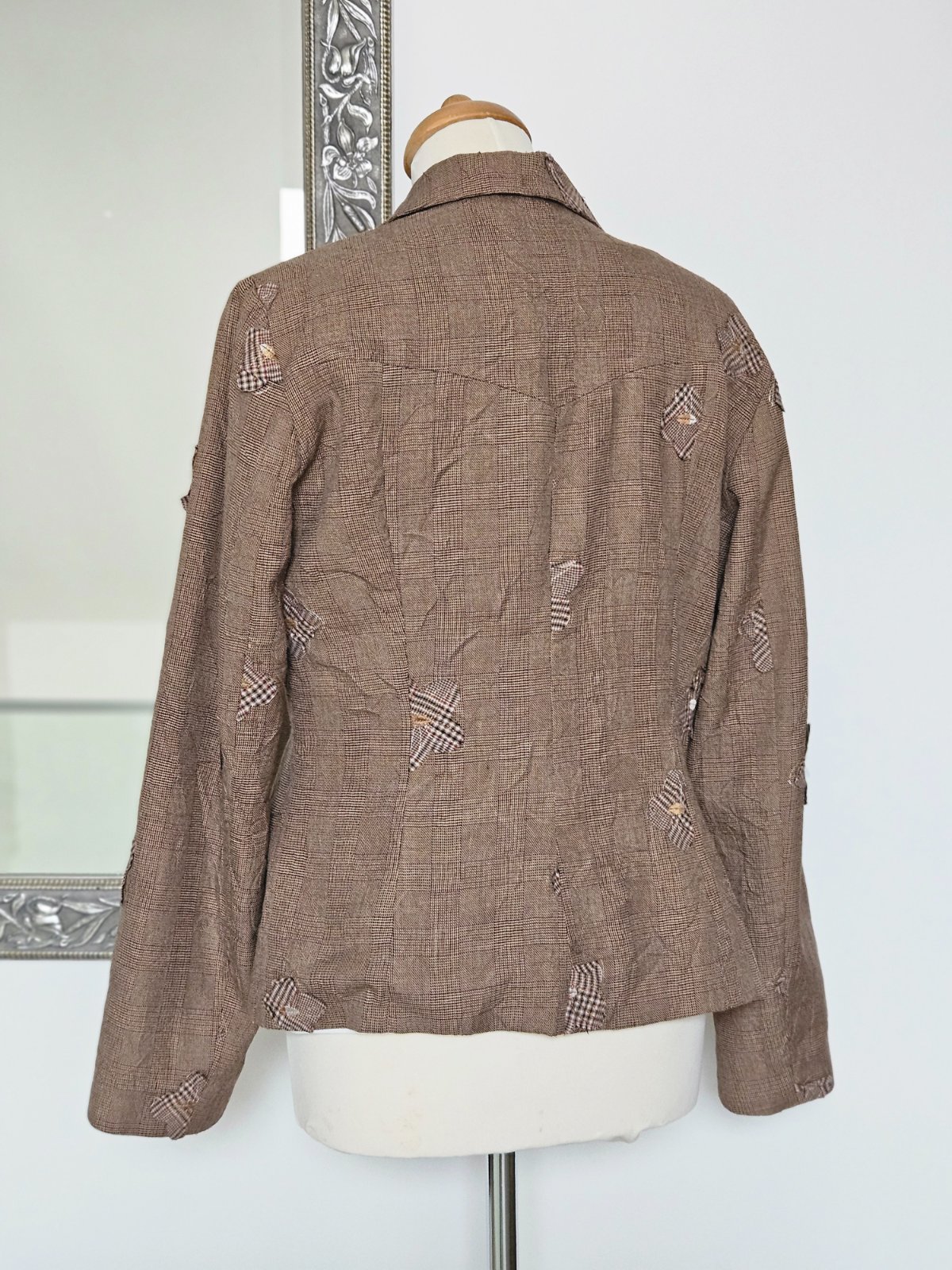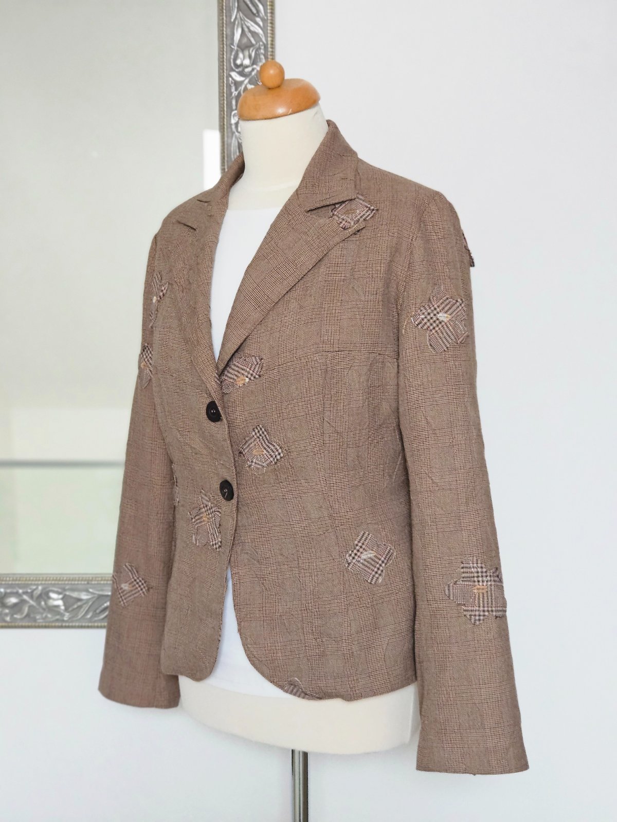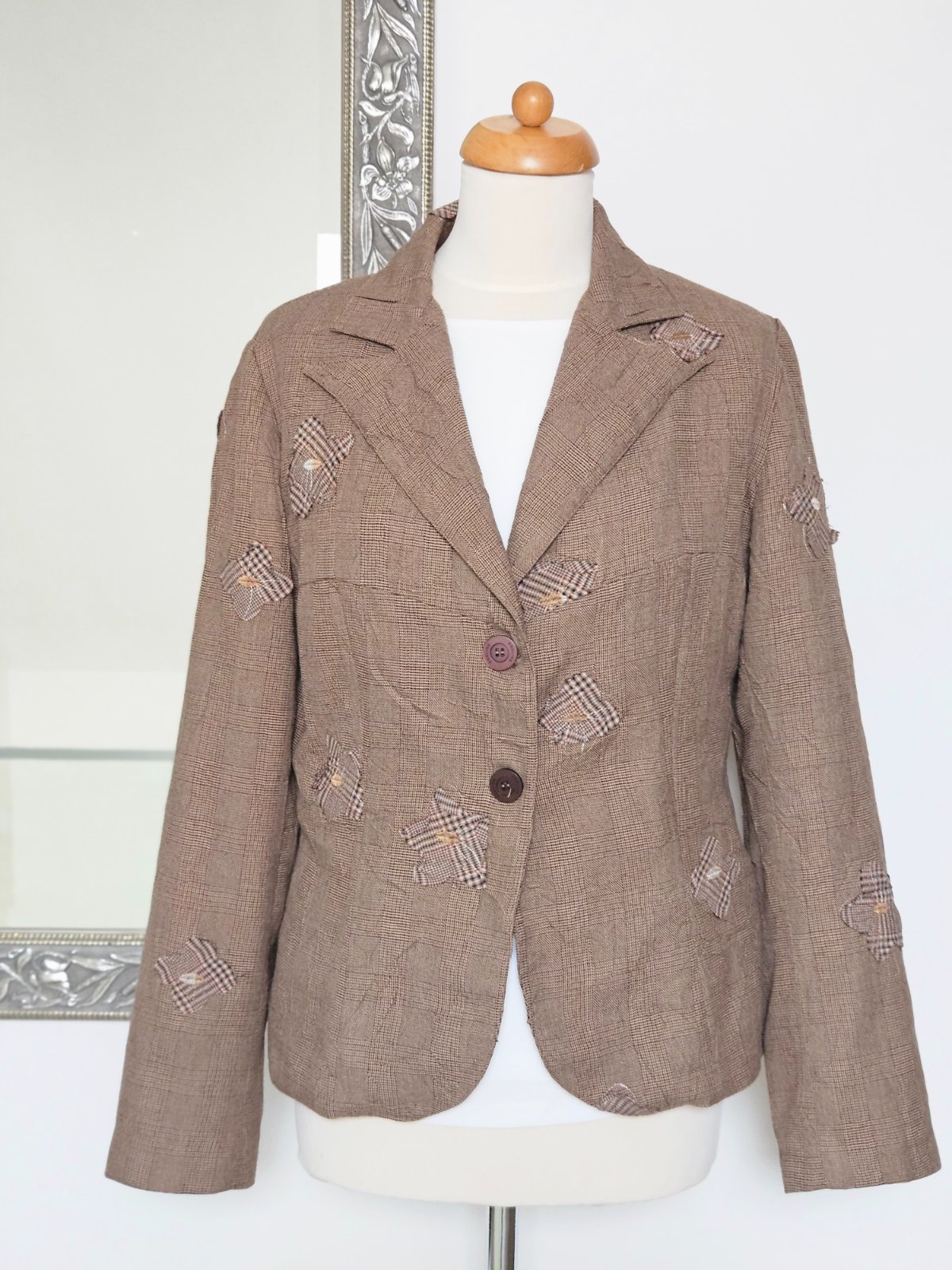 Hnedé kárované sako s kvietkami. Veľkosť 42, ale skôr väčšia 40 (pozri rozmery). V dokonalom stave.