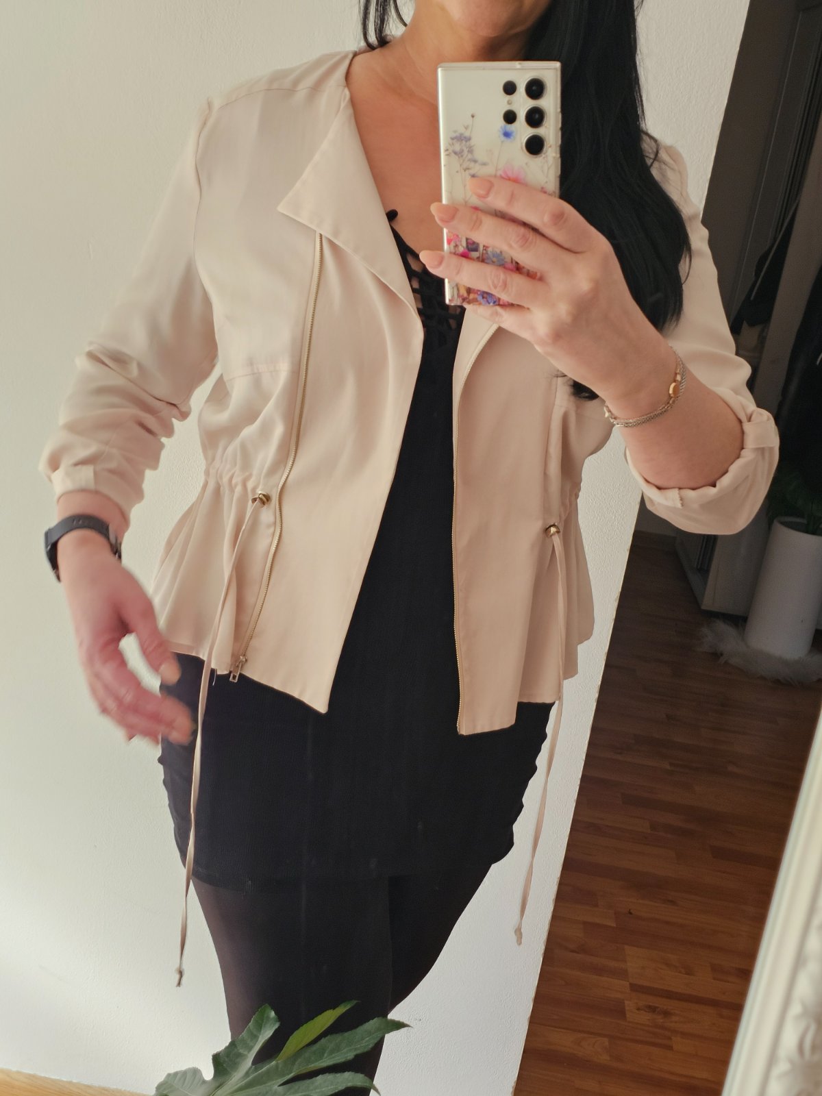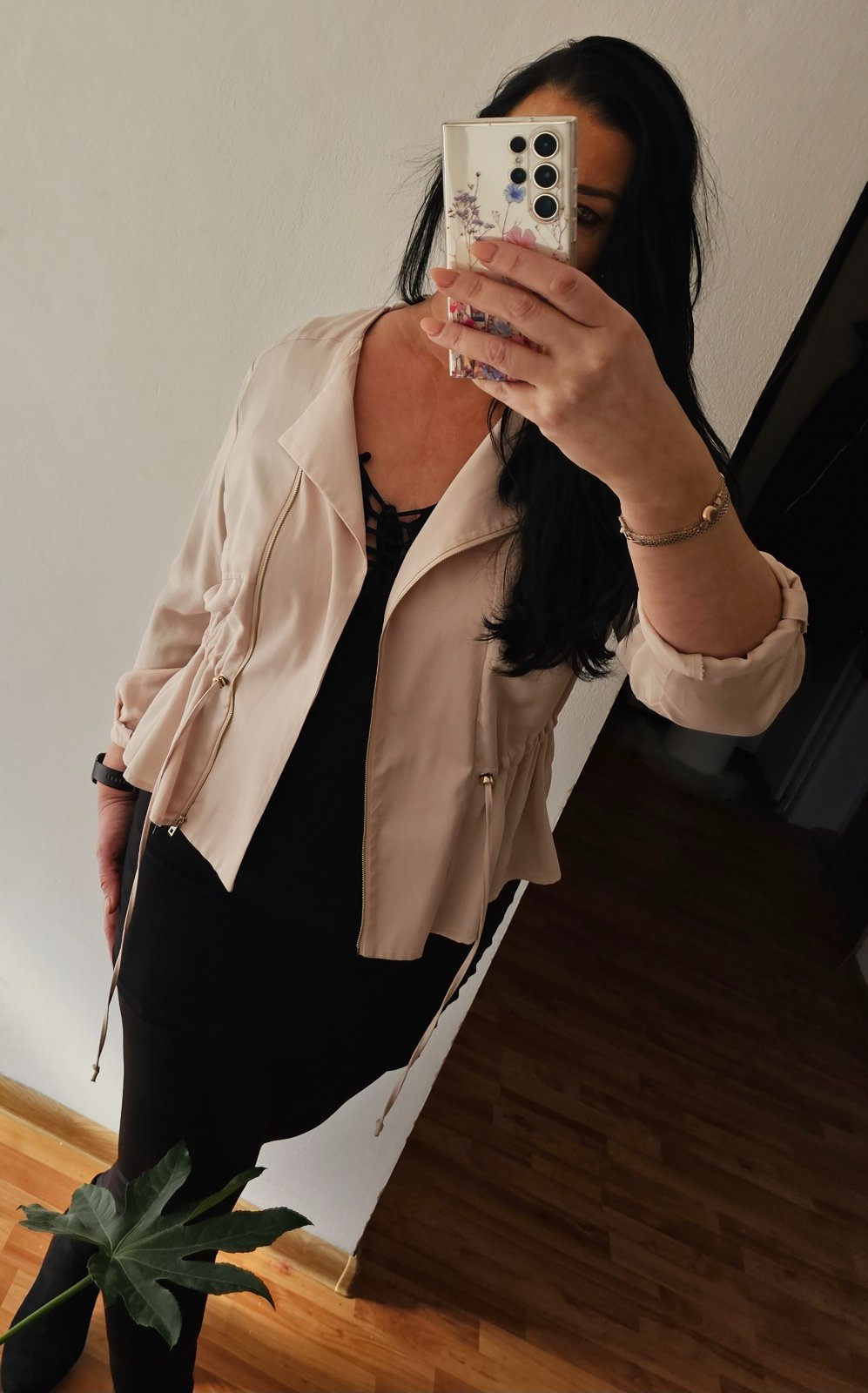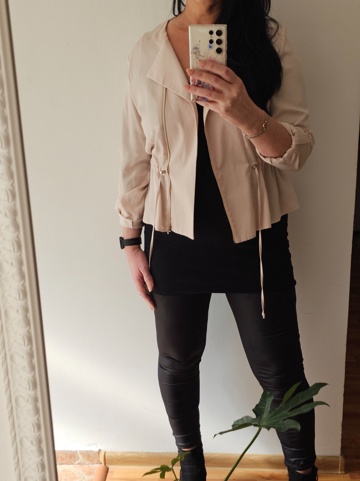 Nový jarný kabatik, veľkosť L, nesadla veľkosť, príjemný materiál, teplučký. Cena s poštovným 21€, pri rýchlom jednaní sa rada dohodnem.