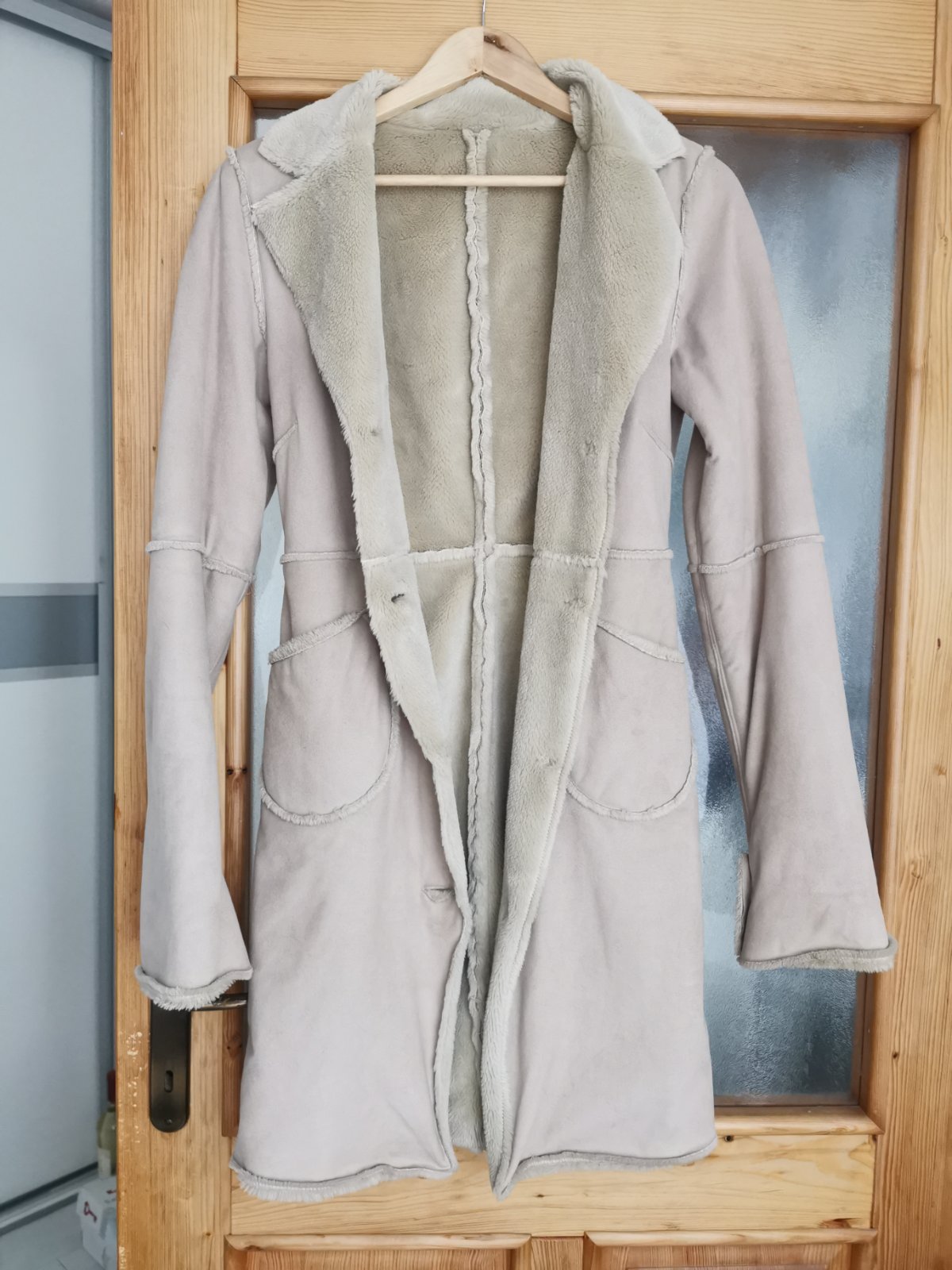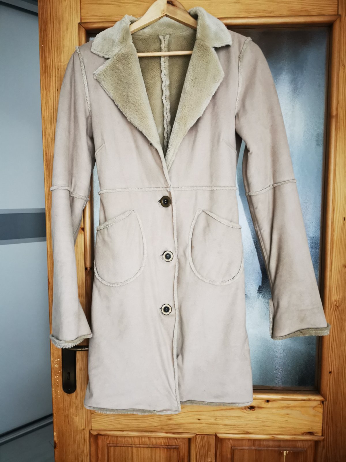 Predám kabát, imitácia kožuchu. V peknom, nosenom stave. Len na ňom chýba 1 gombík.