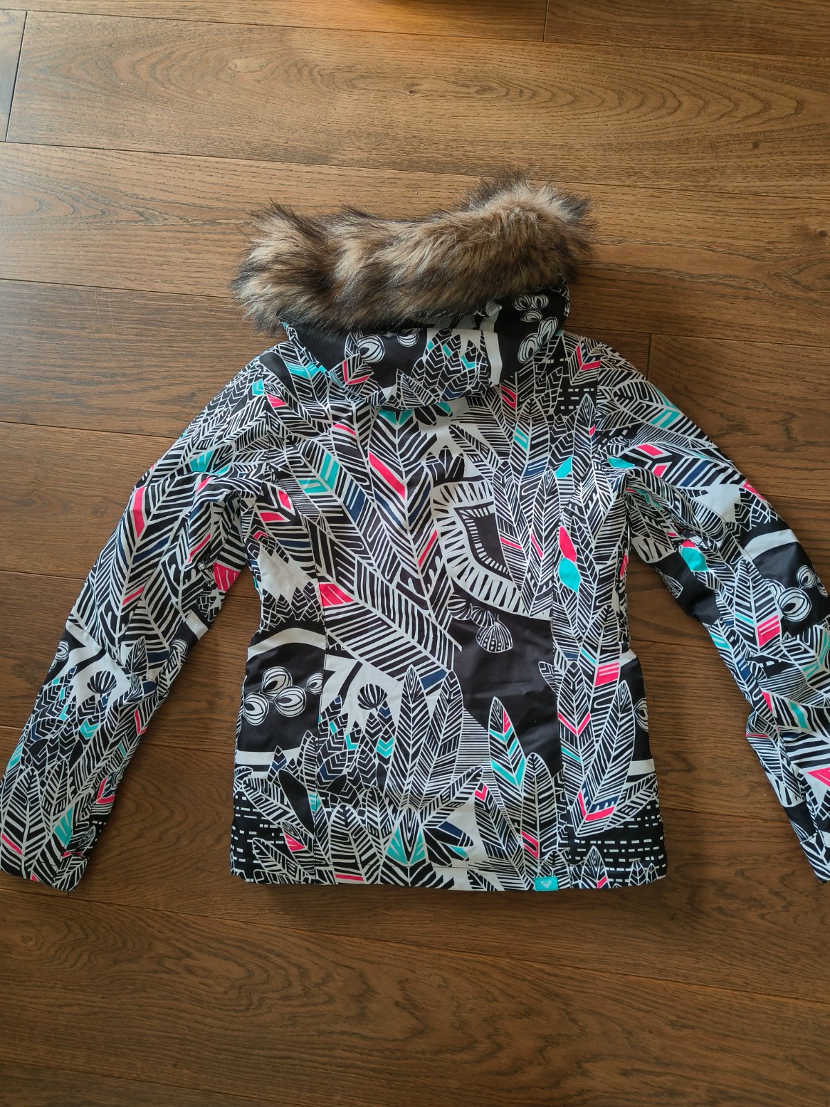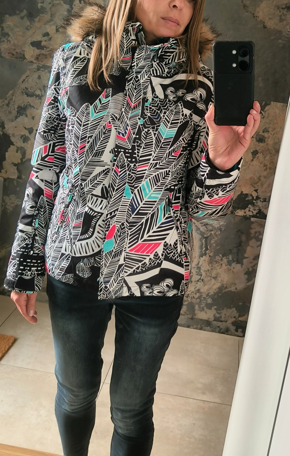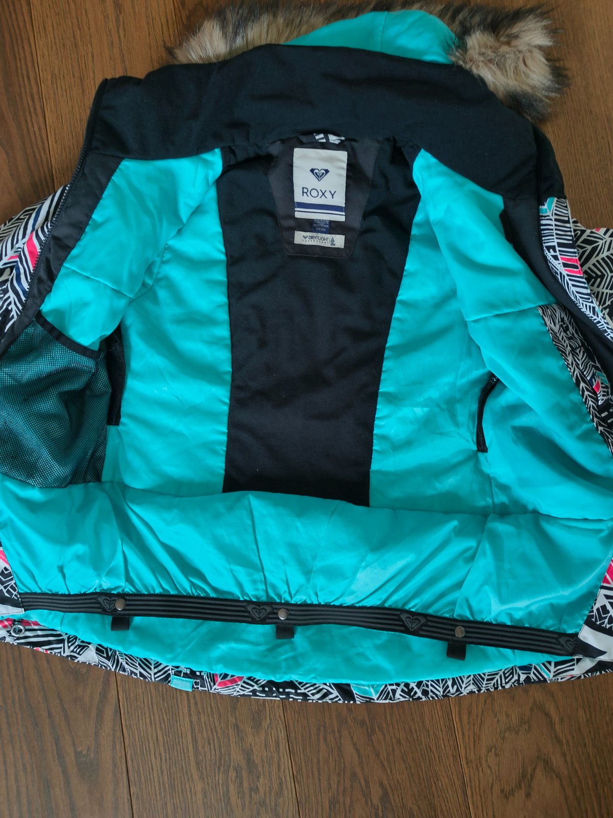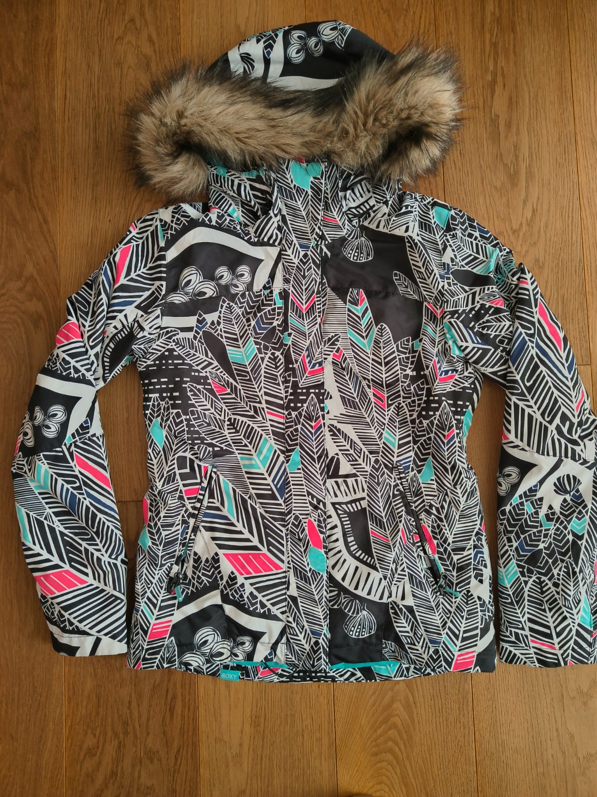 Kvalitna bunda znacky Roxy, tensia ale funkcna nepremokava, sadne tak na S,M rozmery: sirka 53cm, dlzka 65cm. Je nosena dost, zvnutra jemne zazltnuta ale inak bez poskodeni urcite este posluzi. Moz...