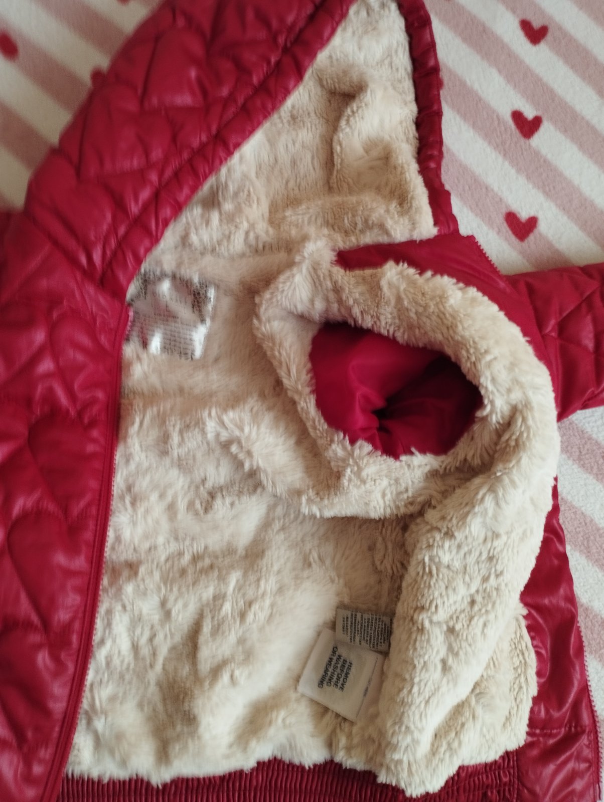 Imidzovka, bundicka je do pasa. Cez hrud je zateplena chlpatym materialom. Ma jemnejsie gumicky na moj vkus. Pri vreckach ma nedostatky. Je to odfotene. Ale este vie urobit paradu. Na korculovanie napriklad k dzinsom. Krasny srdieckovy dizajn 🥰