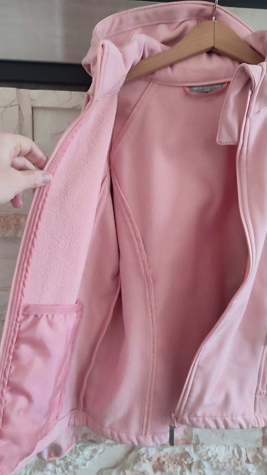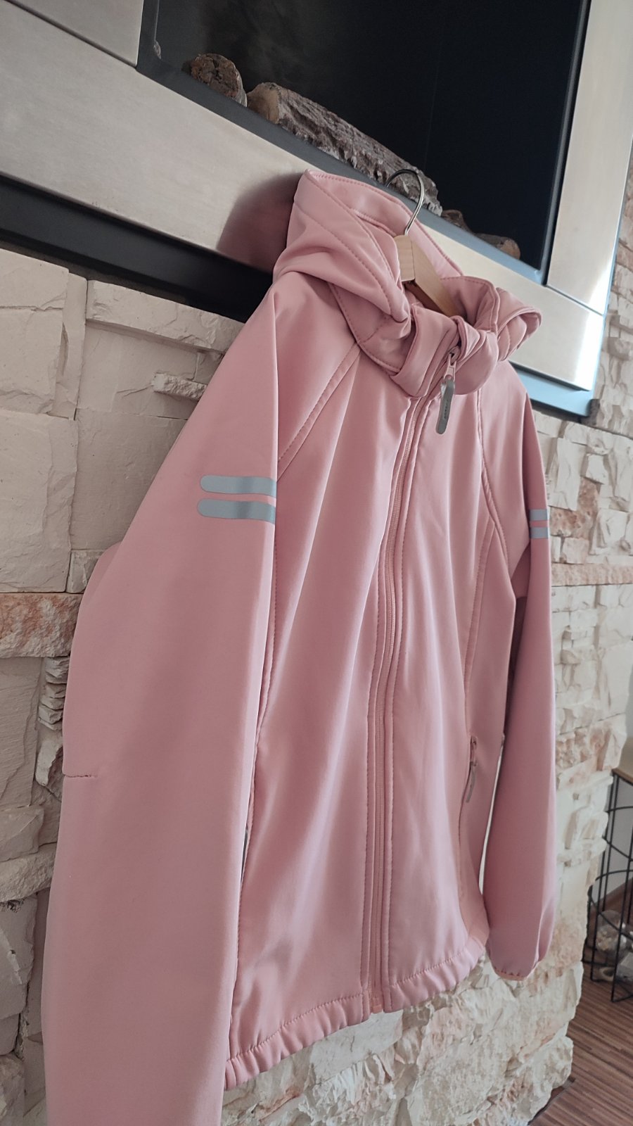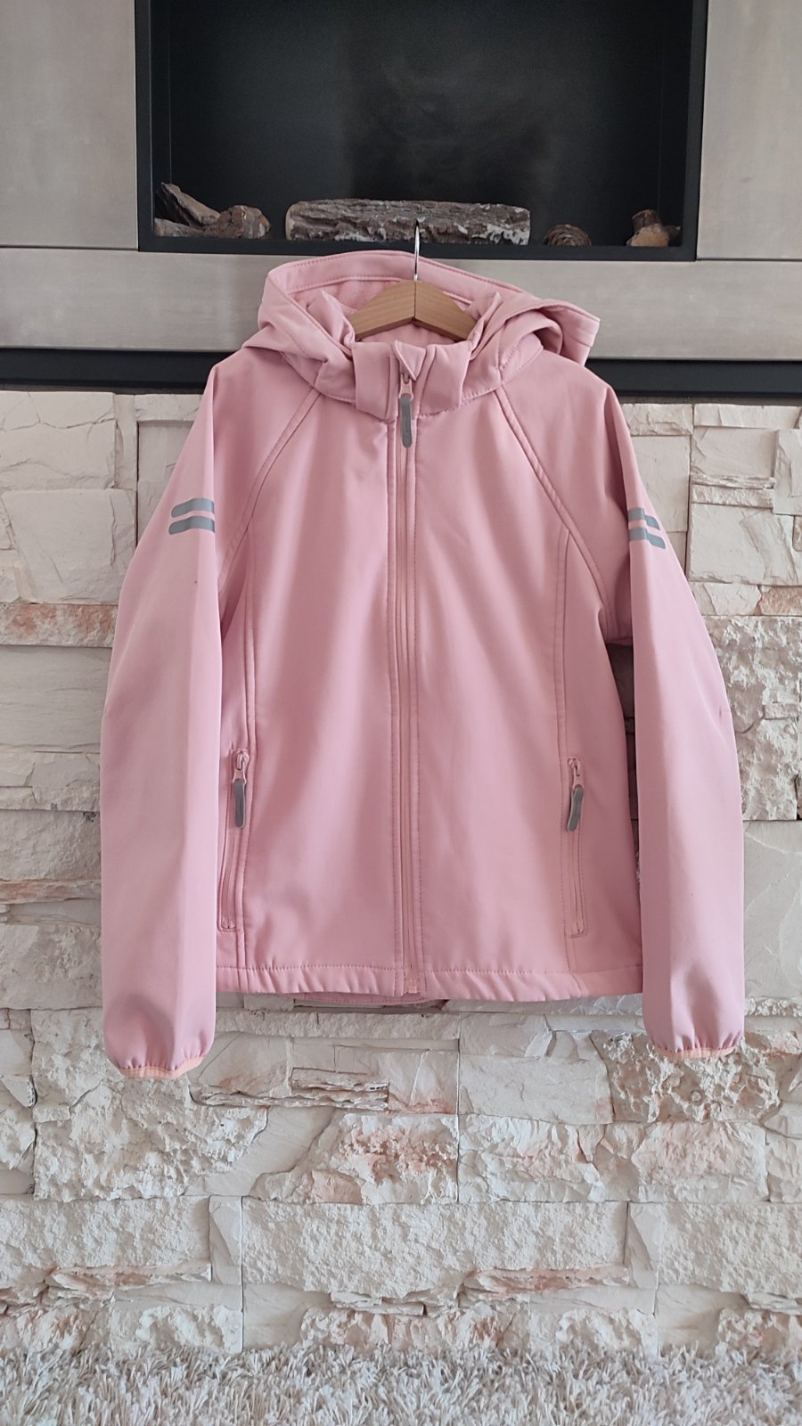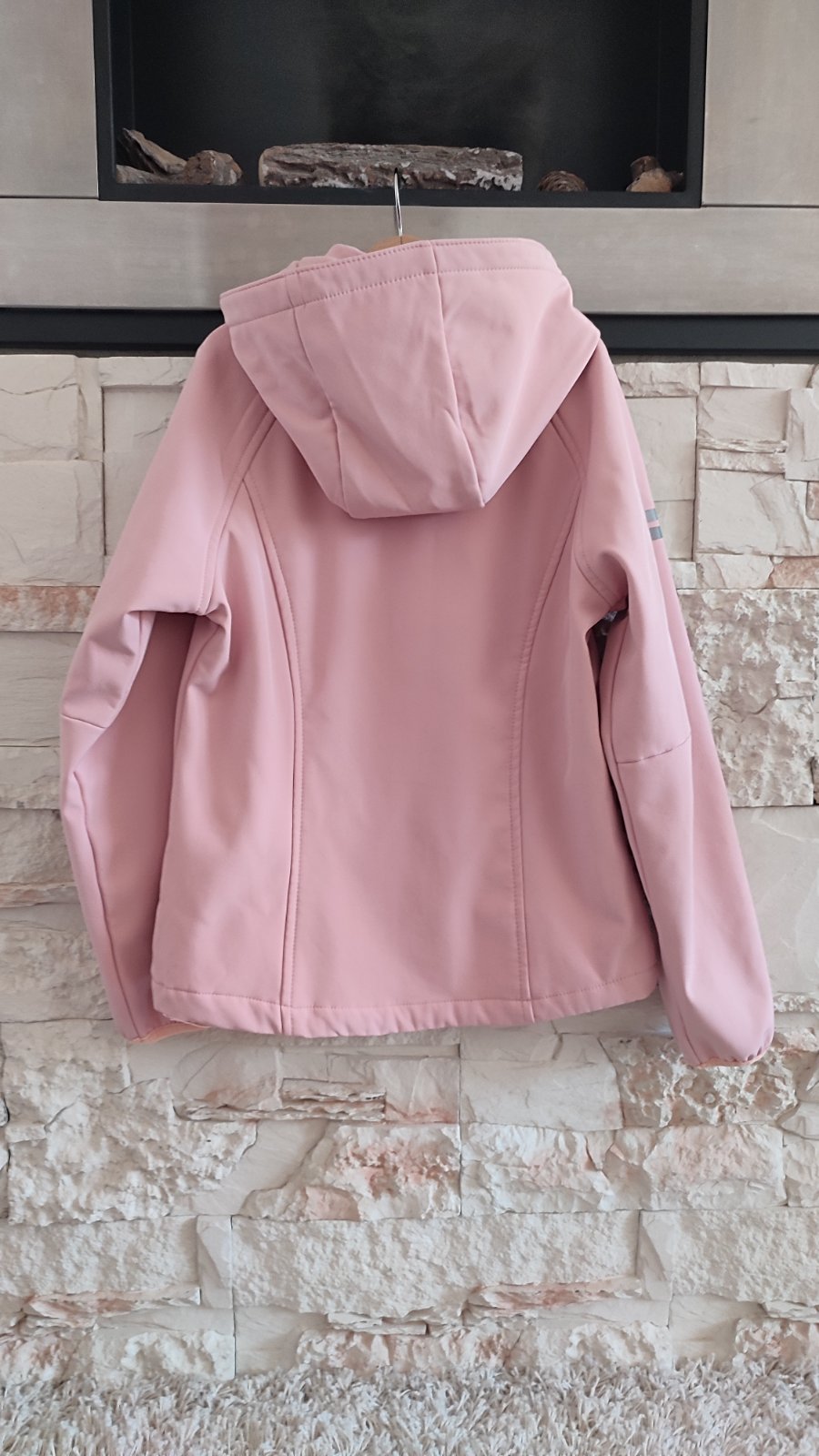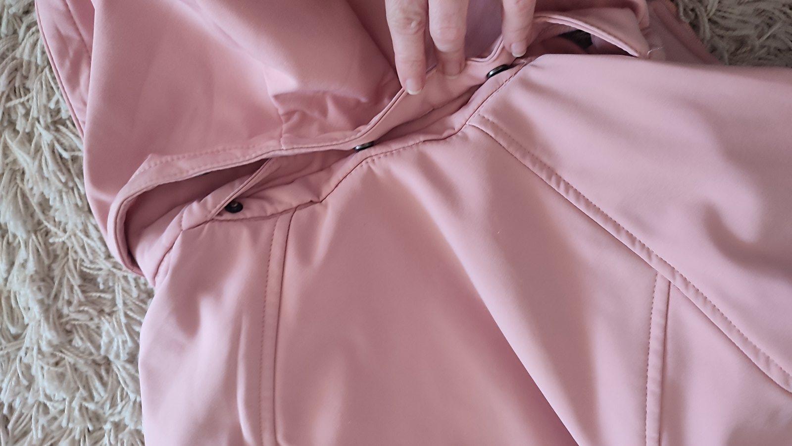 Ponukam prechodnu softshelovu bundu ruzovej farby. Neprefukava, nepremokava, s kapuckou. Ma reflexne prvky, rukavy su ukoncene na voľnú gumu. Zipsy su prekryte nepremokavou membranou. Vnutro je prijemne teple, flisove.