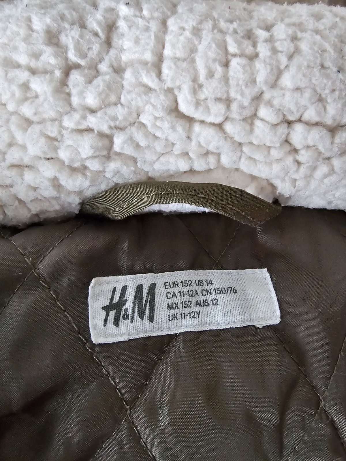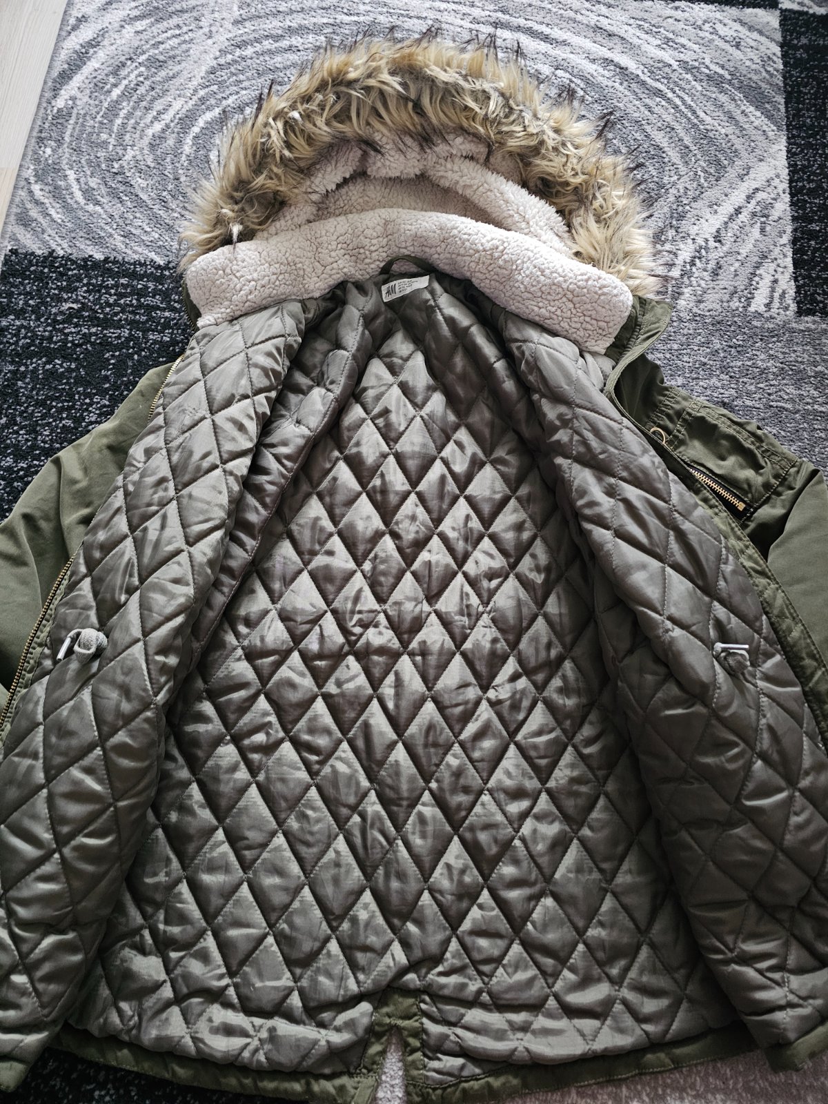 Bez poškodení a fľakov, nosenia jednu zimu na striedačku s inými, kapucňa sa dá dať dole, v páse sa dá vo vnútri stiahnuť, šírka v podpazuší 48cm, dĺžka vpredu 70cm, rukáv od kapucni 72cm.