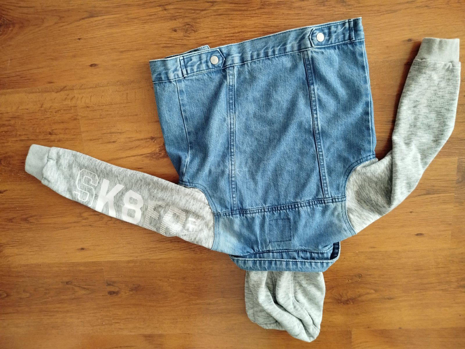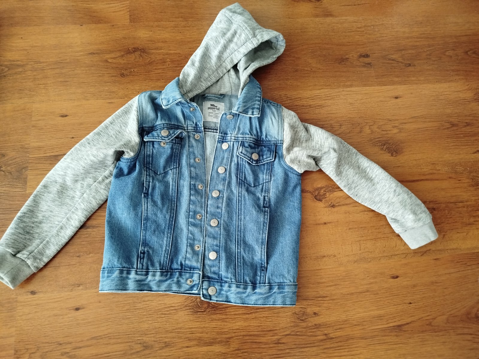 Riflová bunda s bavlnenými časťami, bavlnené rukávy sú teplejšie, málo nosená, pekná