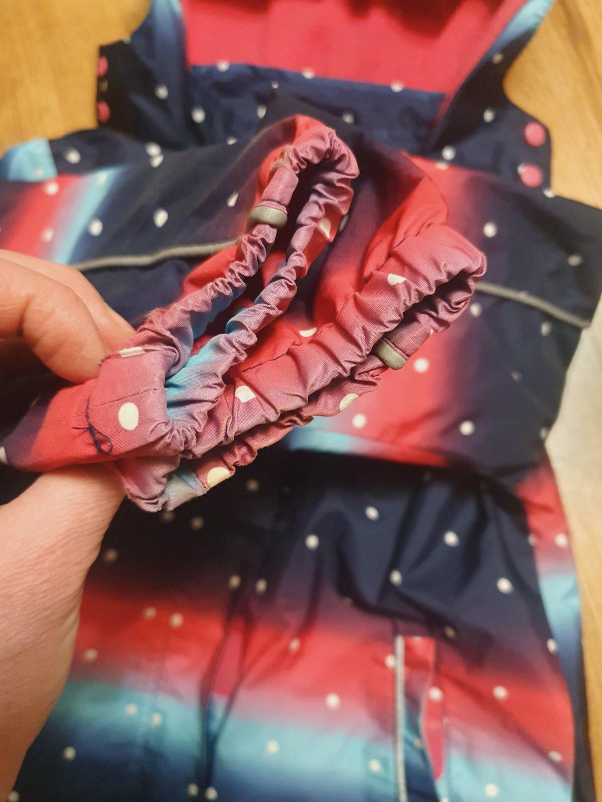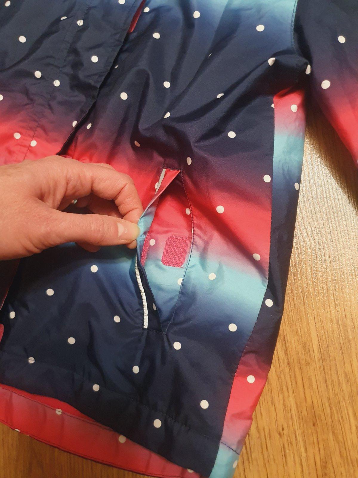 Ani raz neoblečená, takže bez akýchkoľvek poškodení, nepremokavá, podšitá mäkkučkou bavlnou. na rukáve ešte druhá pružná manžeta, reflexné prvky, vzadu v páse guma. Ruk. od krku 52, š. 37, d. 48 cm.