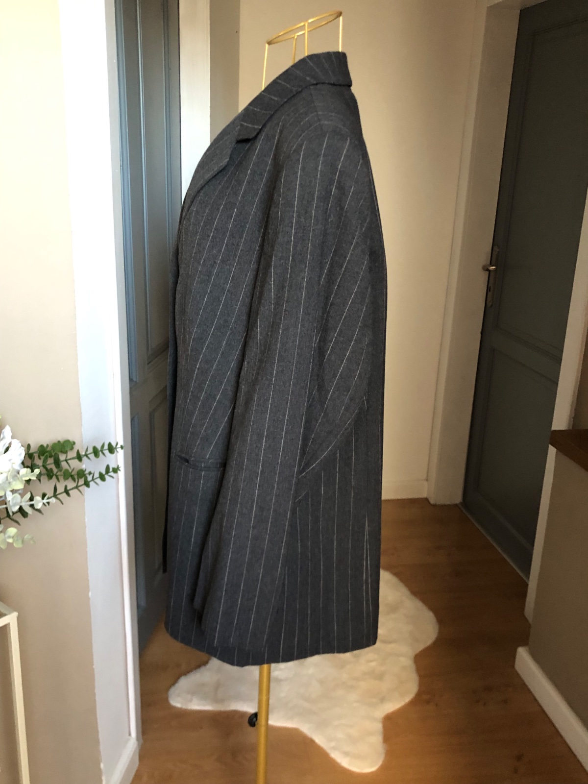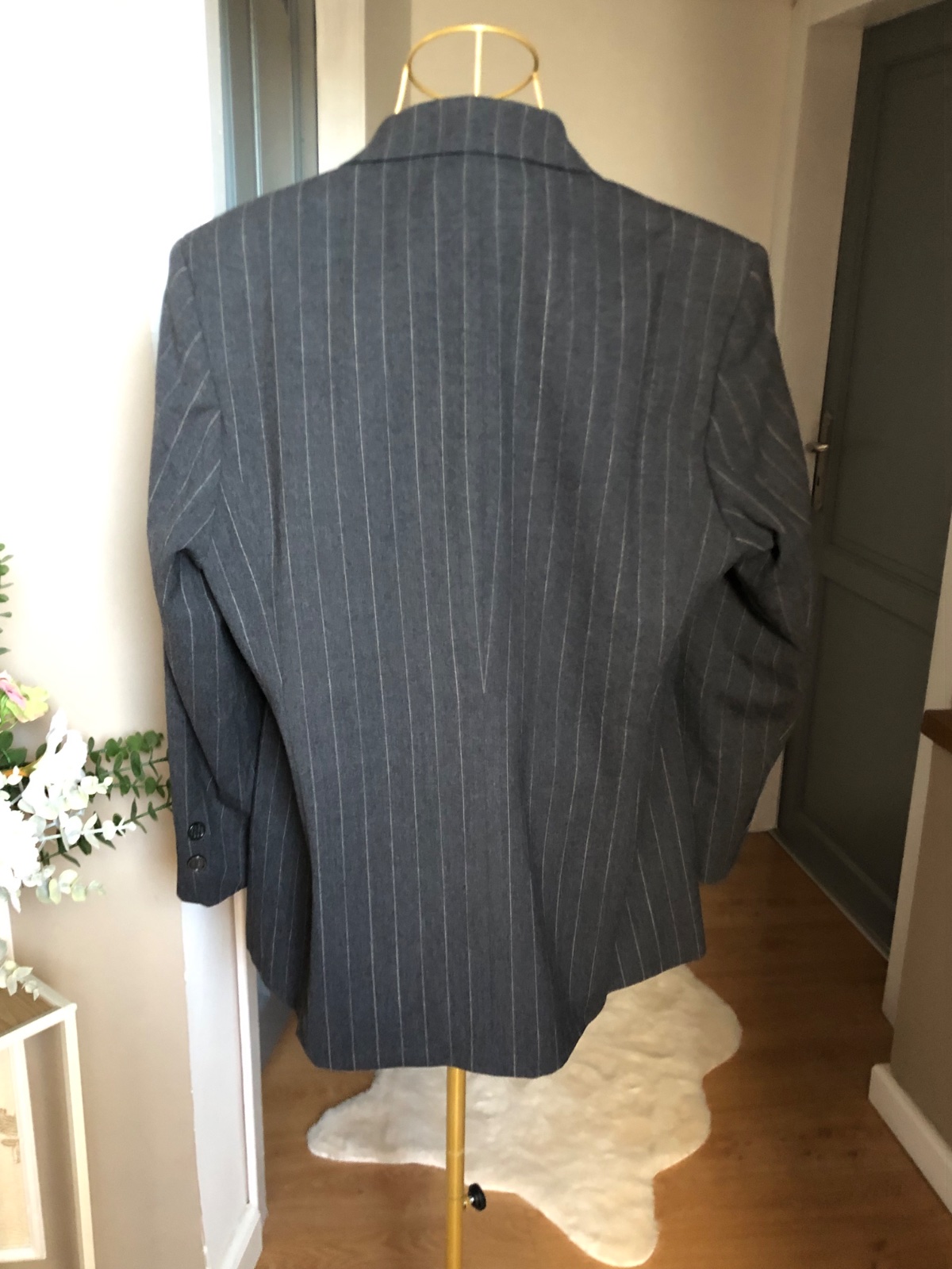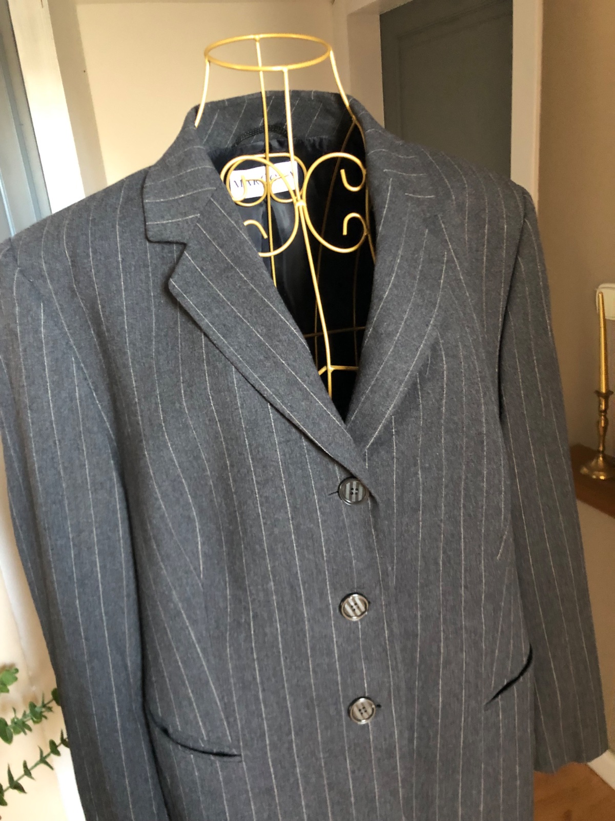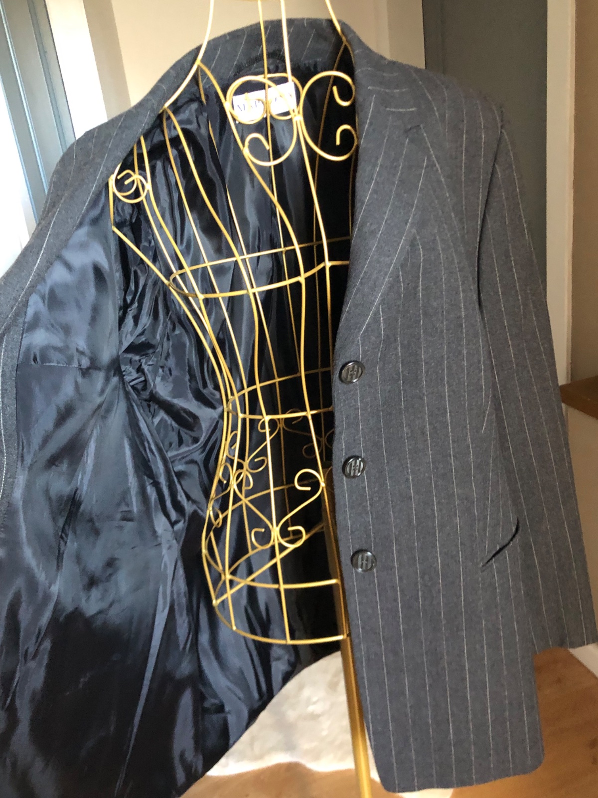 Luxusne vlnené sako, sivej farby s pásikmi, zapínanie na gombíky, podšité super stav.