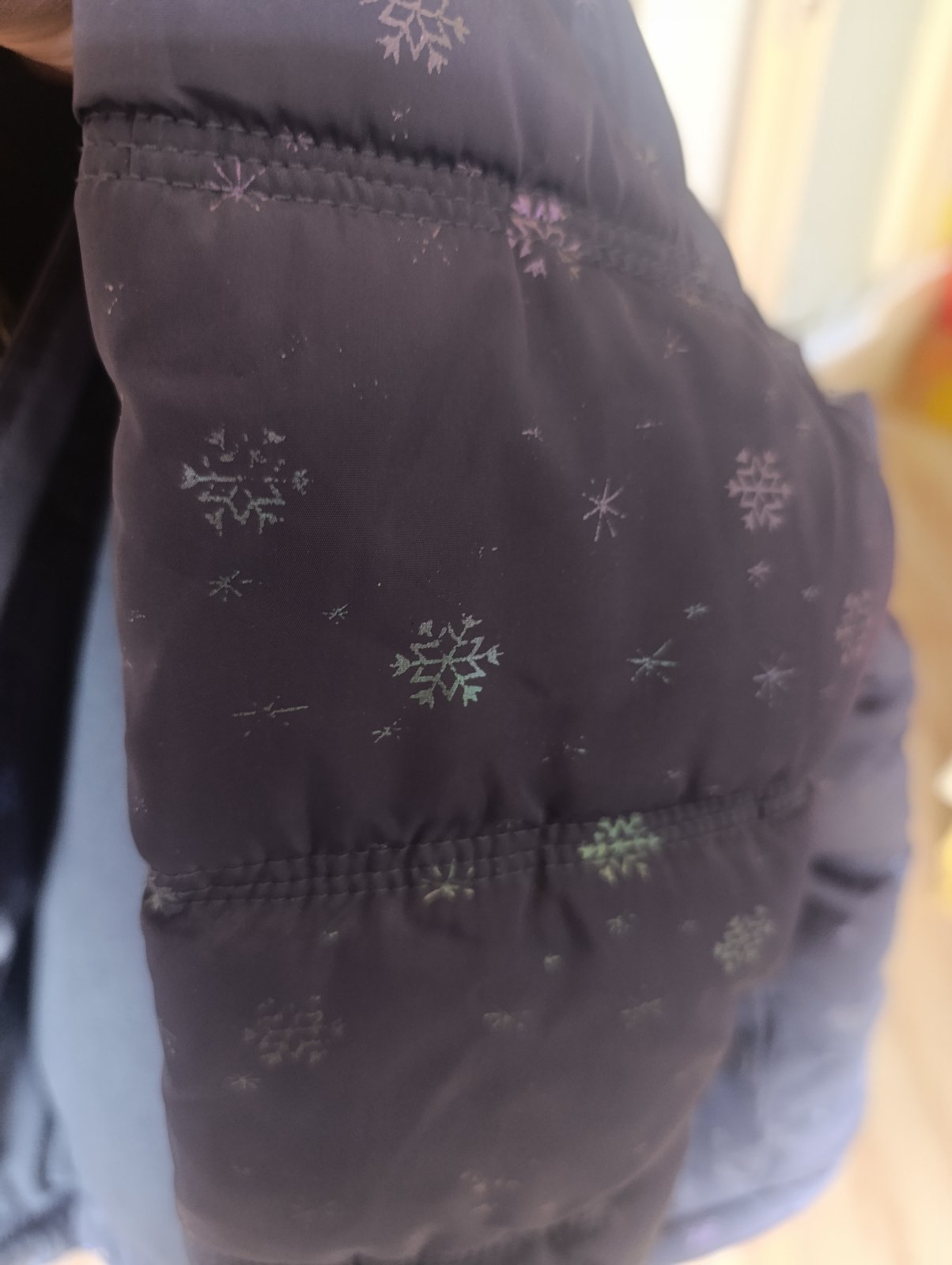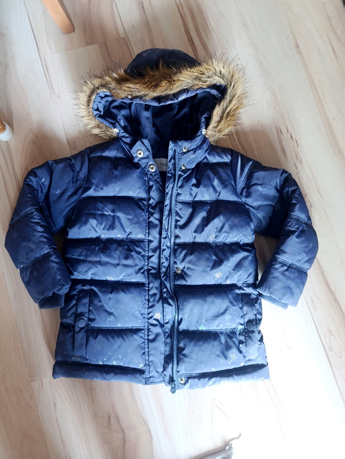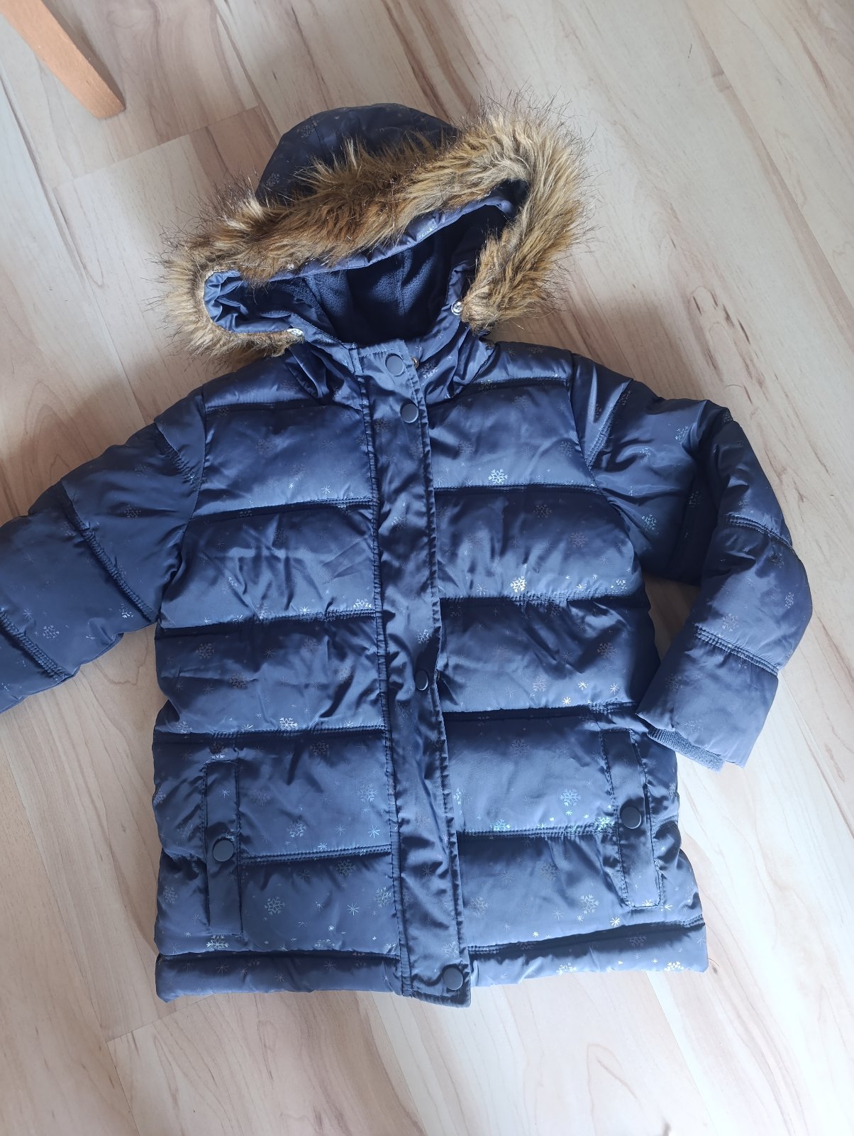 Zateplená zimná bunda flisom, veľmi pekná, vločky sú jemne trblietavé. Nemaja žiadne poškodenia. Veľ. 110
