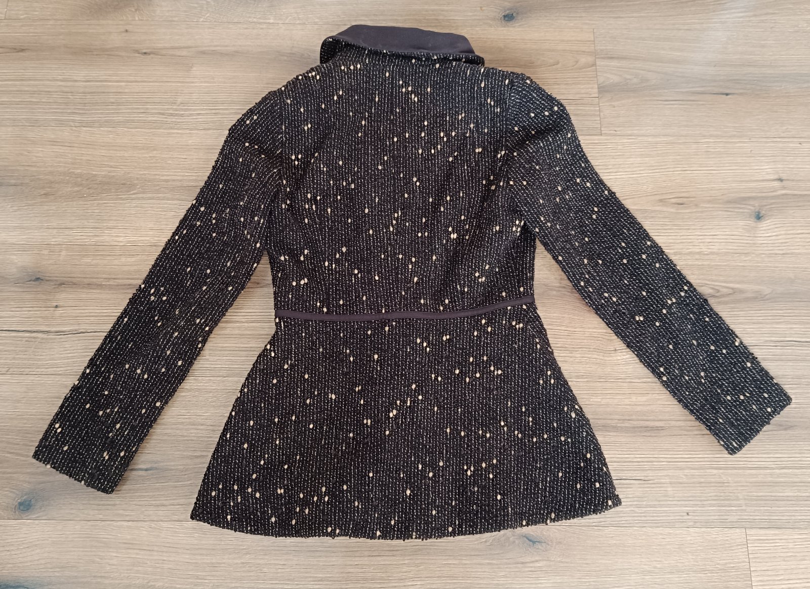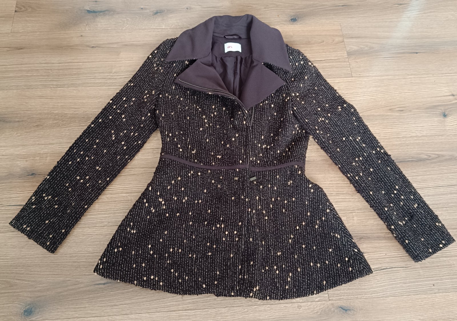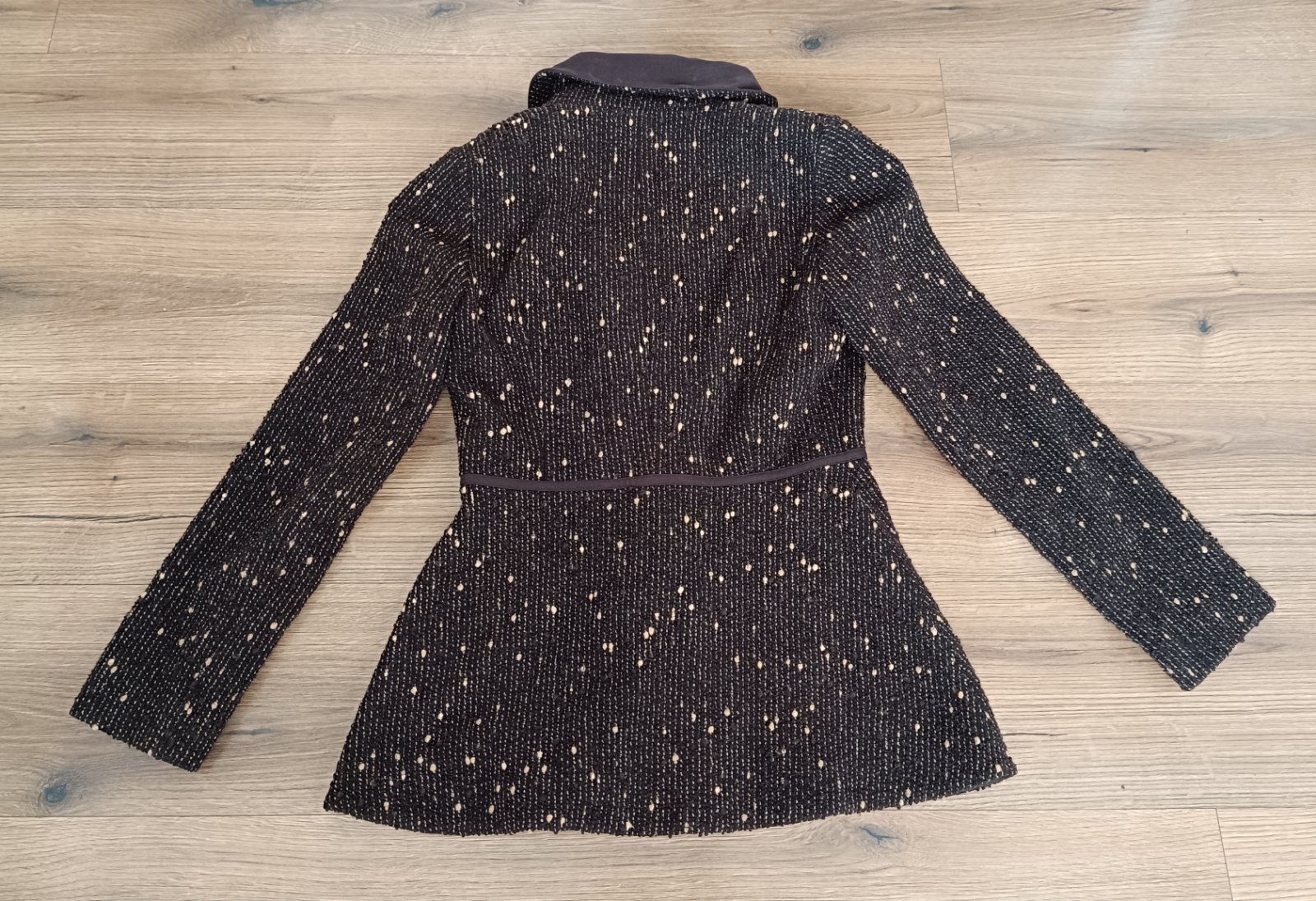 Prechodný kabát alebo predĺžené sako veľ.36. Elegantný kúsok,základom je tmavohnedá farba,ženský strih.Celková dĺžka 70cm,rukáv 63cm,prsia cca 46cm,pás 2x40. Nosený,nepoškodený kúsok.