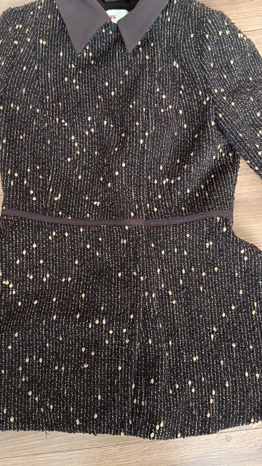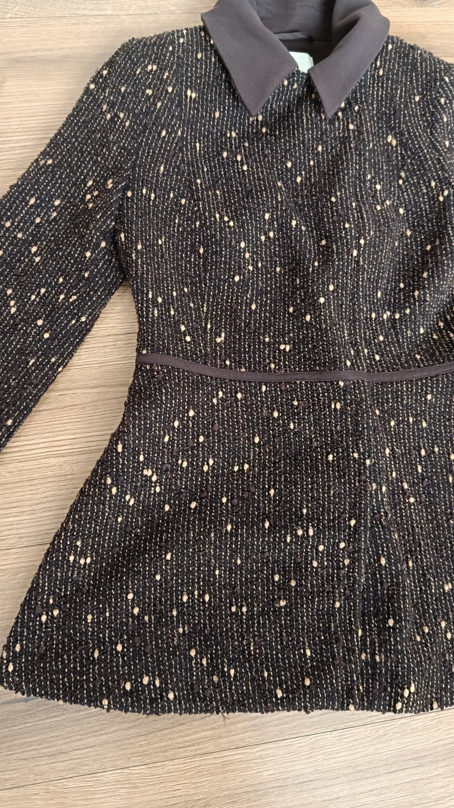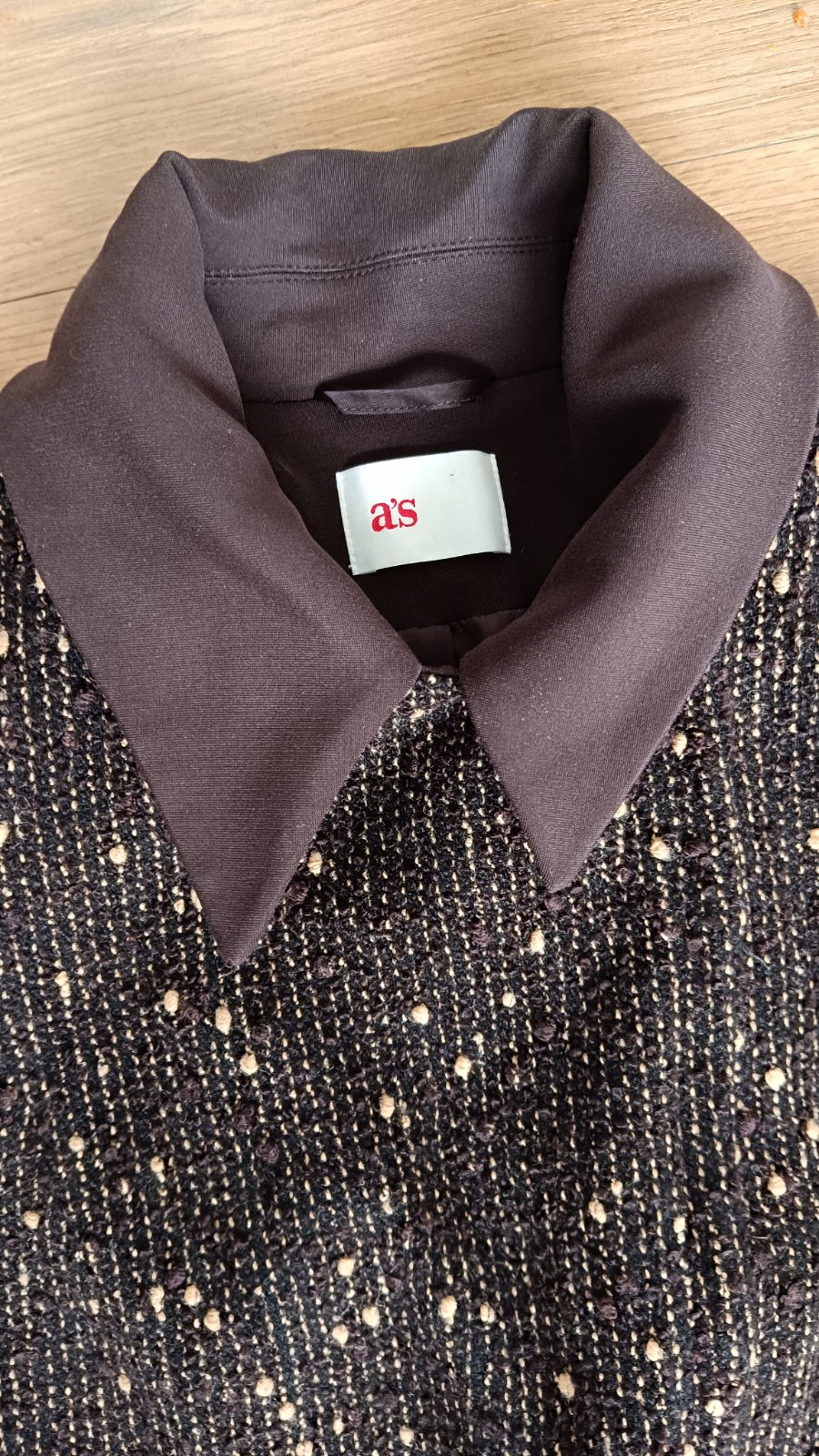 Prechodný kabát alebo predĺžené sako veľ.36. Elegantný kúsok,základom je tmavohnedá farba,ženský strih.Celková dĺžka 70cm,rukáv 63cm,prsia cca 46cm,pás 2x40. Nosený,nepoškodený kúsok.