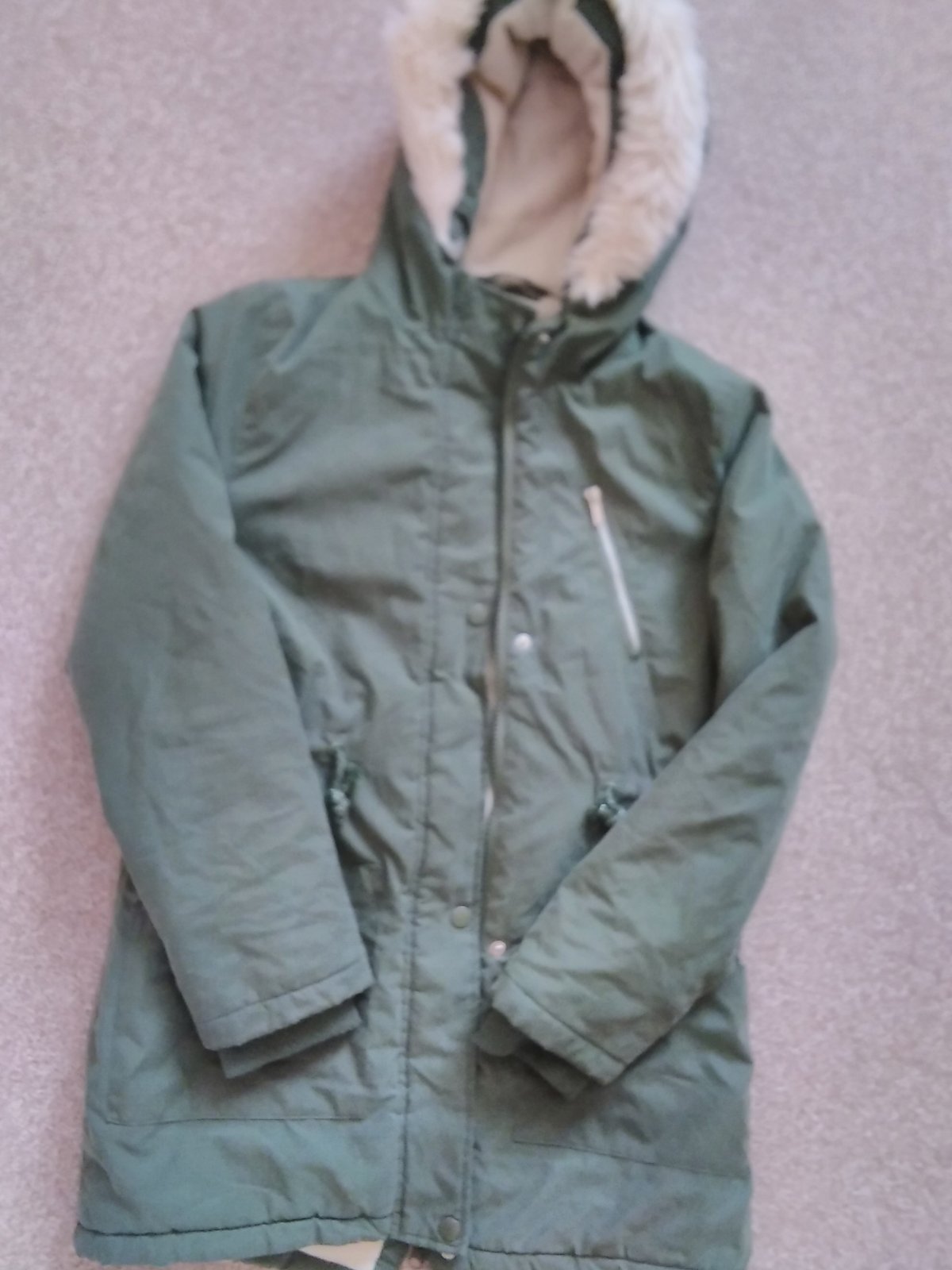 Zimná bunda v dobrom stave. Na pravom rukáve je mierne poškodenie (fotka) ktoré pri nosení vôbec nevidno lebo je na vnútornej strane rukáva. Kapucňa je podšitá mäkkým kožúškom .Veľkosť píše 10-11...