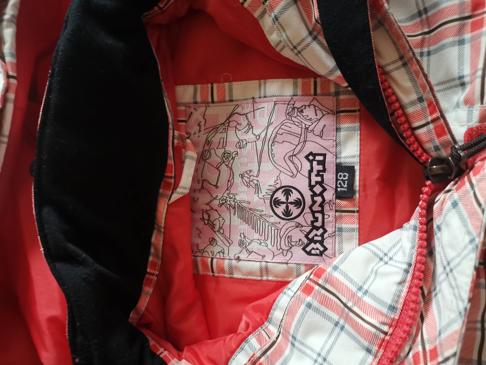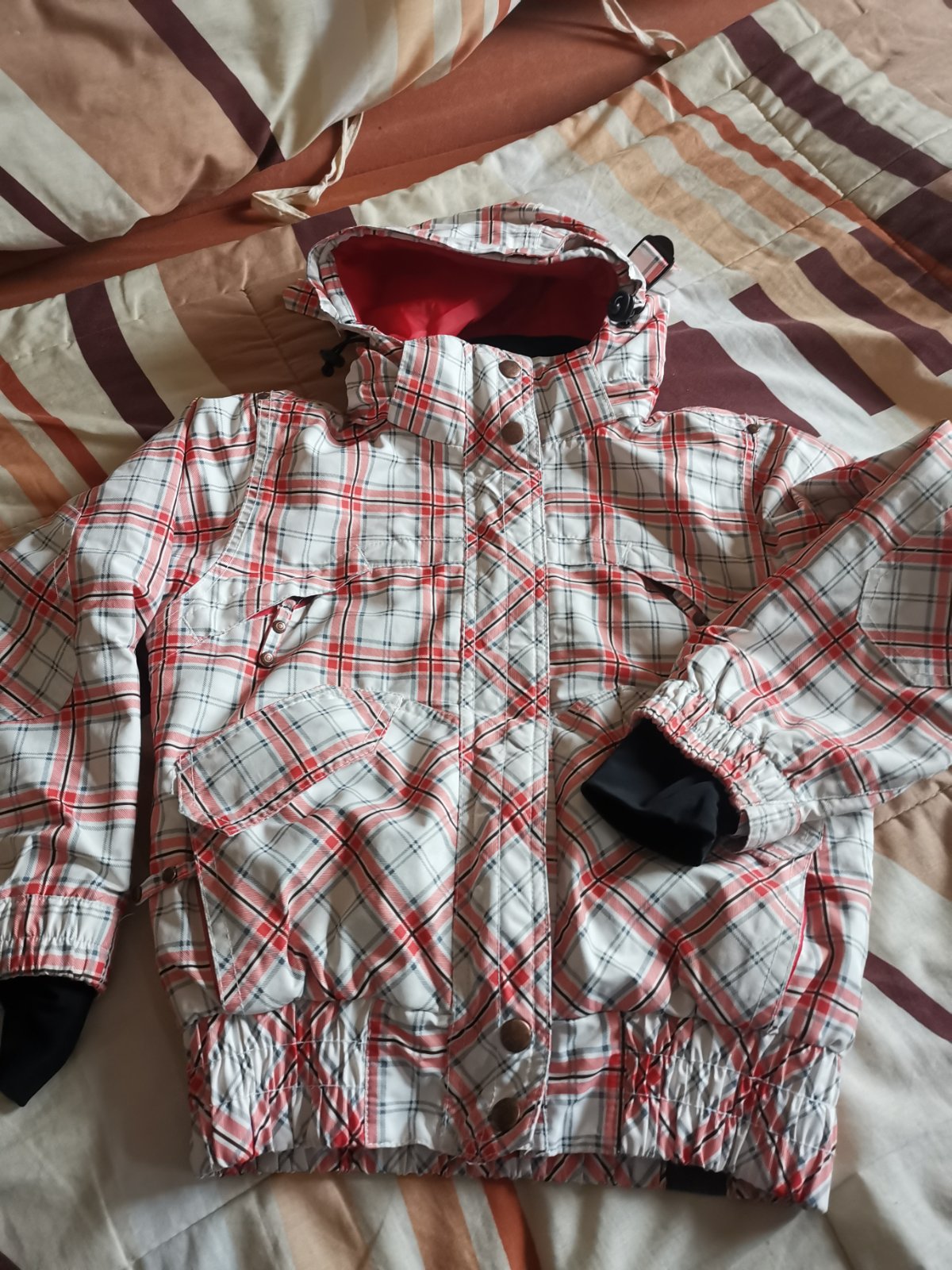 Bielo cervena lyziarska bundicka zn. Brunoty, v128. S lyz.pasom,bez poskodeni