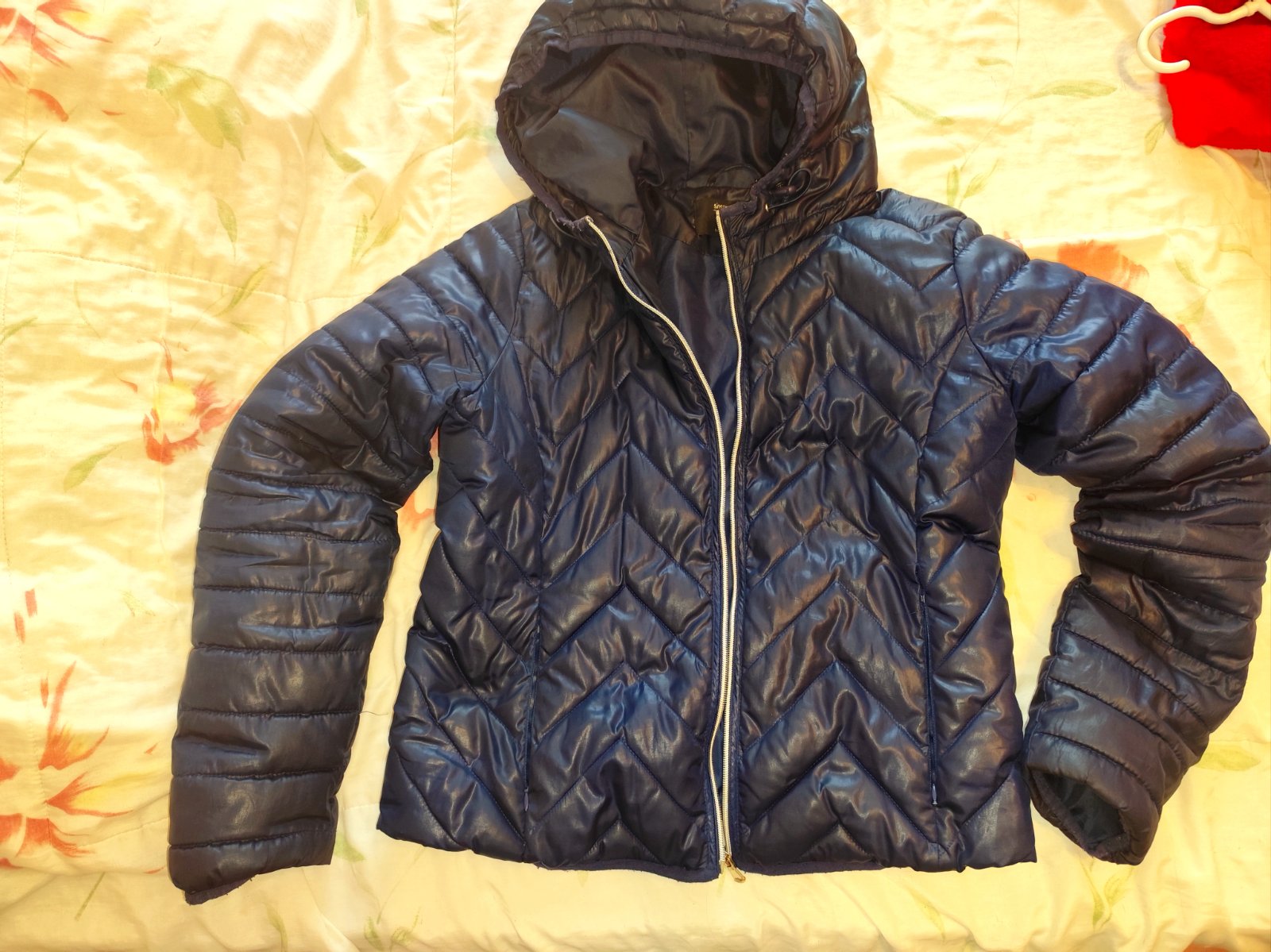 Tmavomodrá bunda s kapucňou prechodná, prešívaná....dĺžka 58cm,pás 2x50cm,rukáv 65cm, ramená 42cm