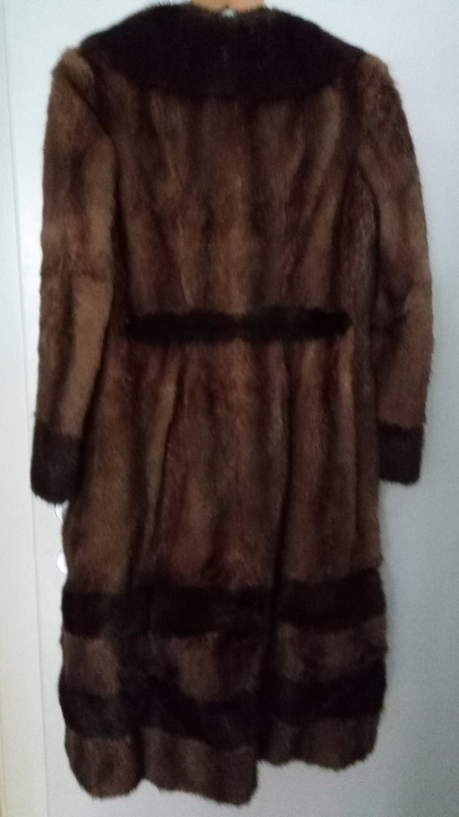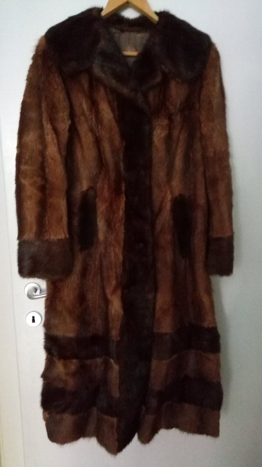 Kožuch je dlhý 120 cm, rukáv je dlhý od ramena 63 cm, od pazuchy 41 cm, šírka ramien 44 cm, nie je na ňom značka výrobcu.