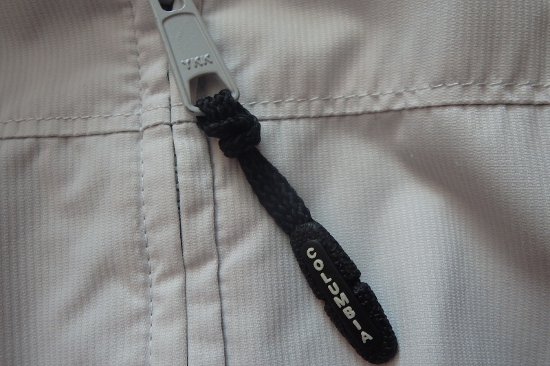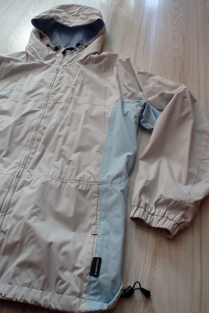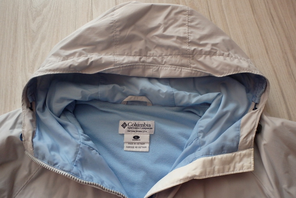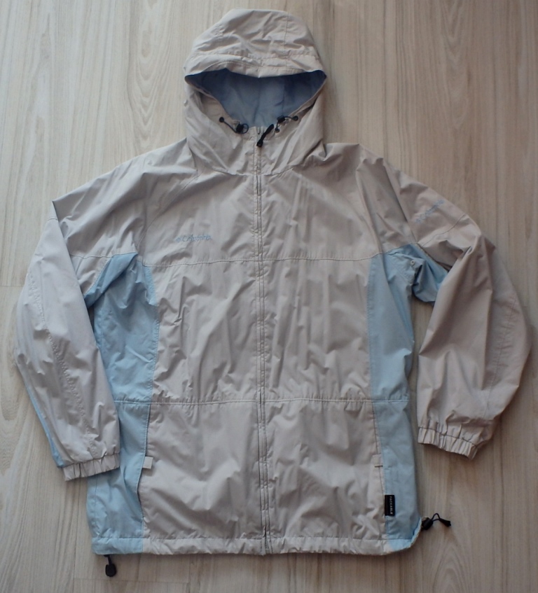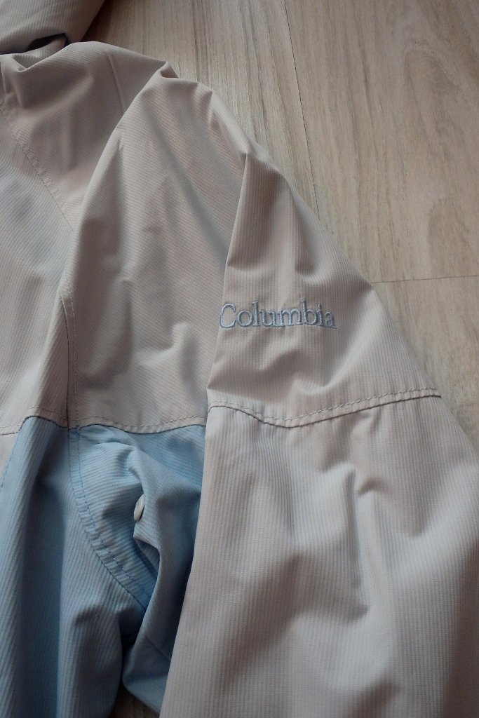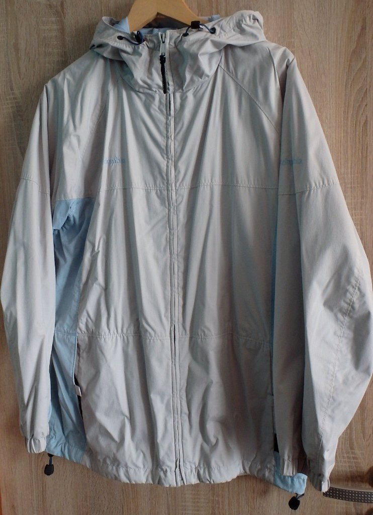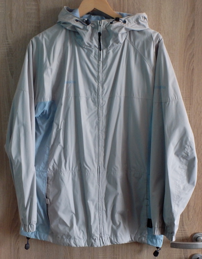Vetrovka značky Columbia s kapucňou, vo farebnej kombinácii prevažne svetlo sivej a svetlomodrej farby.