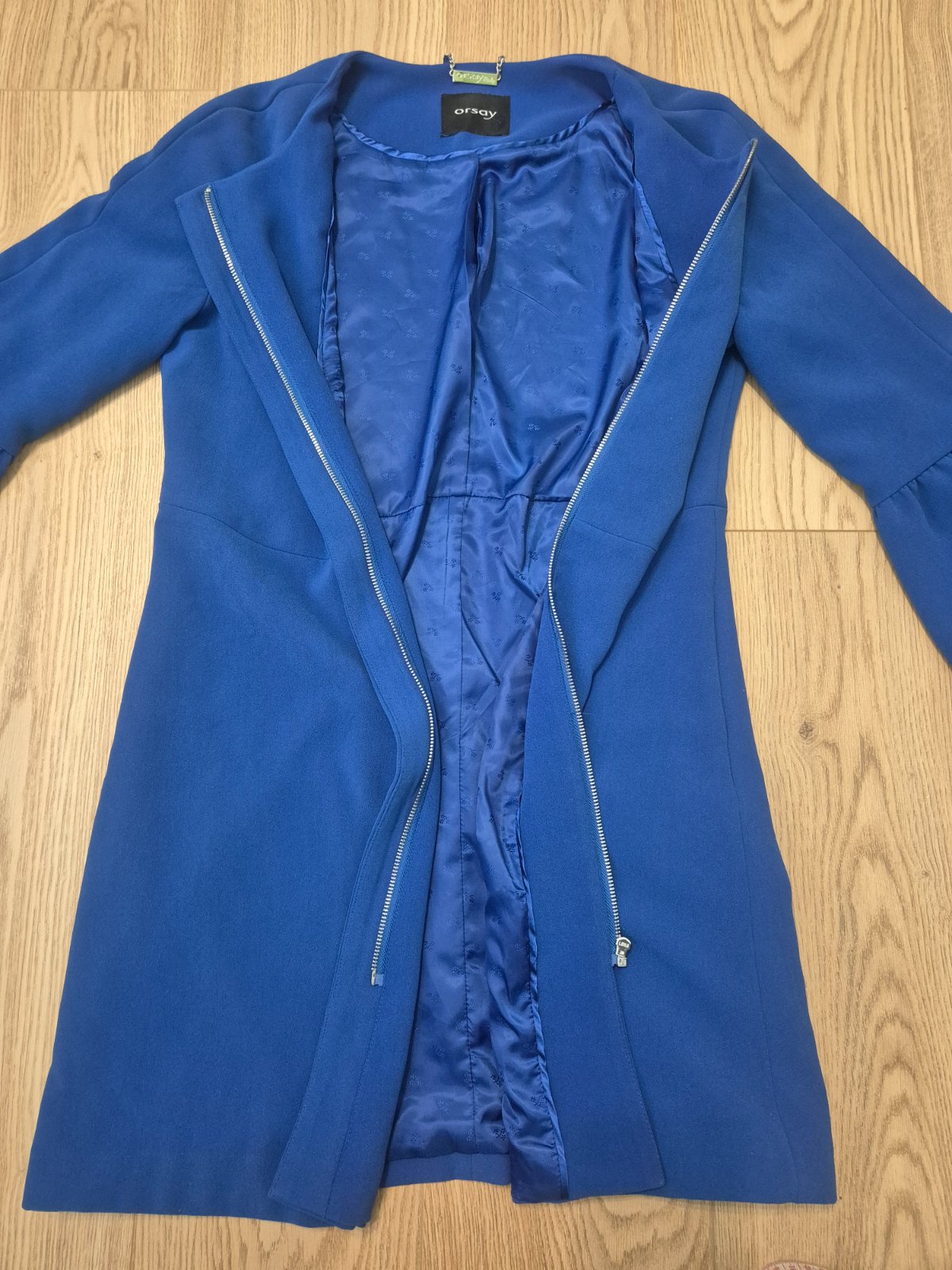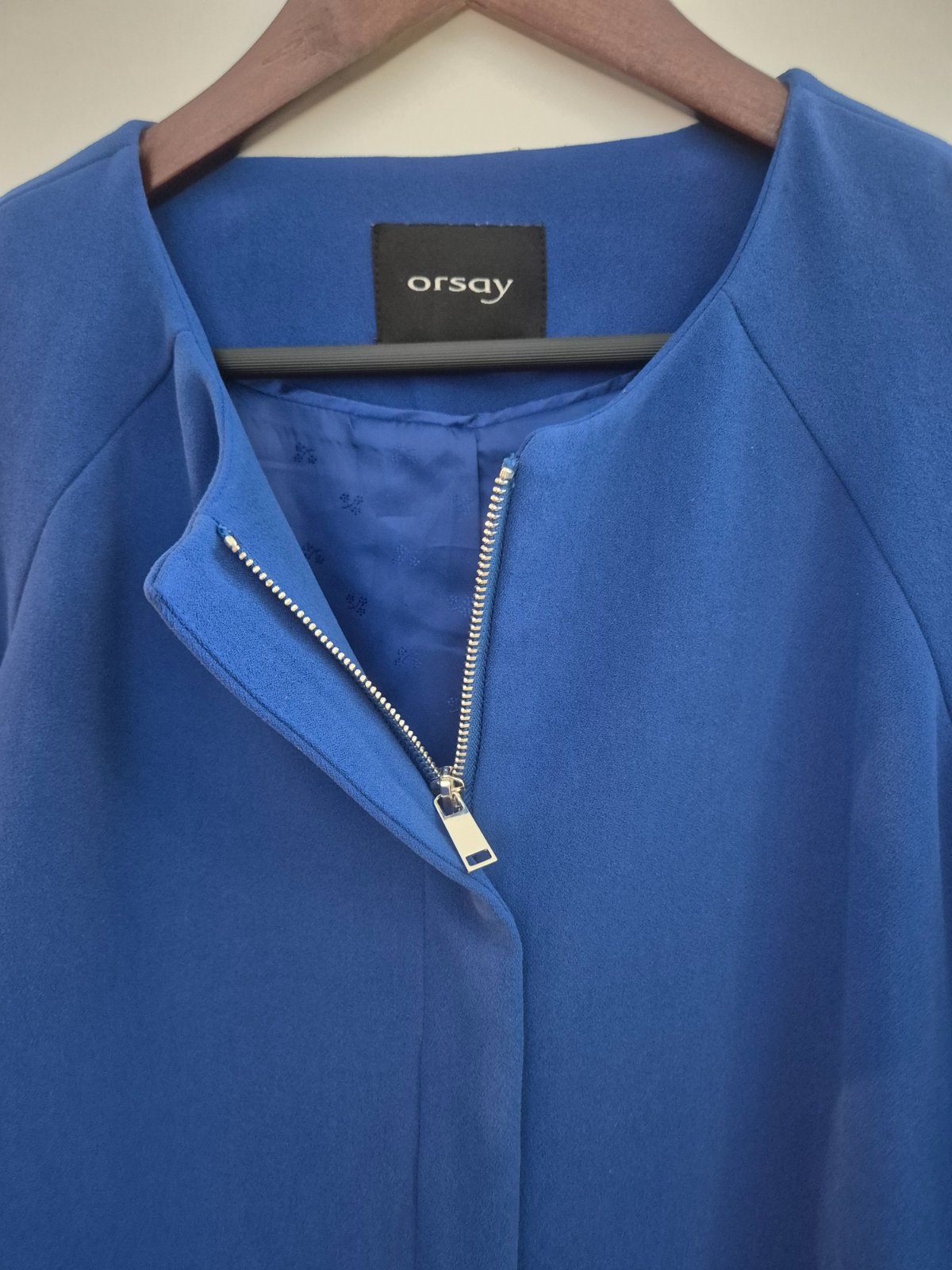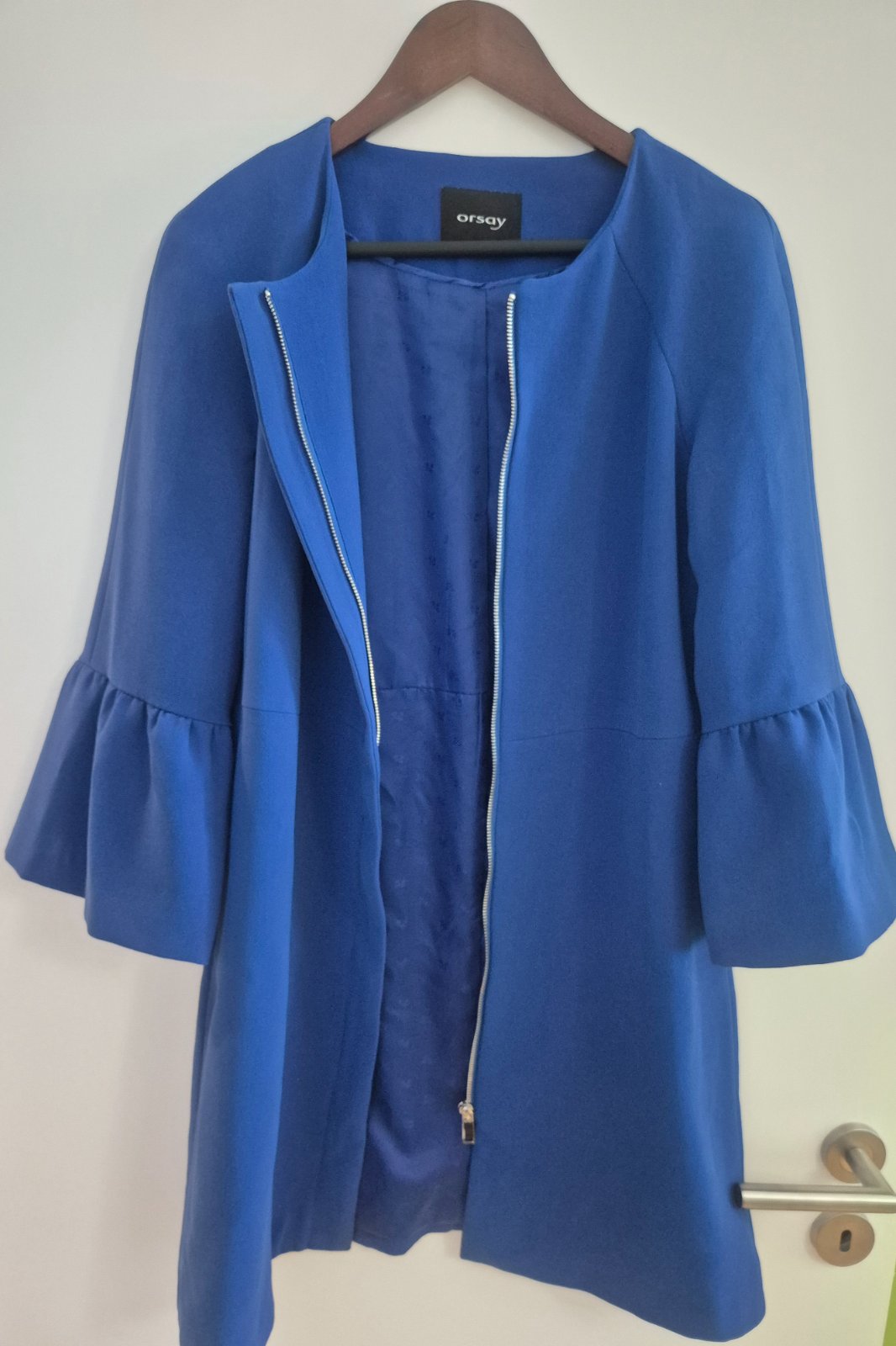 Elegantný kabátik značky Orsay, farba kráľovská modrá. Rukávy 3/4 dĺžky ukončené jemným volánom, lesklá vnútorná podšívka. Štítok odstrihnutý, veľkosť približne 38 alebo M, treba premerať (všetky rozmery viď foto). Tenký, prechodný, na zips. Málo nosený, bez poškodení. Cena aj s poštou. Moje podmienky predaja v mojom popise.