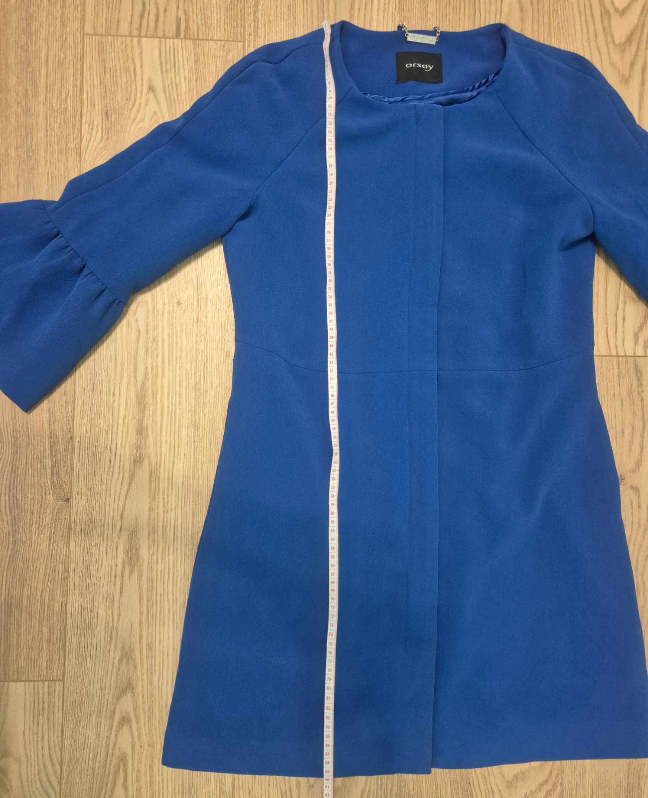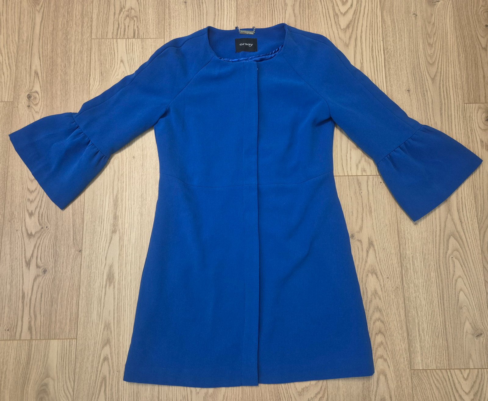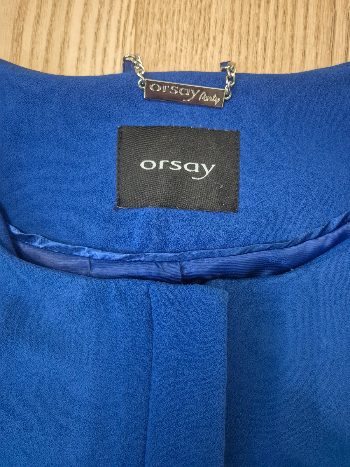 Elegantný kabátik značky Orsay, farba kráľovská modrá. Rukávy 3/4 dĺžky ukončené jemným volánom, lesklá vnútorná podšívka. Štítok odstrihnutý, veľkosť približne 38 alebo M, treba premerať (všetky rozmery viď foto). Tenký, prechodný, na zips. Málo nosený, bez poškodení. Cena aj s poštou. Moje podmienky predaja v mojom popise.