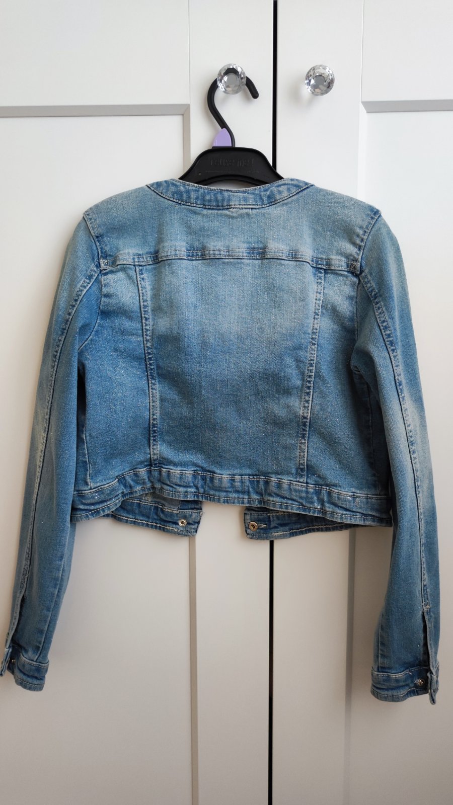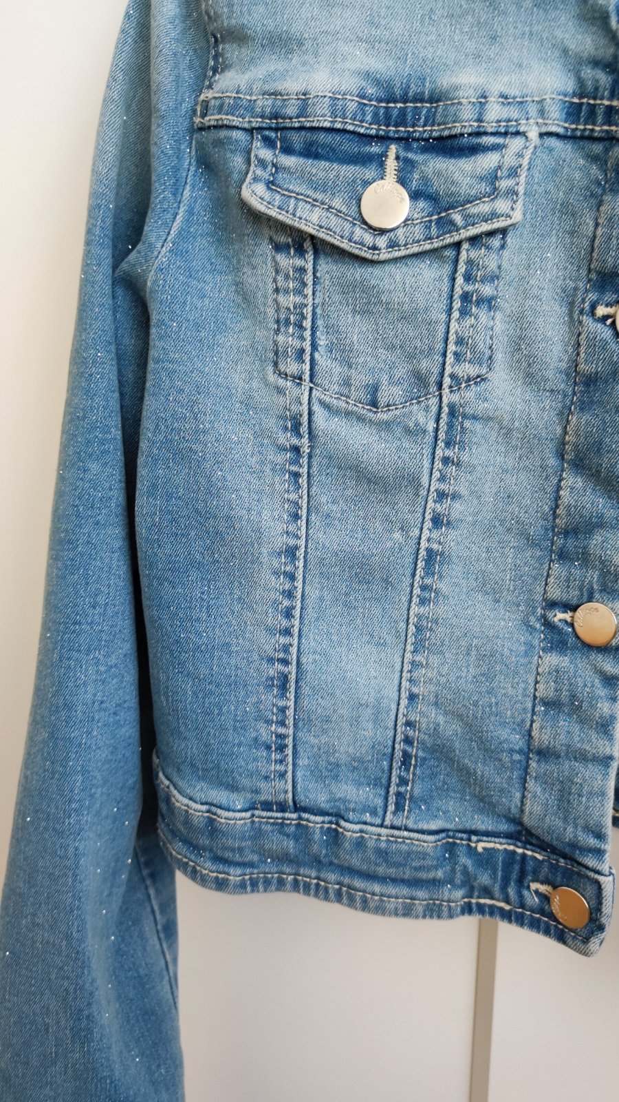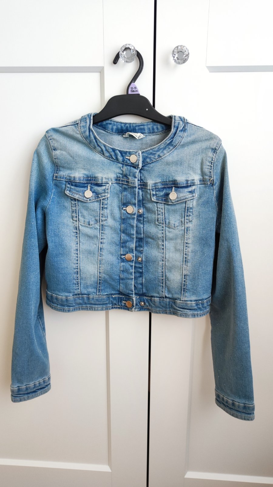 Predám riflovú bundu s drobnými trblietkami, uvedená veľkosť 152/158. Super stav. Rozmery: Dĺžka vpredu je 33,5 cm, dĺžka vzadu - 36 cm. Šírka - 37 cm, dĺžka rukáva od pleca je 56 cm, od goliera 66 cm.