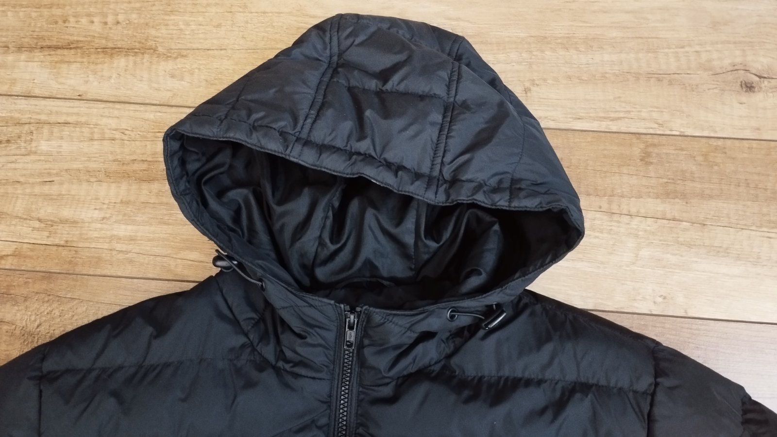 Rovný spodný lem, rovný strih, nastaviteľná kapucňa so stojačikom, bočné vrecká na zips, nášivka s logom.