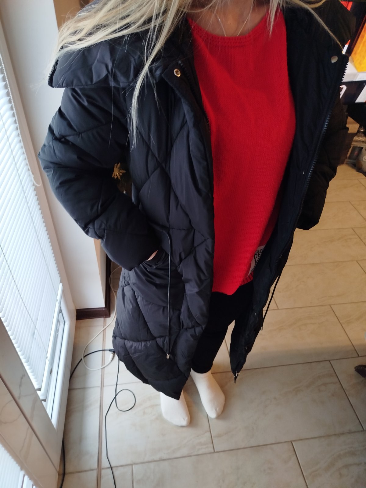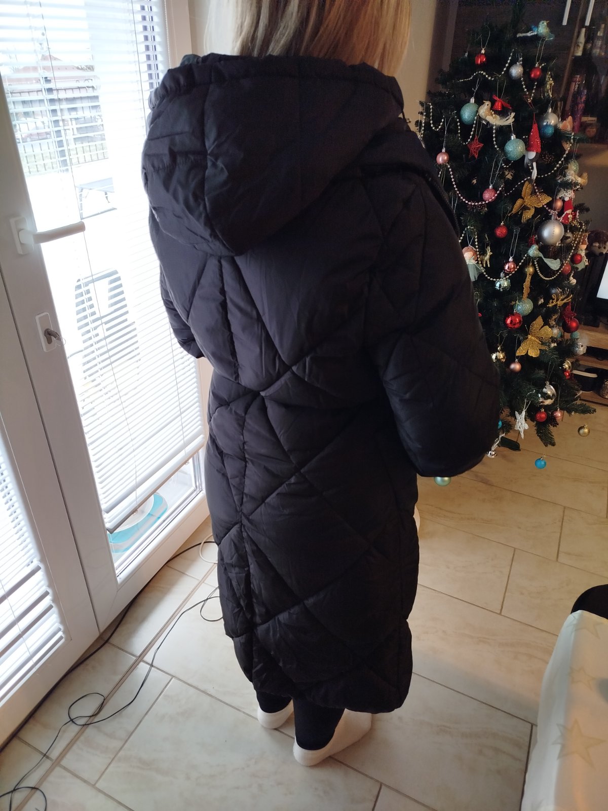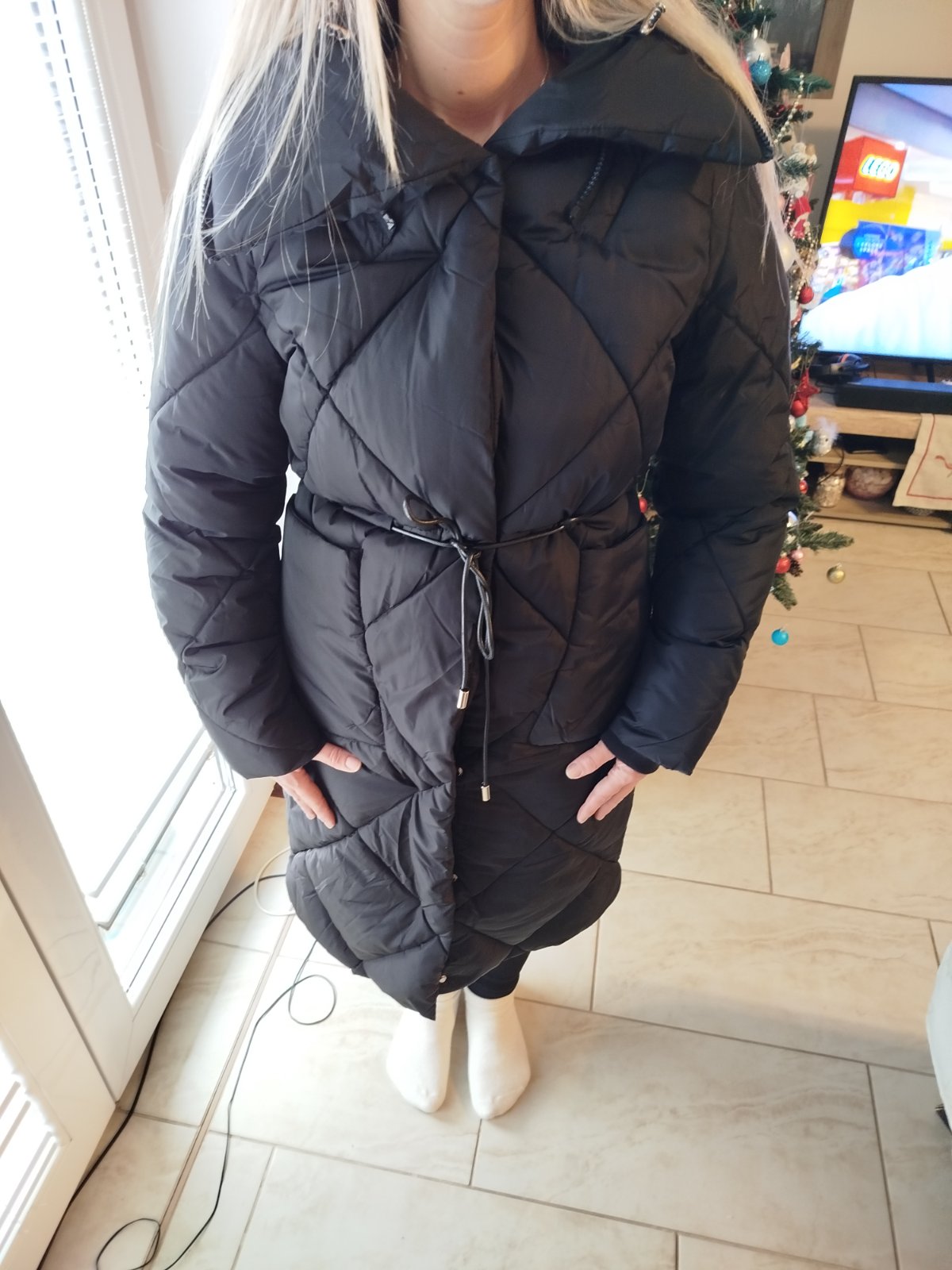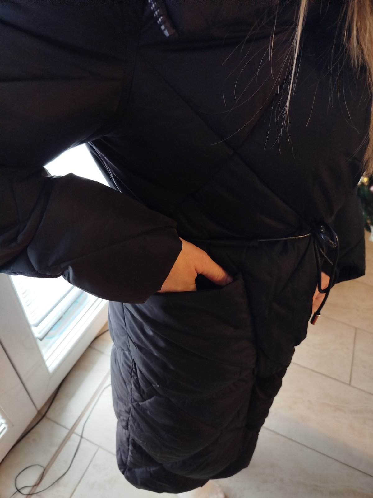 Nová dlhá zimná bunda, veľmi príjemná na nosenie. Žiaľ mne je malá, omylom mi poslali M a ja nosím L. Kapucňa sa dá odopínať a golier upravovať (viď foto).