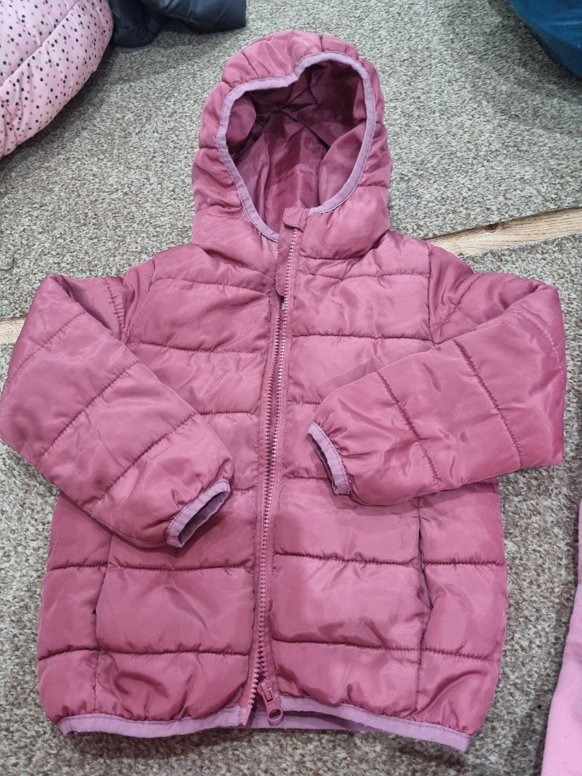 Pekná bunda bez vážnych poškodení.Je zateplená na chrbte jemným flisom.Nie je moc hrubá,takže len do teplej zimy.V páse na gumičku stiahla,takže pekná k šatom,sukni.