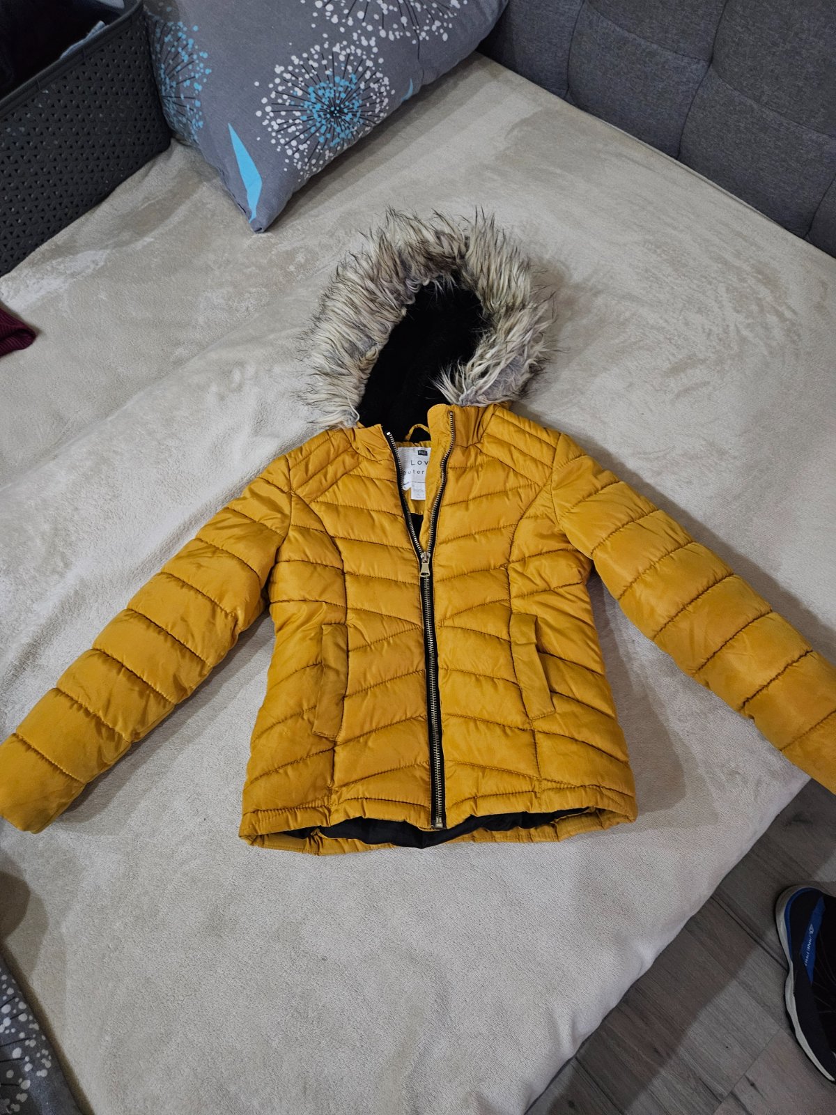 Oblečená asi 3 krát, bez akýchkoľvek poškodení, farba je horčicová, veľkosť uvedená S ale oblečie v pohode M, má vnútorné vrecko, je teplá, pohodlná