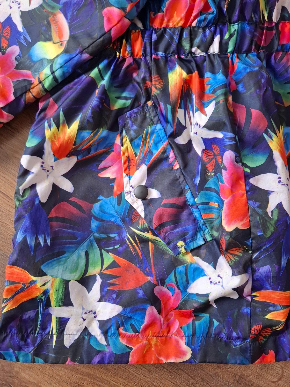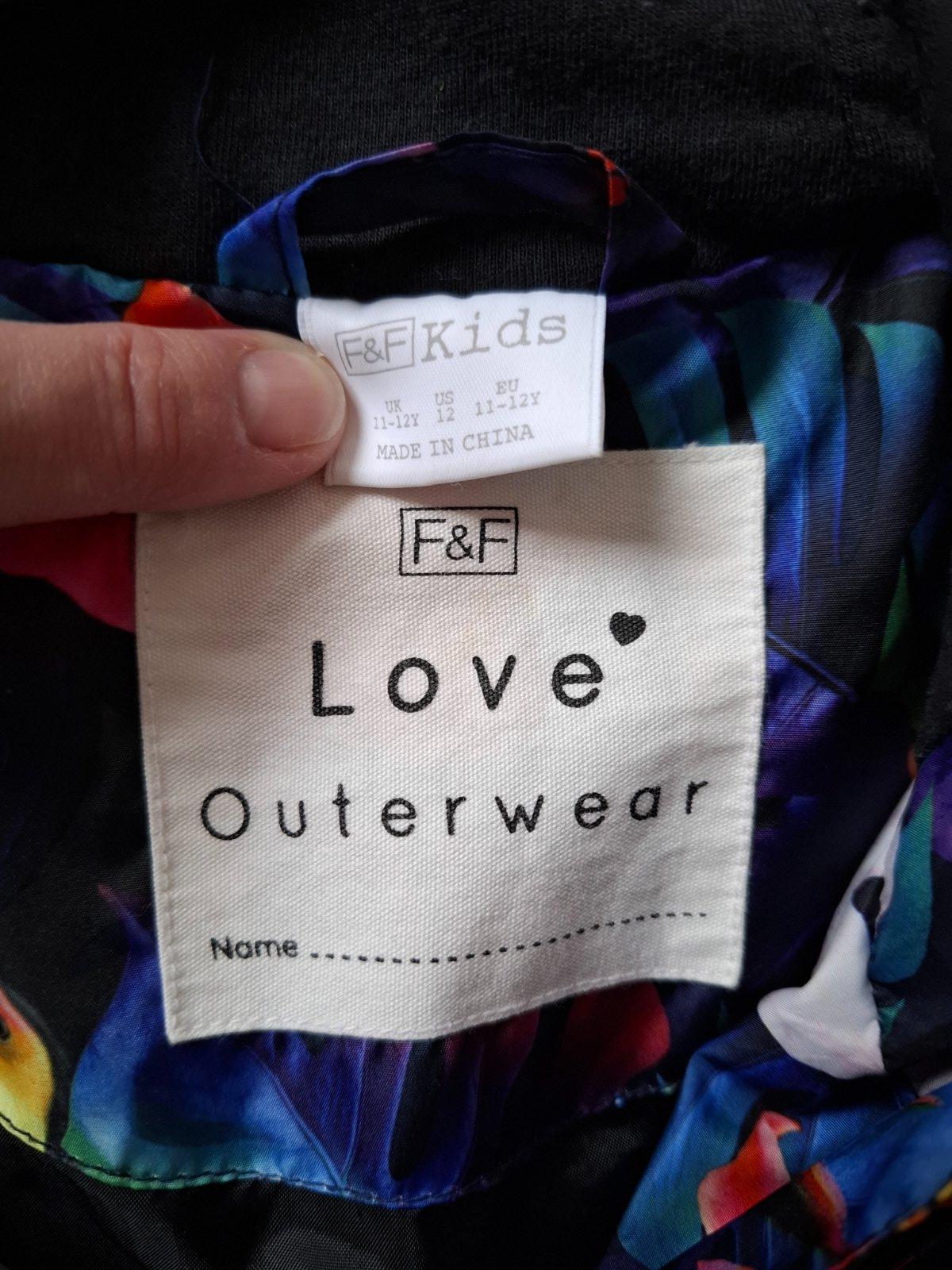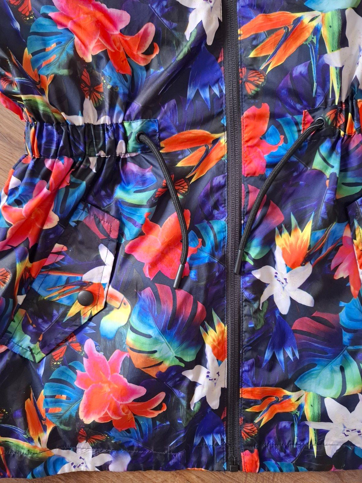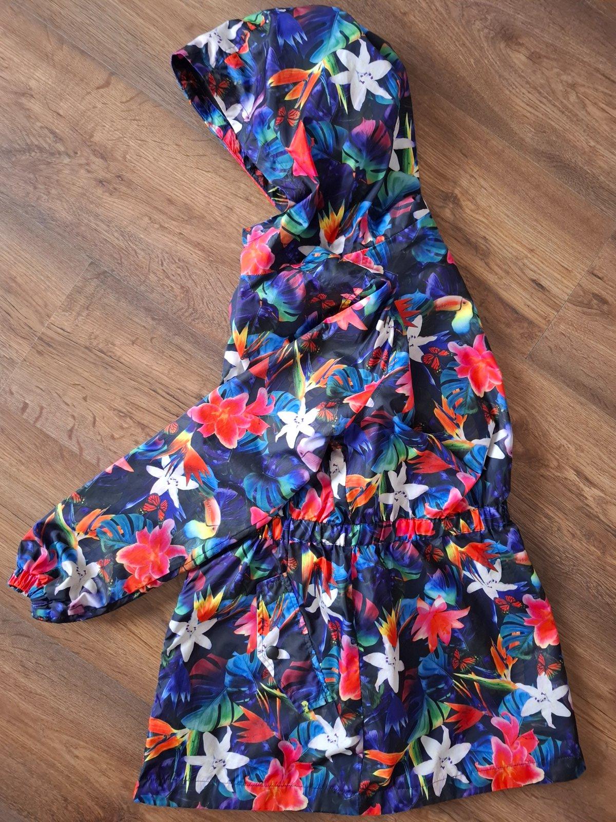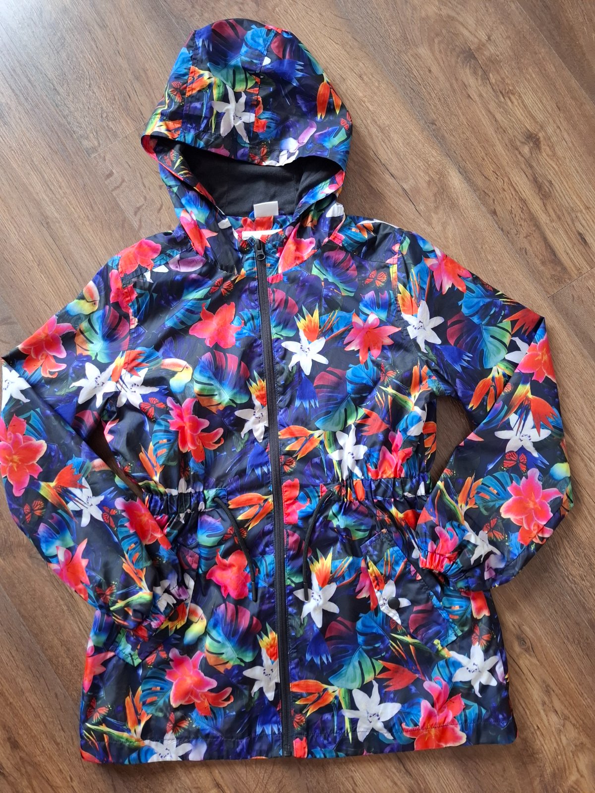 Predám krásnu ako NOVÚ ľahkú bundička,len taká šuštiaková,v páse na stiahnutie šnúrky,v predu dva precká na cvoku,potlač kvetovaná.Celková dĺžka je od krku 67cm,šírka meraná pod pazuchiu je 48x2,dĺžka rukáva merané od krku je 66cm.Značka je F&F,veľkosť je na 11-12 r.Cena 7 eur + pošta 1,80 eur.