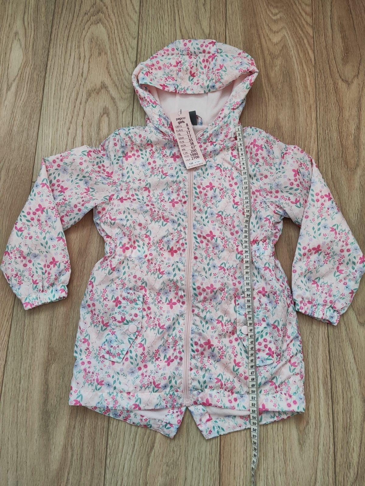Dievčenská prechodná bunda s kapucňou, jemne zateplená tenším flísom. Zapínanie na zips, vpredu vrecká na ruky. Vo veľmi dobrom stave, rozmery nafotené.