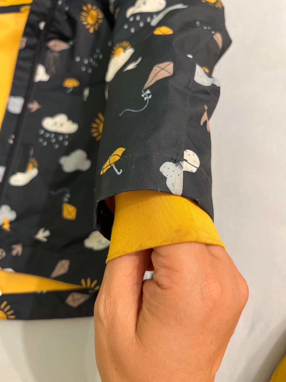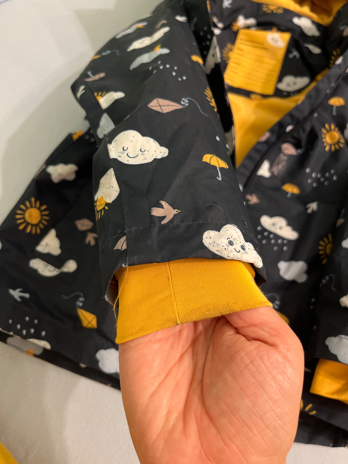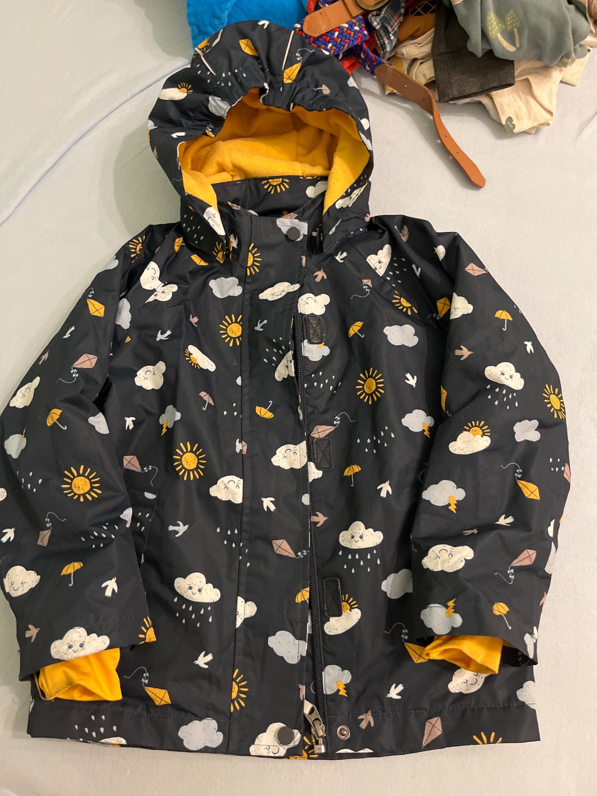 tepla prechodna bunda, v dobrom stave, iba rukavy su trochu spinave, neskusala som to nejako specialne cistit, len je klasicky vyprata na 40 stupnov. Bola malo prana a nebola v susicke, takze je funkcna. sedi na velkost 116, vdaka manzetam na rukavoch vydrzi dlho.