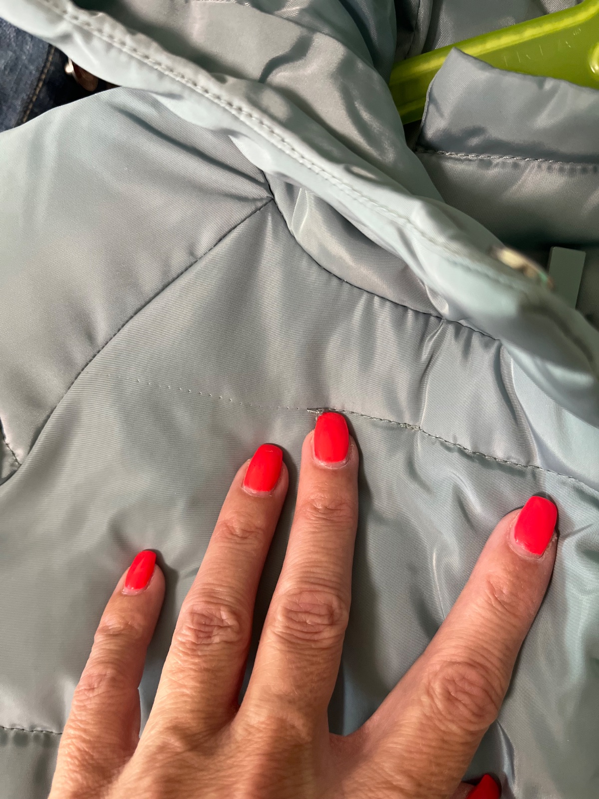 Zimná bunda teplá, pri vrecku 2 dierky vid. foto. Šikovná mamina zašije, prípadne našivku a ešte poslúži, zateplena flisom.