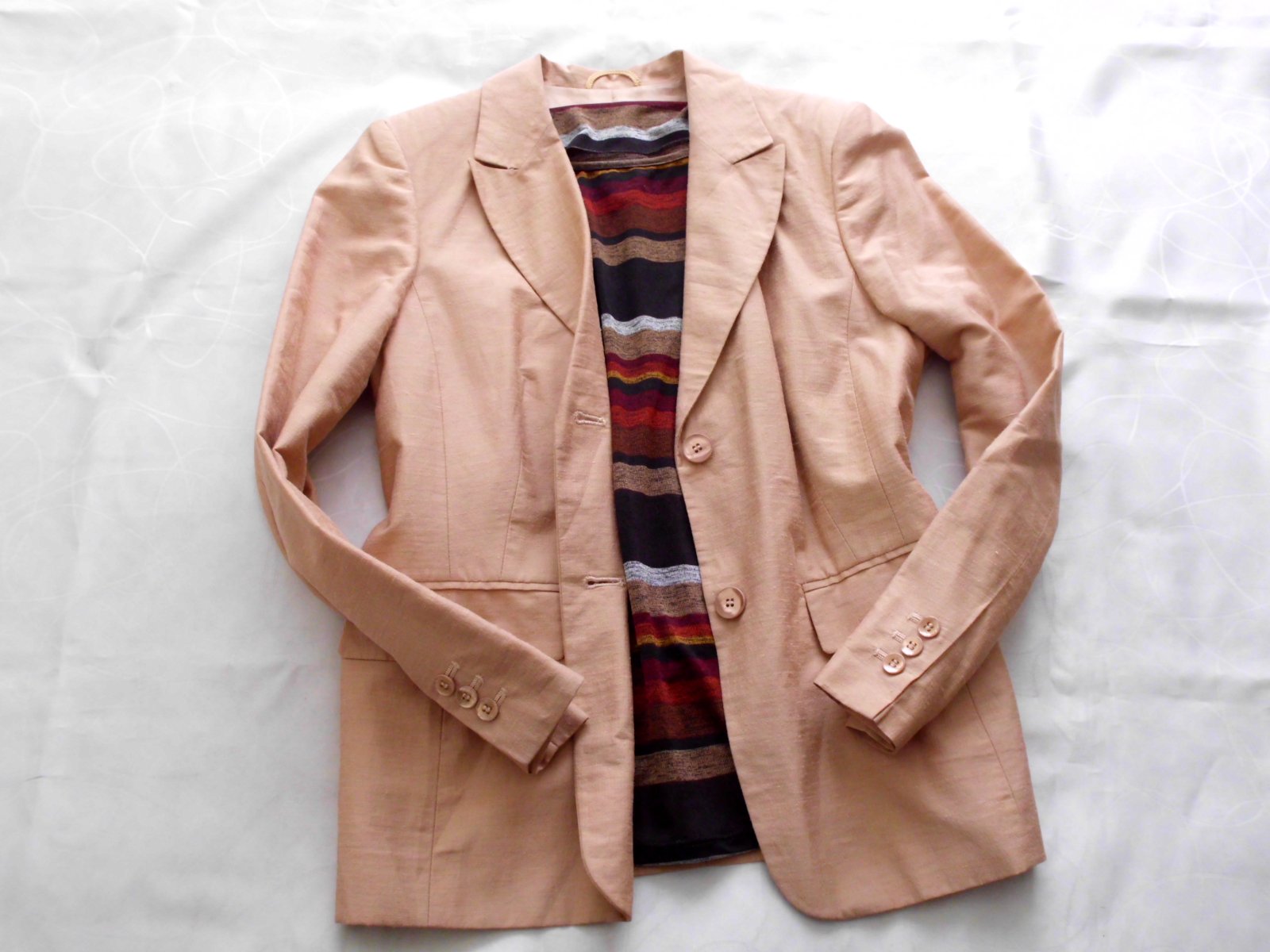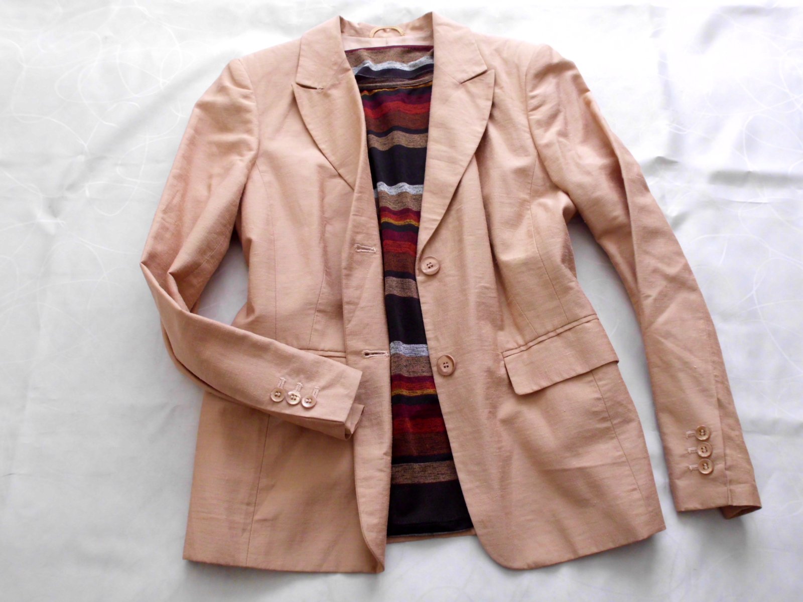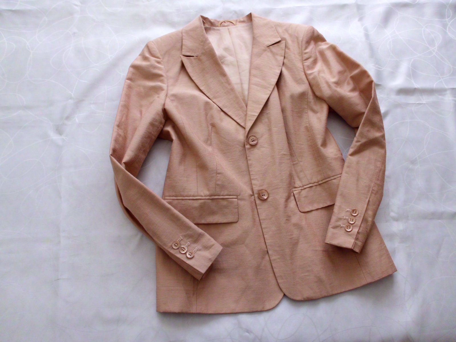 Predám dámske kvalitné sako s ľanom vel. M-L , dĺžka 66 cm, šírka 49 cm, rukáv 61 cm, celé podšité podšívkou , príjemný materiál , 2 vonkajšie vrecká , pekná bledohnedá do zlata farba , 2x krát oblečené, 100% stav