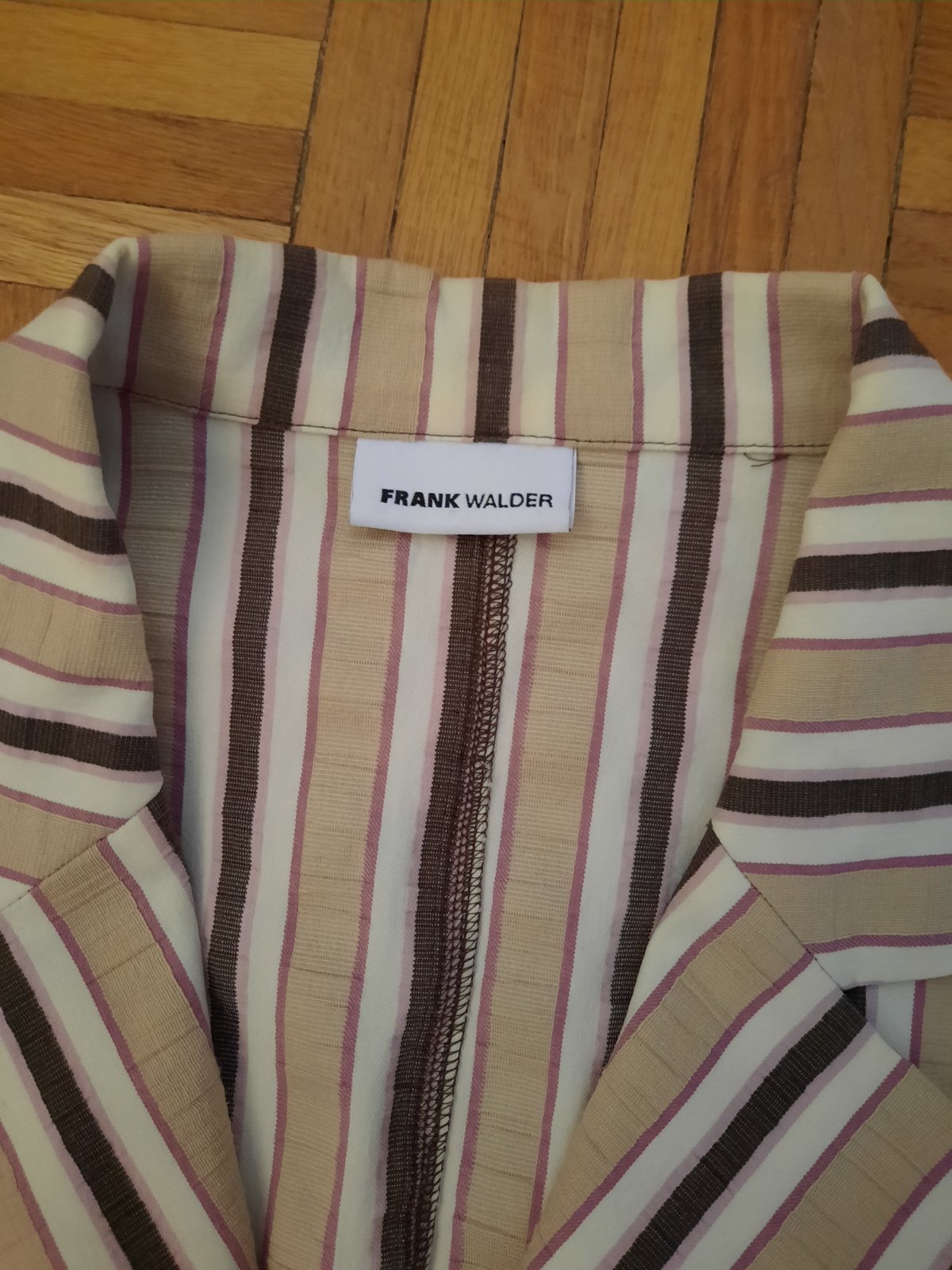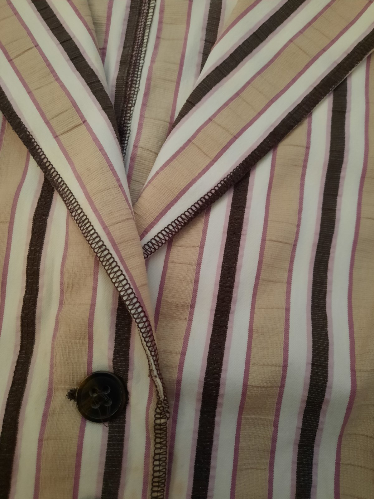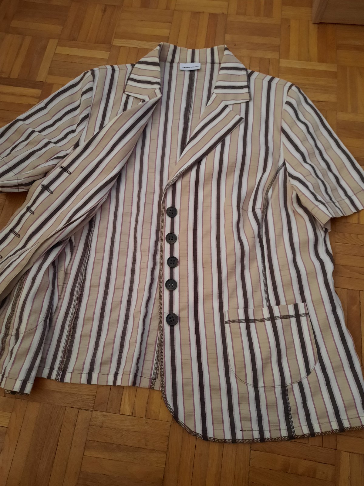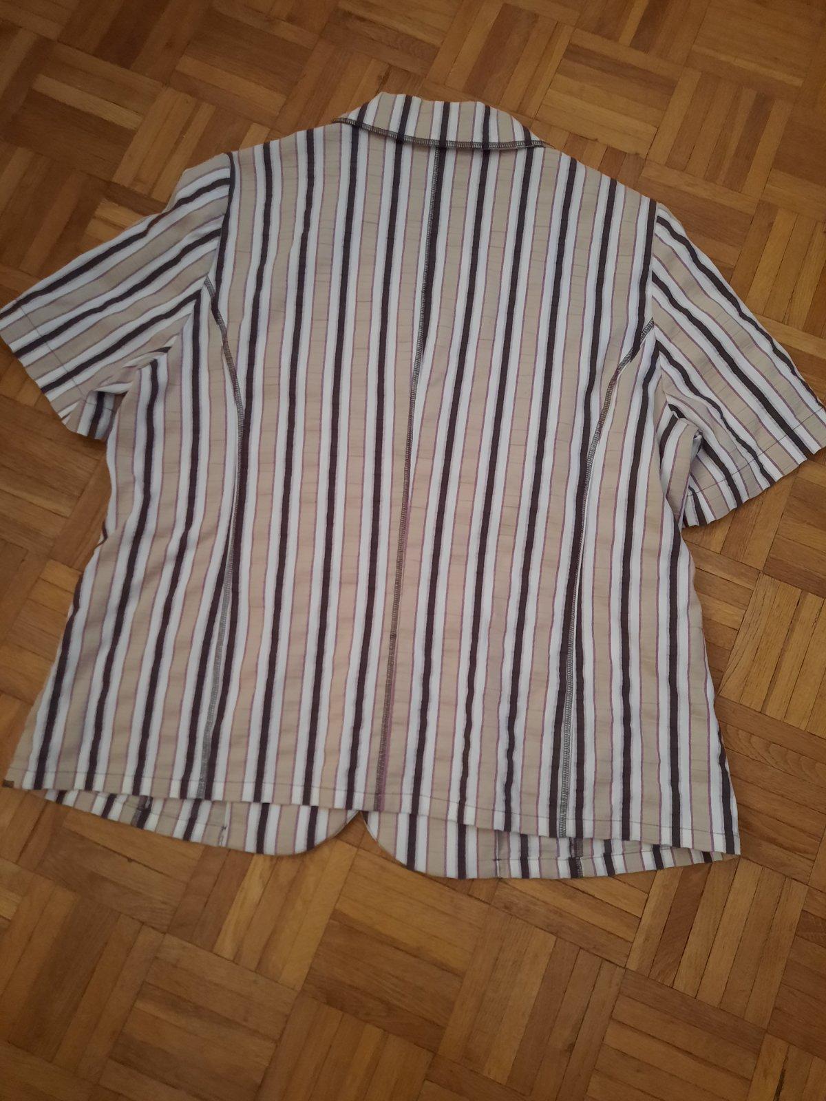 Luxusný letný blejzer, zapínanie na gombíky hnedo-béžovej farby, bez podšívky, v páse šnúrky na sťahovanie, materiál 55% viskóza, 35% ľan, 10% metal vlákno, vypracovaná do detailov, ako nová. šír...