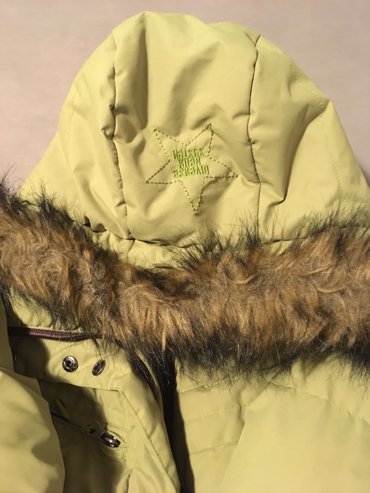 Športová, lyžiarska bunda nosená. Nosenie je vidno zvnútra, no nie je to nič strašné. S odnímateľnou kapucñou. Dĺžka 62 cm a šírka pod pazuchami 47x2 cm.