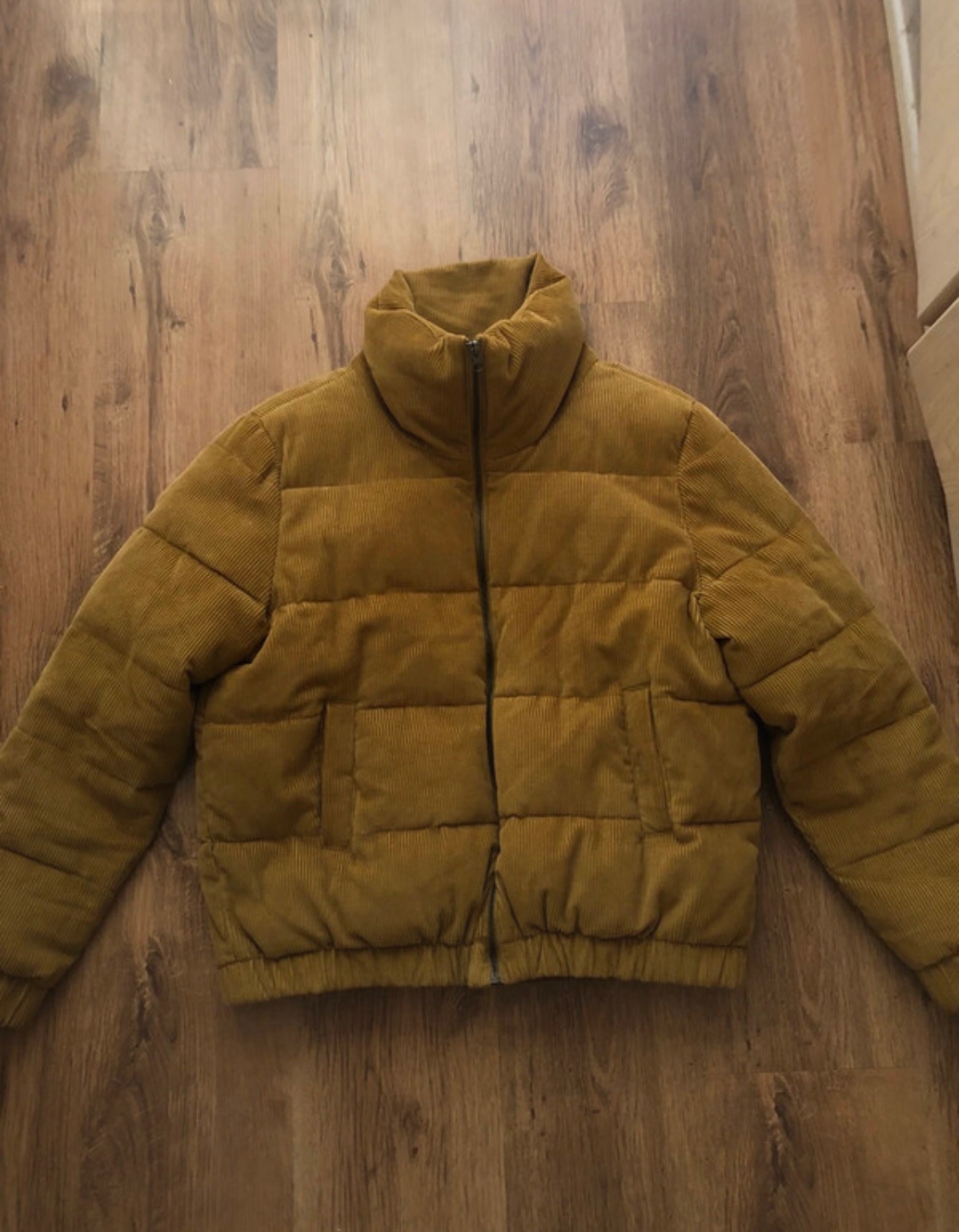 Styliva tepkucka bunda na zimu, okrovej farby, ma krasnu sytu oranzovo horcicovu farbu. Je na patwnty, ale zimu nevpusti dnu. Ja som vyska 168cm ma ju pi stred zadku, dlzka je 60cm. Je to standardn...