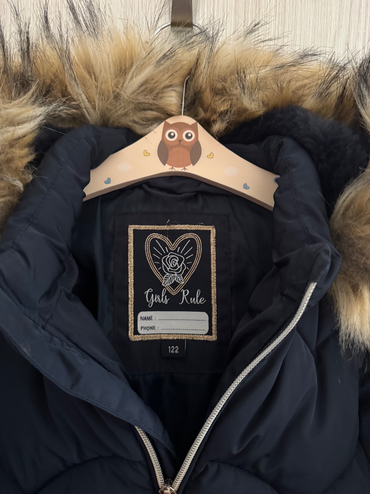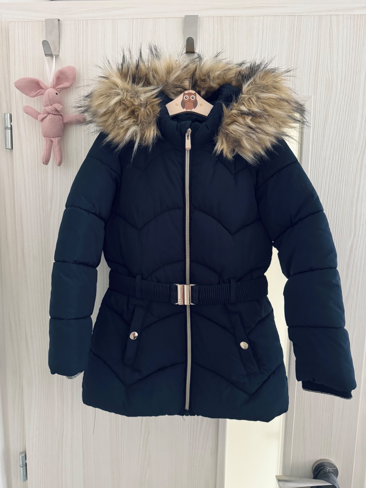 Tmavomodrá zimná bunda s opaskom a kožušinou 122, nosená, ale nenašla som poškodenia, len na opasku asi škrabanec, viď foto