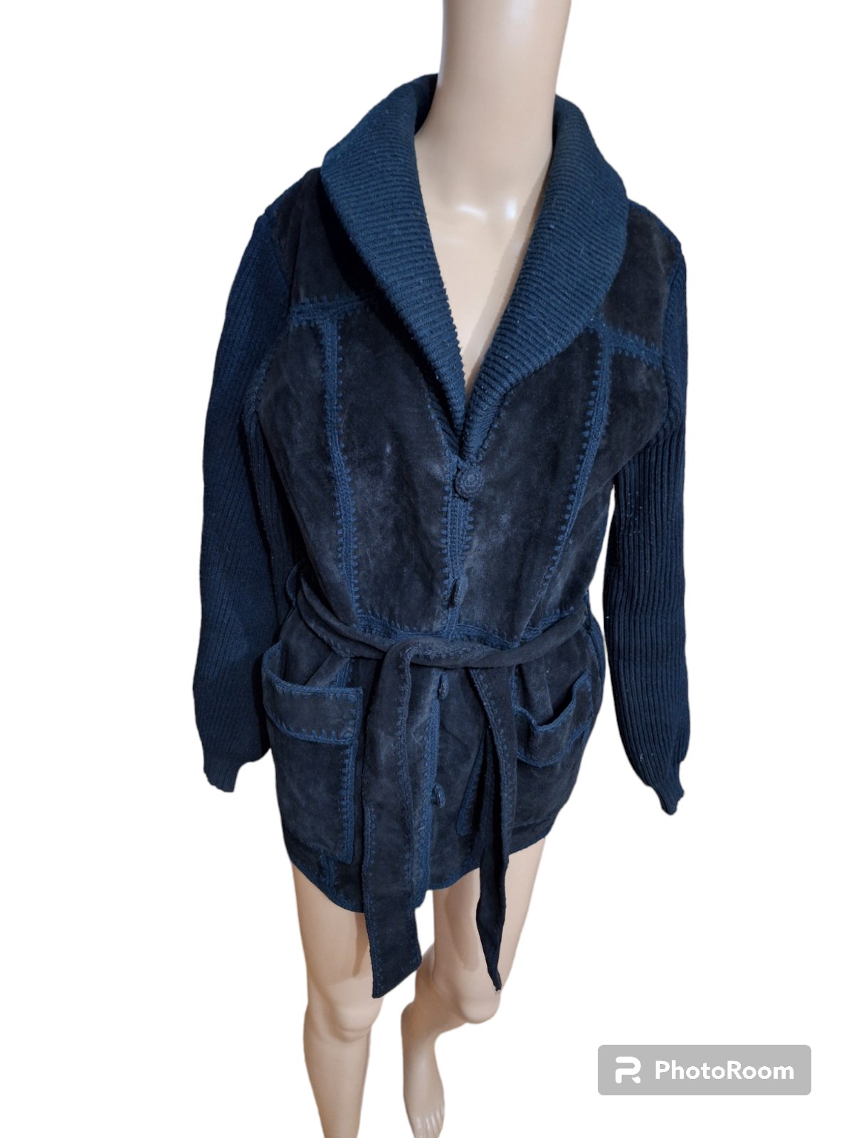 Dámska kožená bundička s pletenými rukávmi značky Majestic. Okolo pása je kožená šnúrka. Zapínanie je na gombíky. Dĺžka je 70cm,obvod hrudníka je 94cm a obvod pása je 88cm. Dĺžka rukáva je od krku 65cm