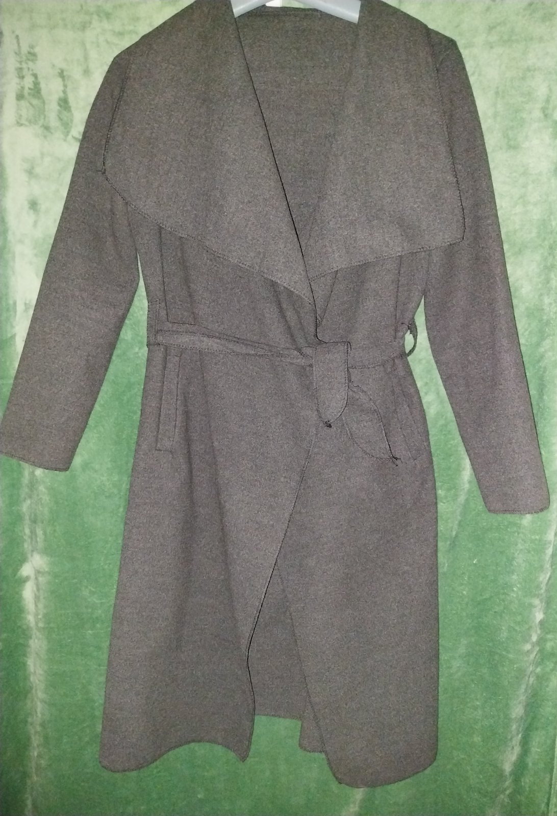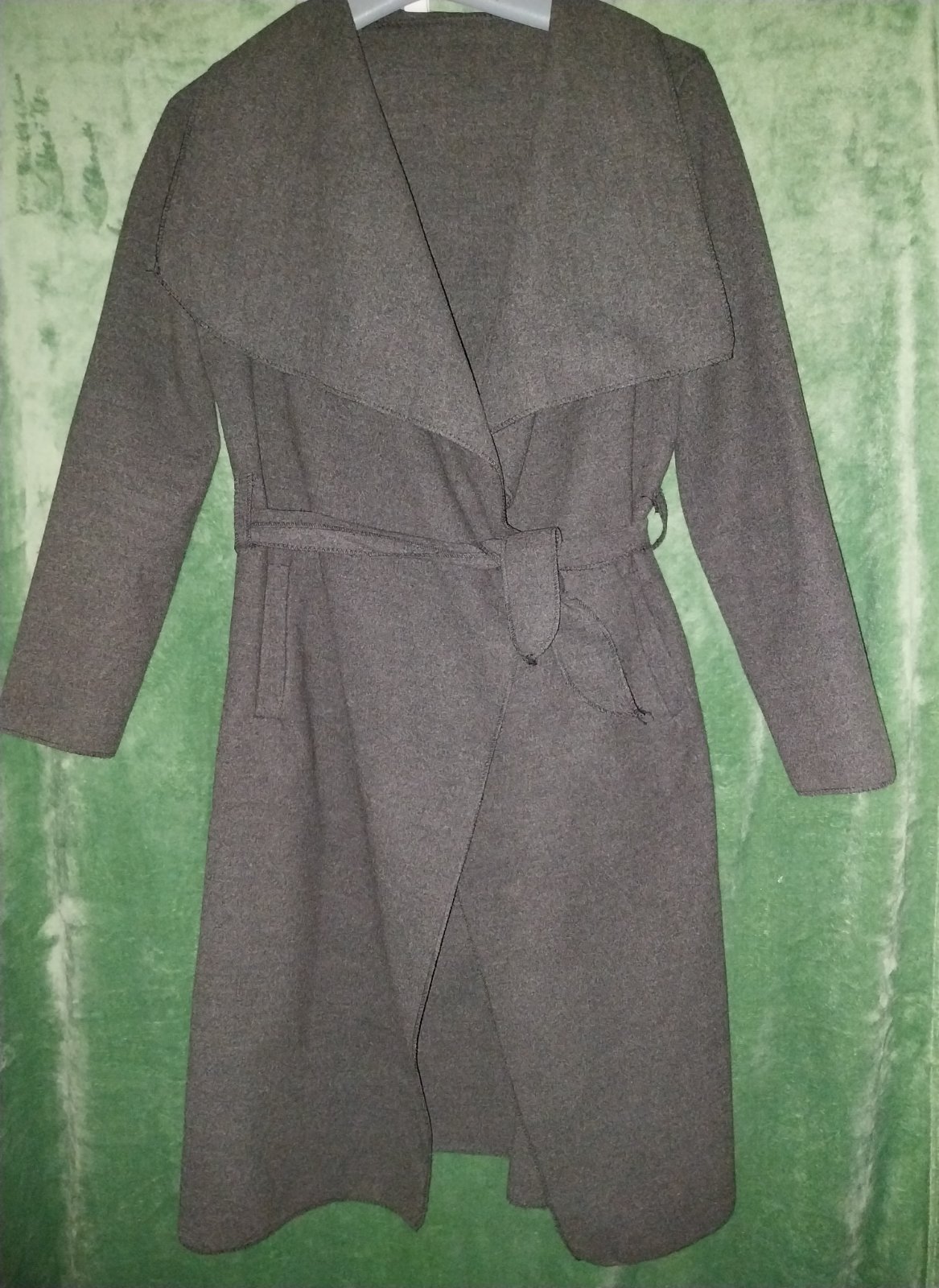 Sivý kabát s opaskom na zavinovanie - bez zapínania. Nepodšitý, vhodný na prechodné obdobie. Top stav. Sedí S/M/L