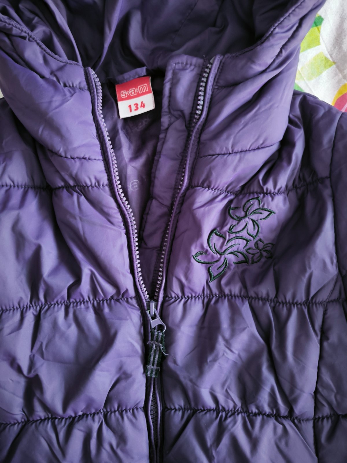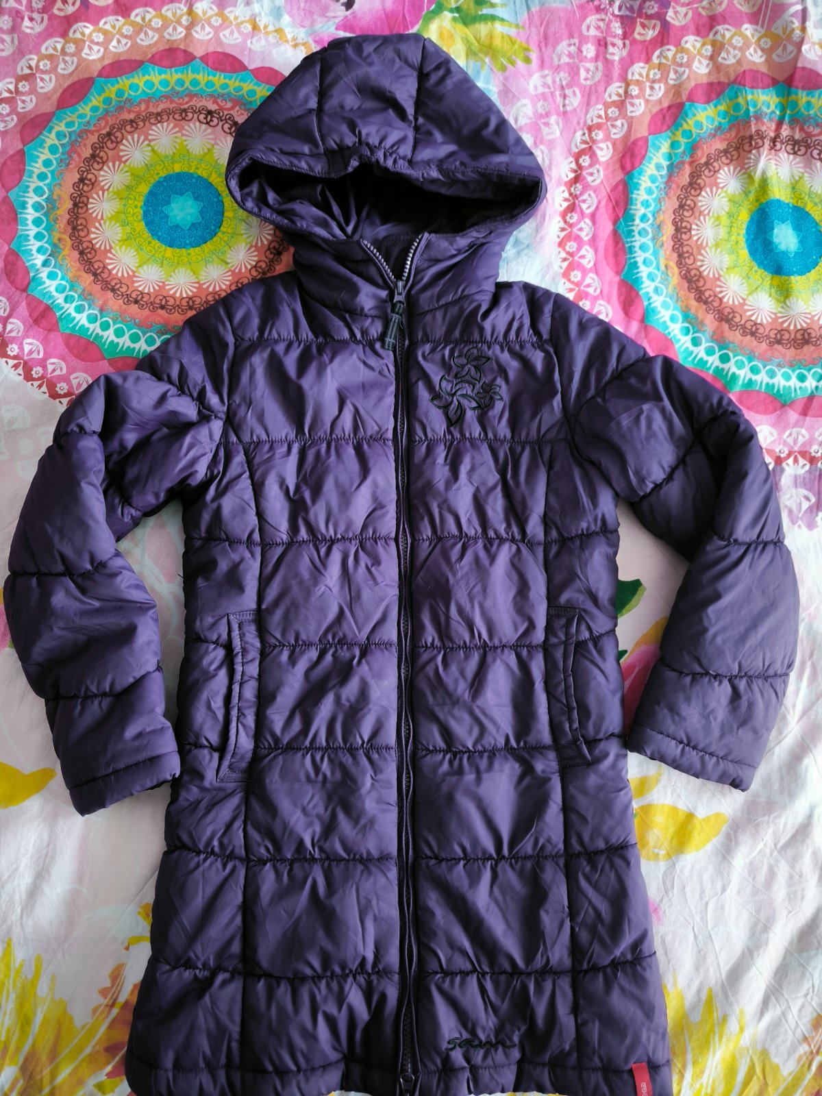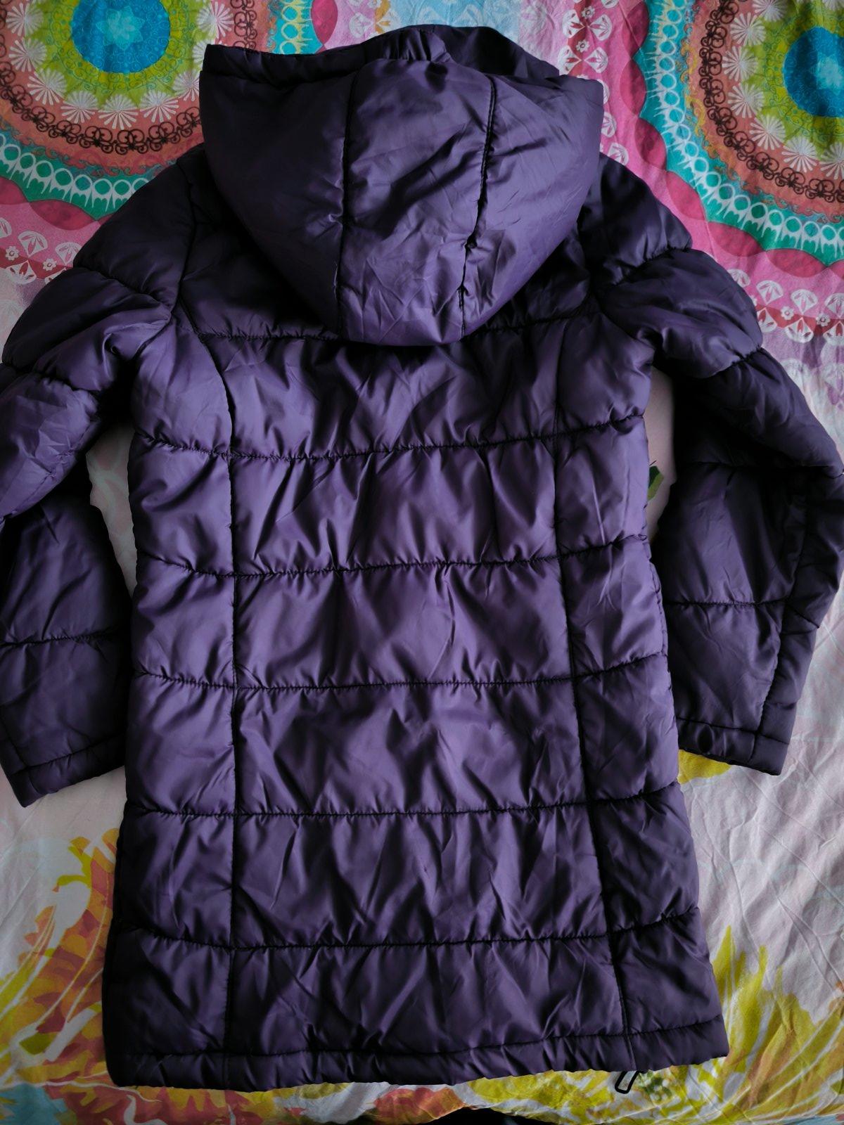 Krásna fialová bundička vo veľmi peknom stave, vzadu jemné zatiahnutie, nie je tam dierka. Pri nosení to ani nevidieť.