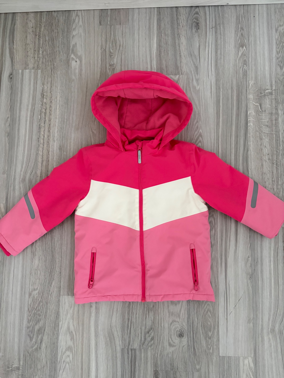 Veľkosť 116, no sadne aj na 116/122. Bundička je teplá, v top stave. Z vnútornej strany rukávu má jemnučko modré, veľmi slabo to vidno, ani sa to nedá poriadne odfotiť, len upozorňujem, pre tých kt...