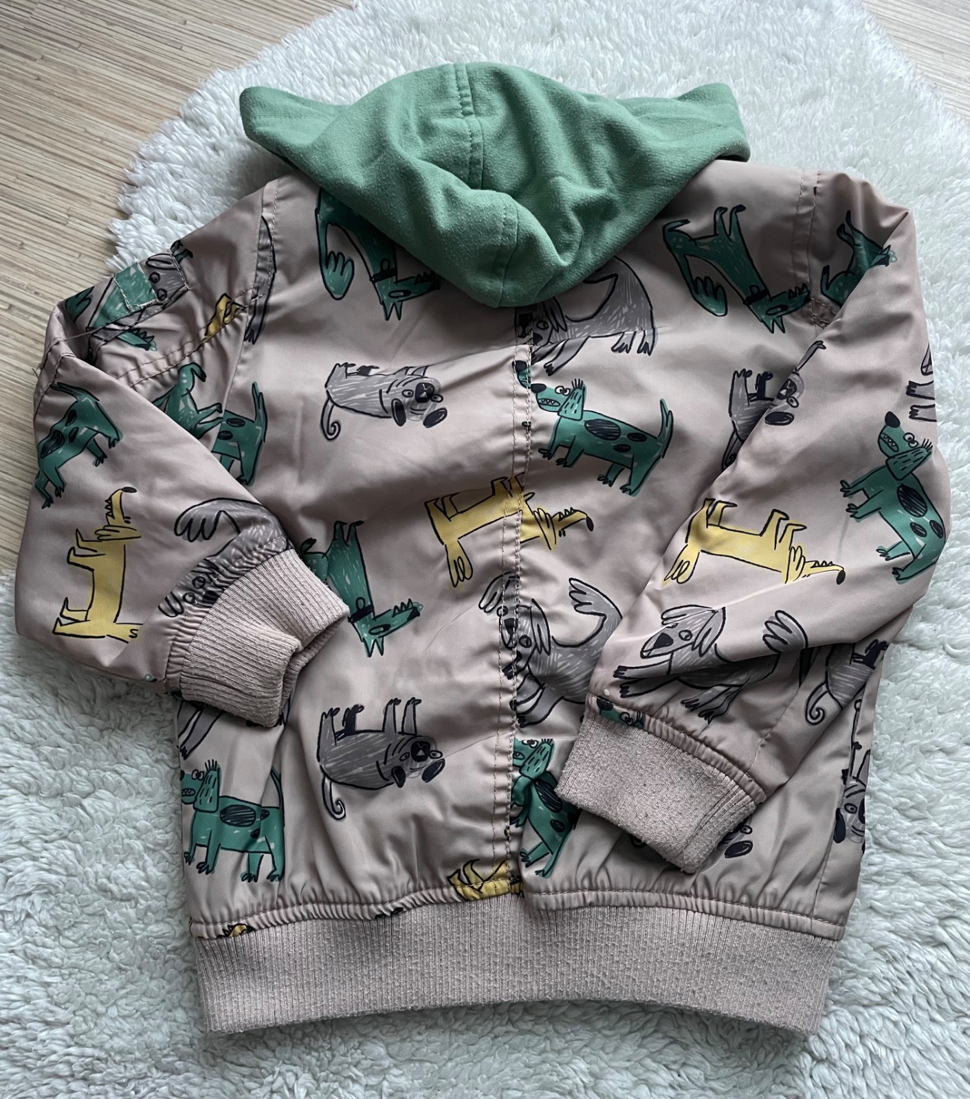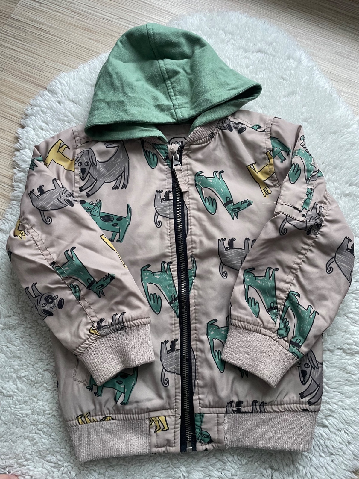 Tenucka bomberka capucino farby so farebnymi psikmi, doplnena o zelenu odnimatelnu mikinovu kapucnu, na zips, predne vrecka, nosena, bez flakov a zadretu, len kapucna a patenty maju zmolky. Cute kusok.