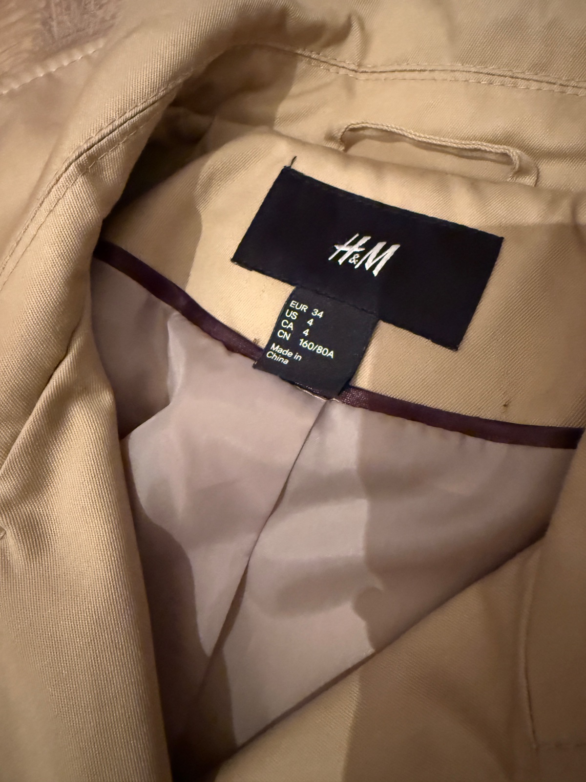 Krásny Béžový trenčkot / kabát s viazaním v páse. Vhodný na jeseň a jar. Malinko nosený, stav 10/10. Veľkosť XS, značka H&M.