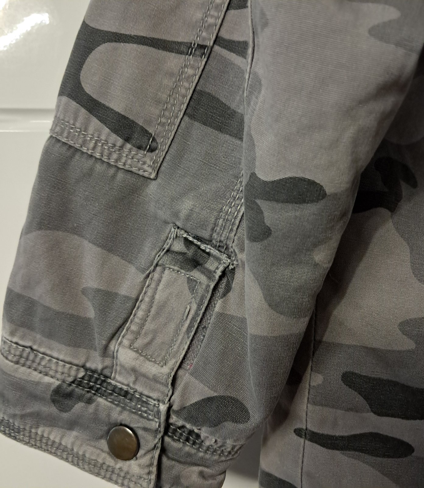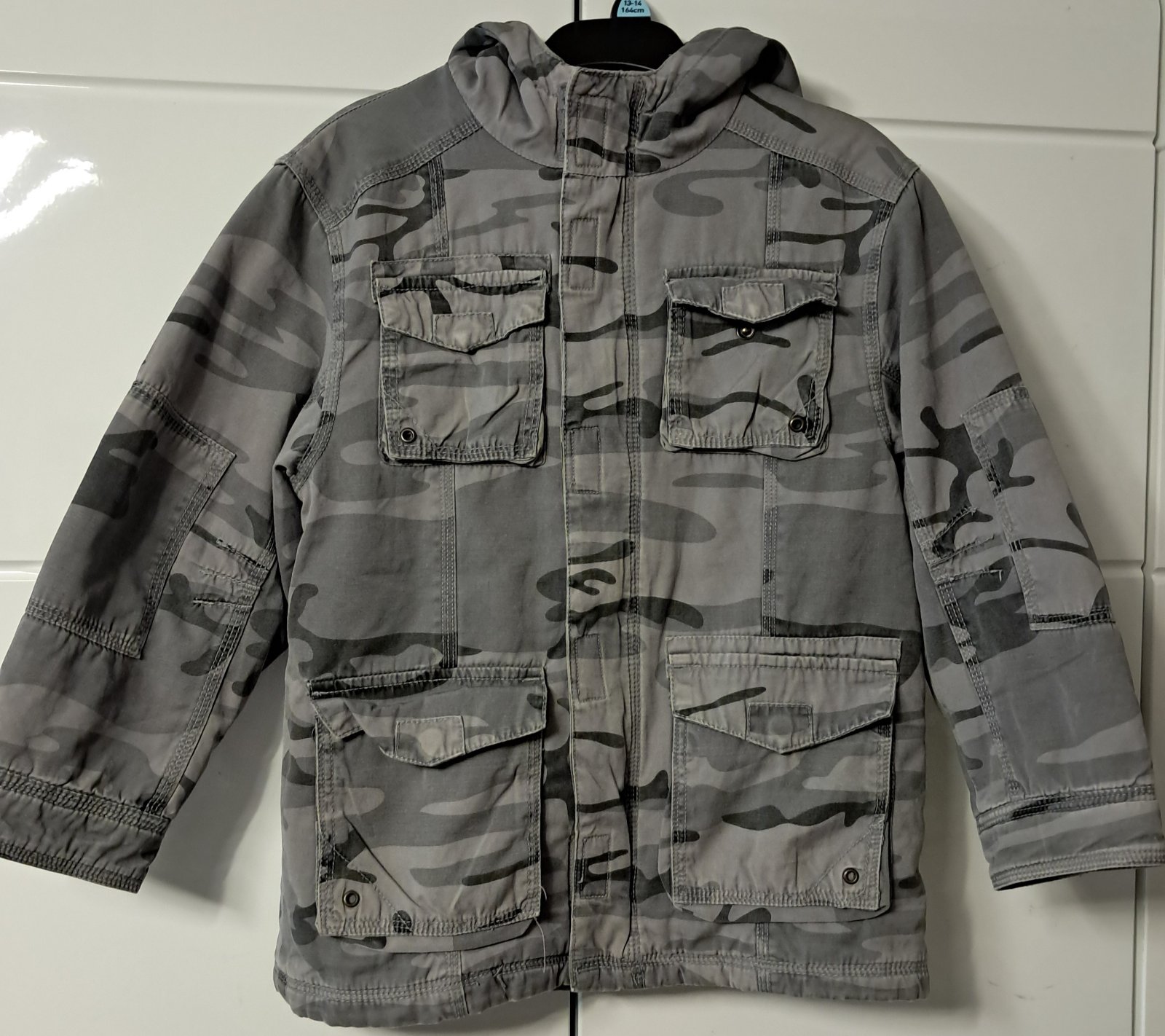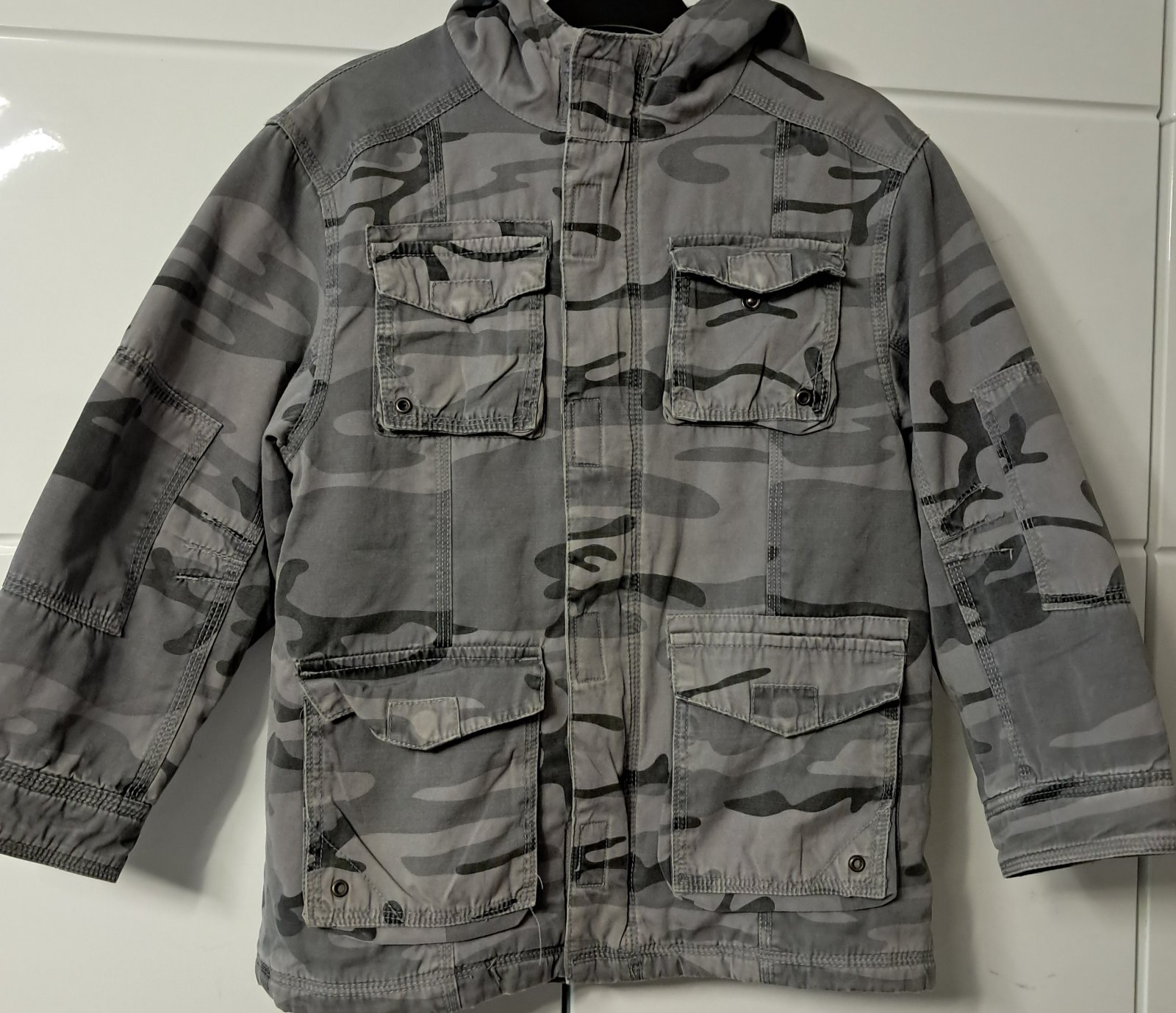 Veľmi pekná vetrovka, maskáčová, s kapucňou,futrovaná,výborný stav, veľkosť uvedená na 8 rokov
