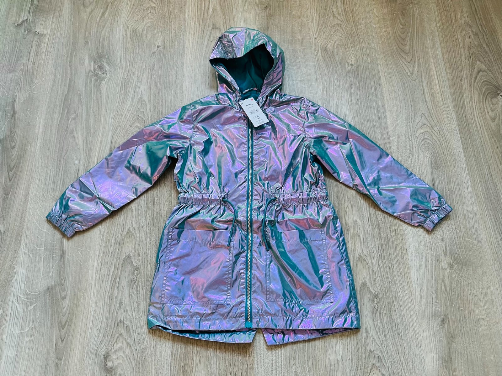 Nová krásna holografická, v skutočnosti krajšia, ako na fotke bunda. Pôvodná cena je 14,99 €.